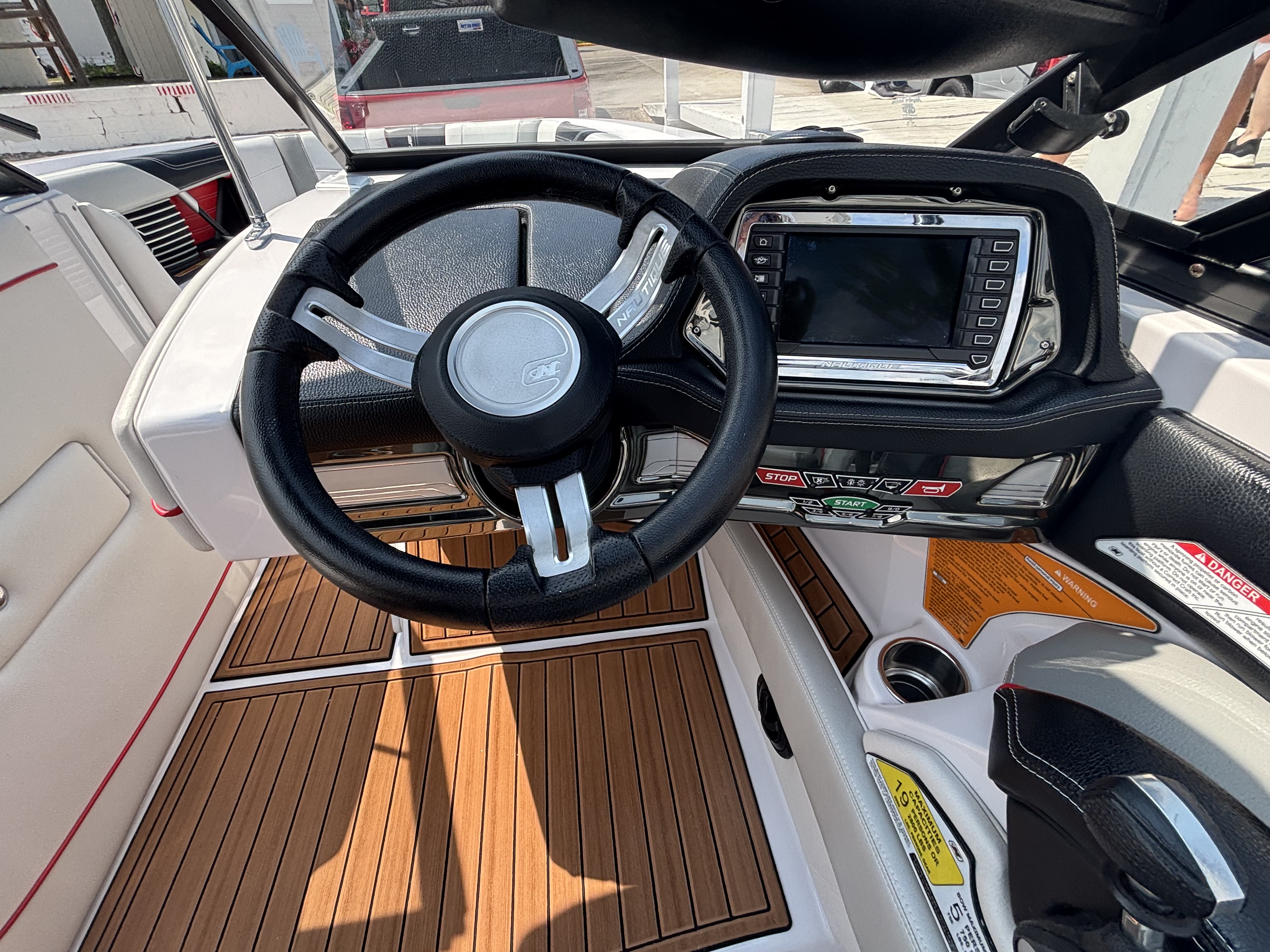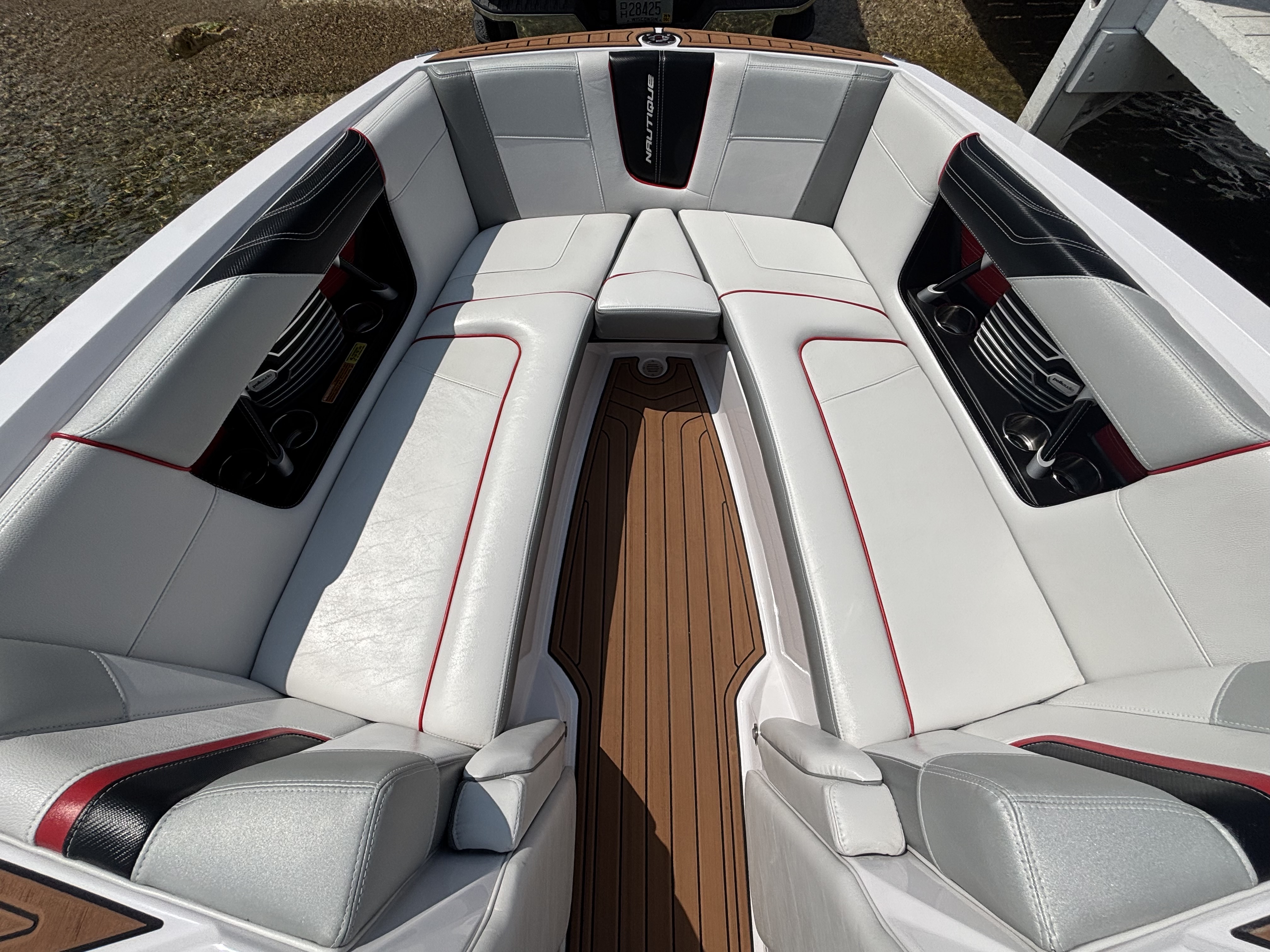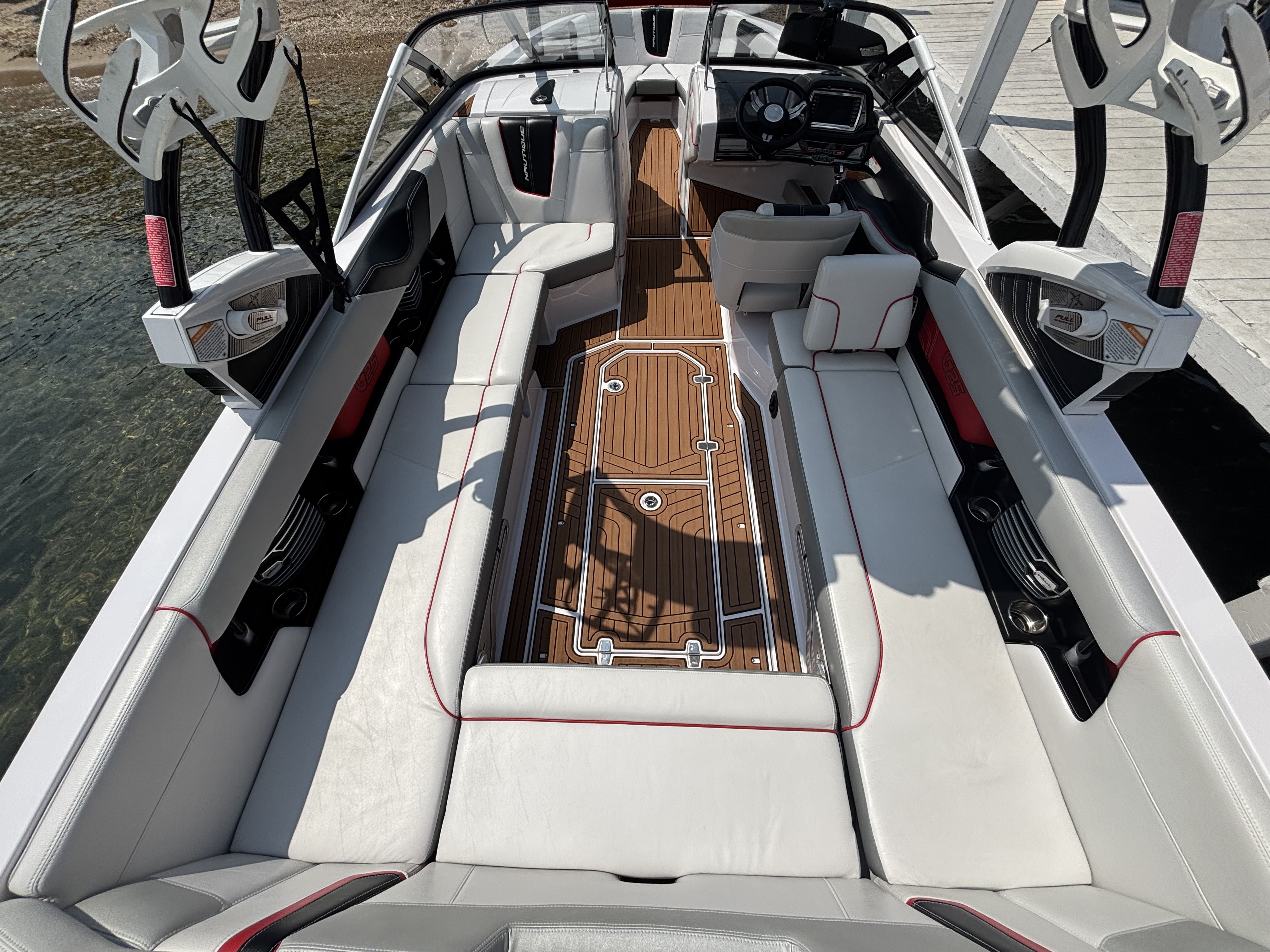 Designed around Nautique’s iconic 25-foot G-Series hull, this boat throws legendary wakes and surf waves—clean, powerful, and endlessly adjustable—making it a favorite among advanced riders and pros alike. The spacious layout offers abundant seating, premium upholstery, and luxury fit-and-finish that Nautique is known for, giving everyone on board first-class comfort between sets.