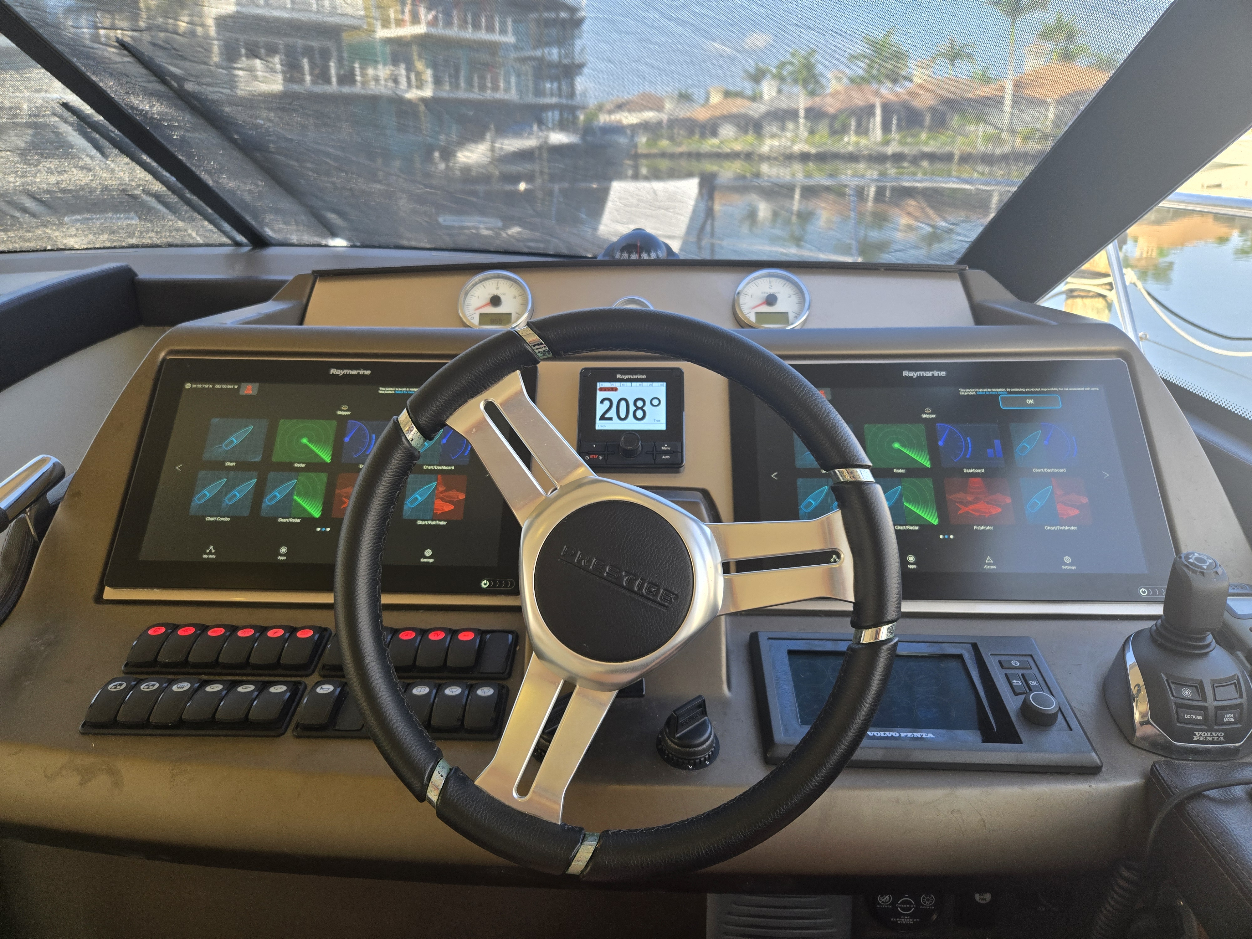 Above deck, expansive lounging areas—including a teak-decked cockpit and sun-soaked flybridge—invite you to unwind or entertain in style. Inside, panoramic windows bathe the salon in natural light, accentuating refined finishes, plush seating, and a gourmet galley positioned for seamless indoor-outdoor flow. Equipped with twin Volvo IPS 600 engines and joystick controls, the Prestige 500 ensures effortless handling and a quiet, fuel-efficient ride.