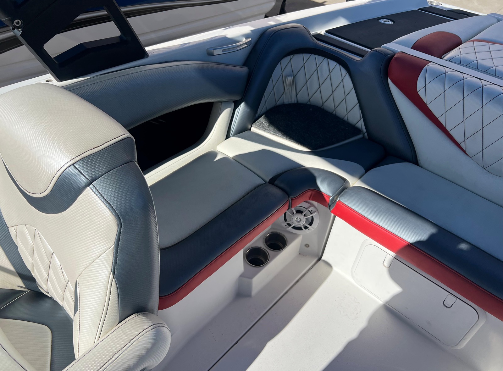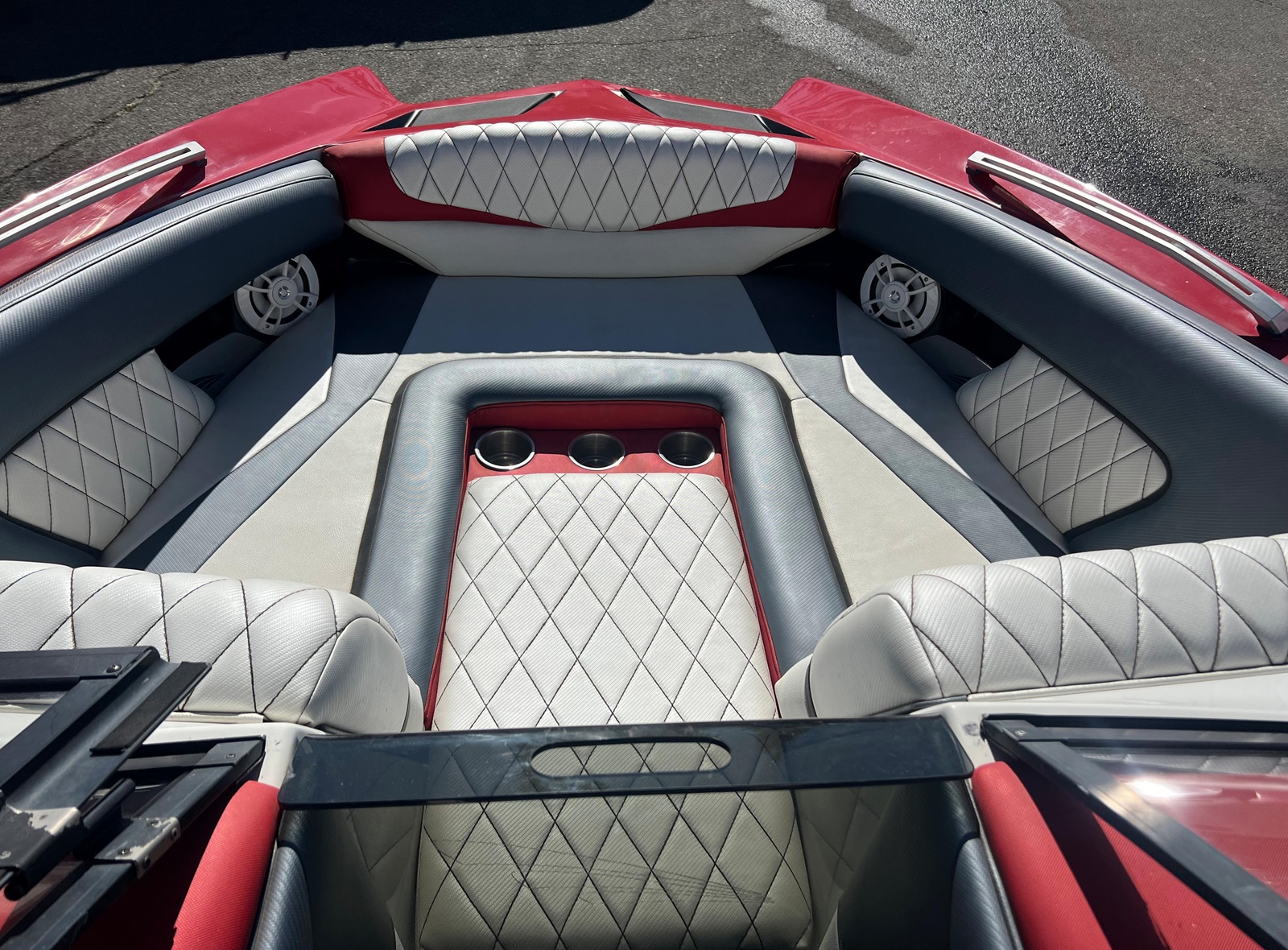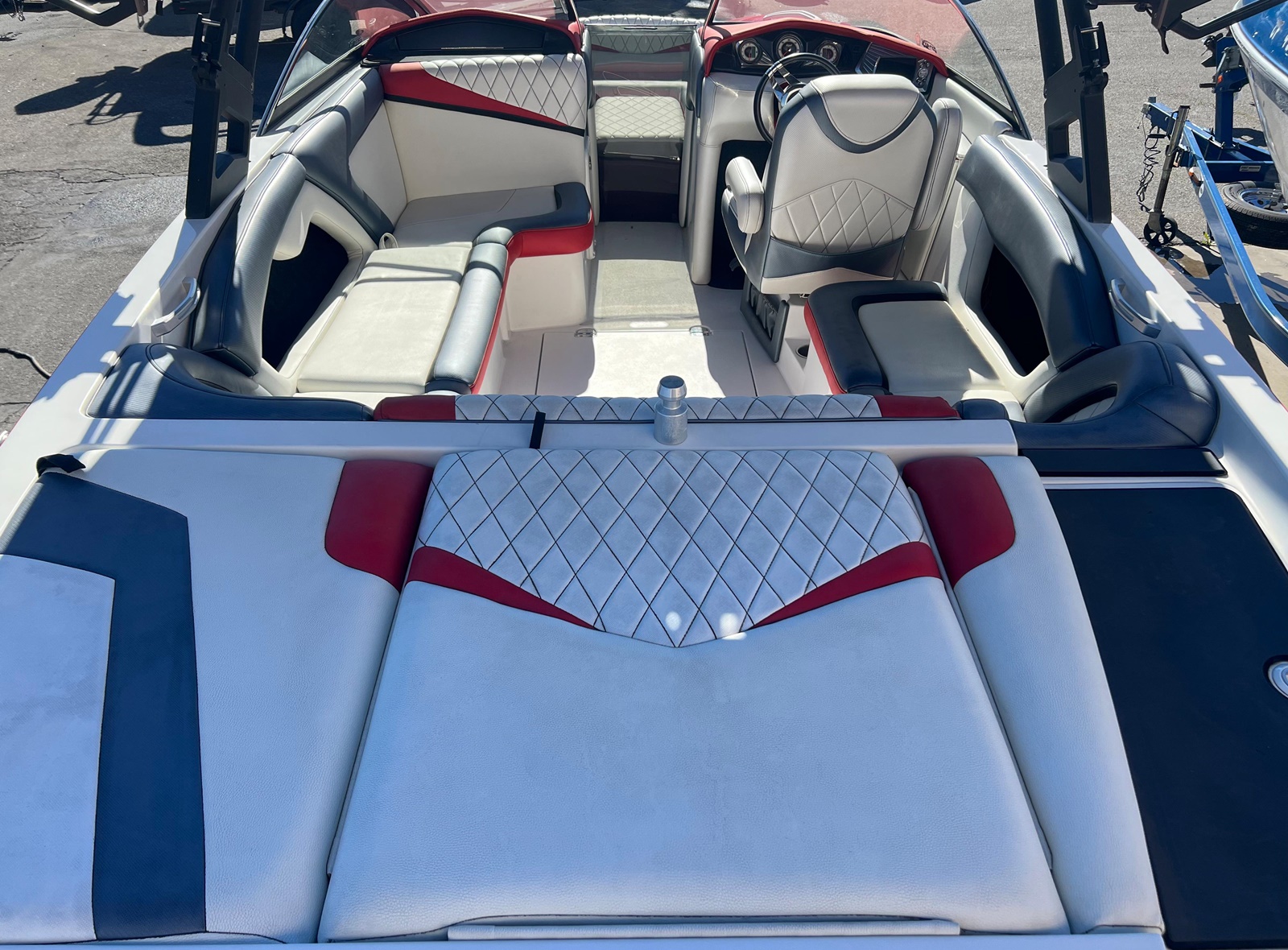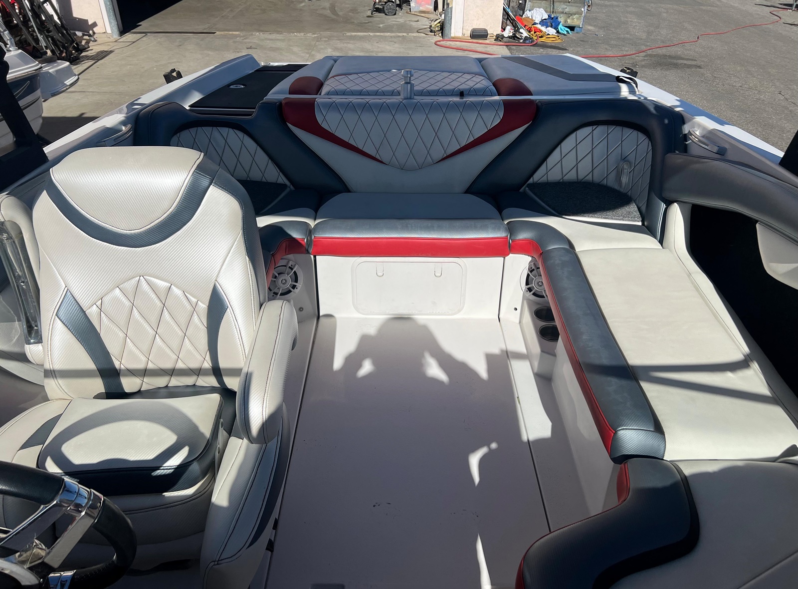 Wake Board Tower With Bimini Top, Stereo, Depth Sounder, Fuel Injection, Docking Lights, Dual Batteries, Cruise Control, Water Ballast System, Drivers Bucket Seat, U Shaped Rear Seating, Tilt Wheel, Open Bow Seating, Bow Filler Cushion, Pop Up Cleats, Motor Box Sun Pad, 12 V Plug and more.