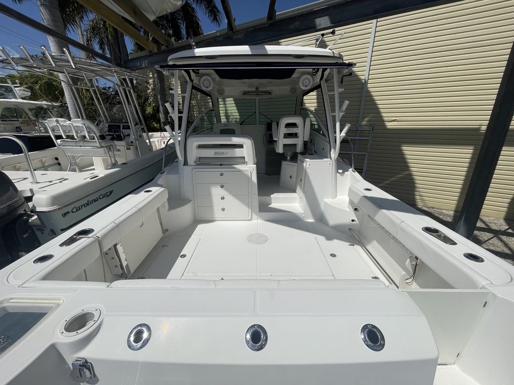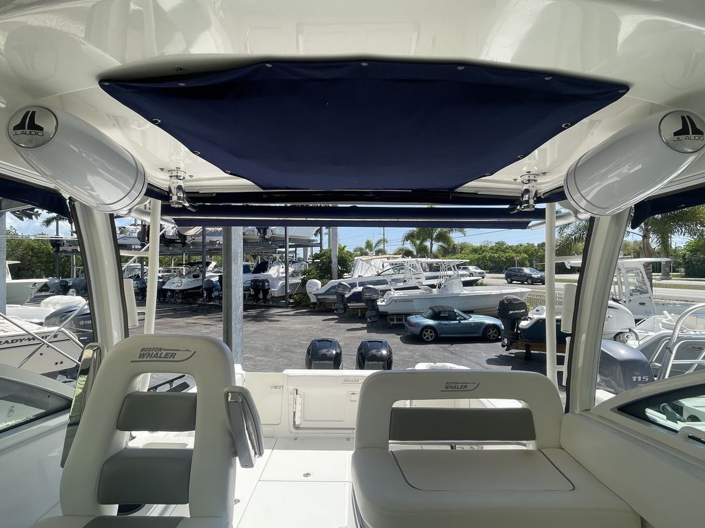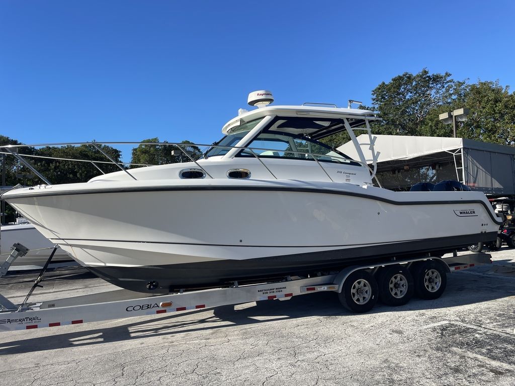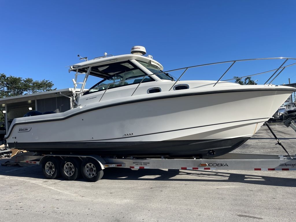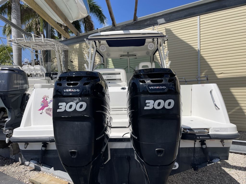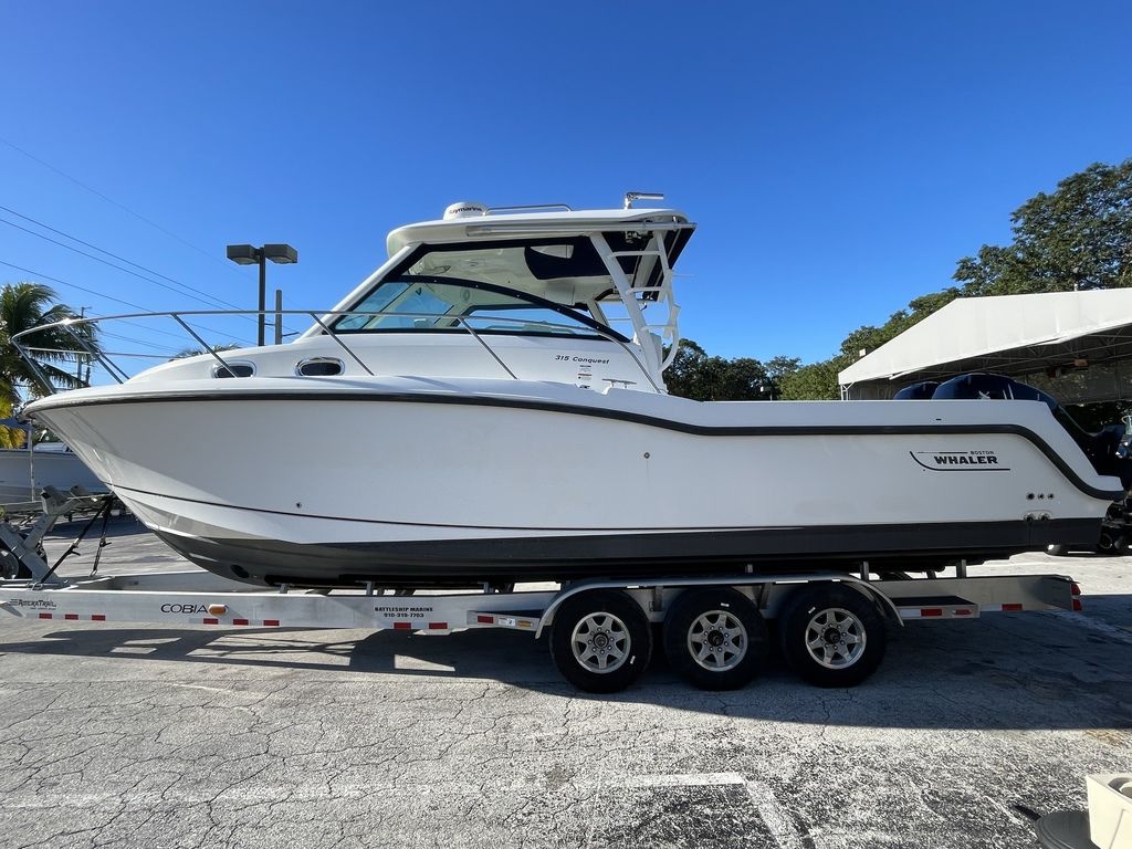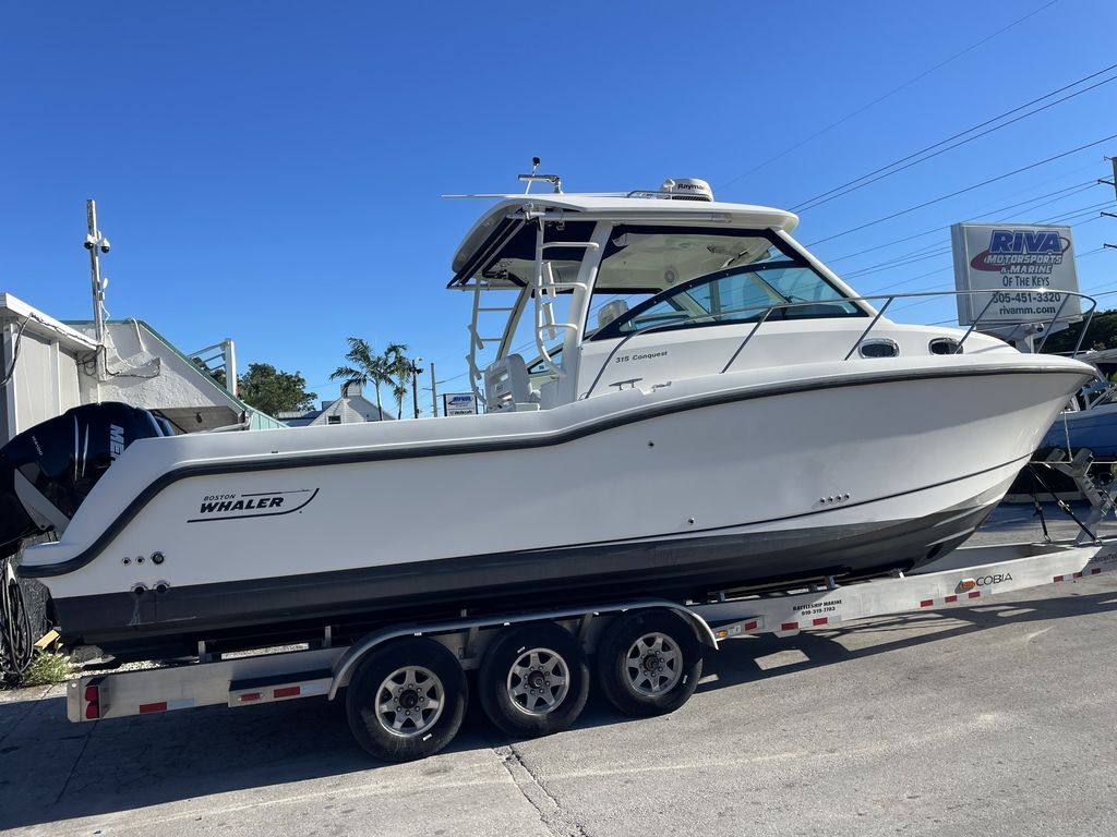 Pre-Owned 2014 Boston Whaler 315 Conquest for sale with twin 300hp Mercury Verado's at RIVA Motorsports & Marine Florida KeysCLEAN!