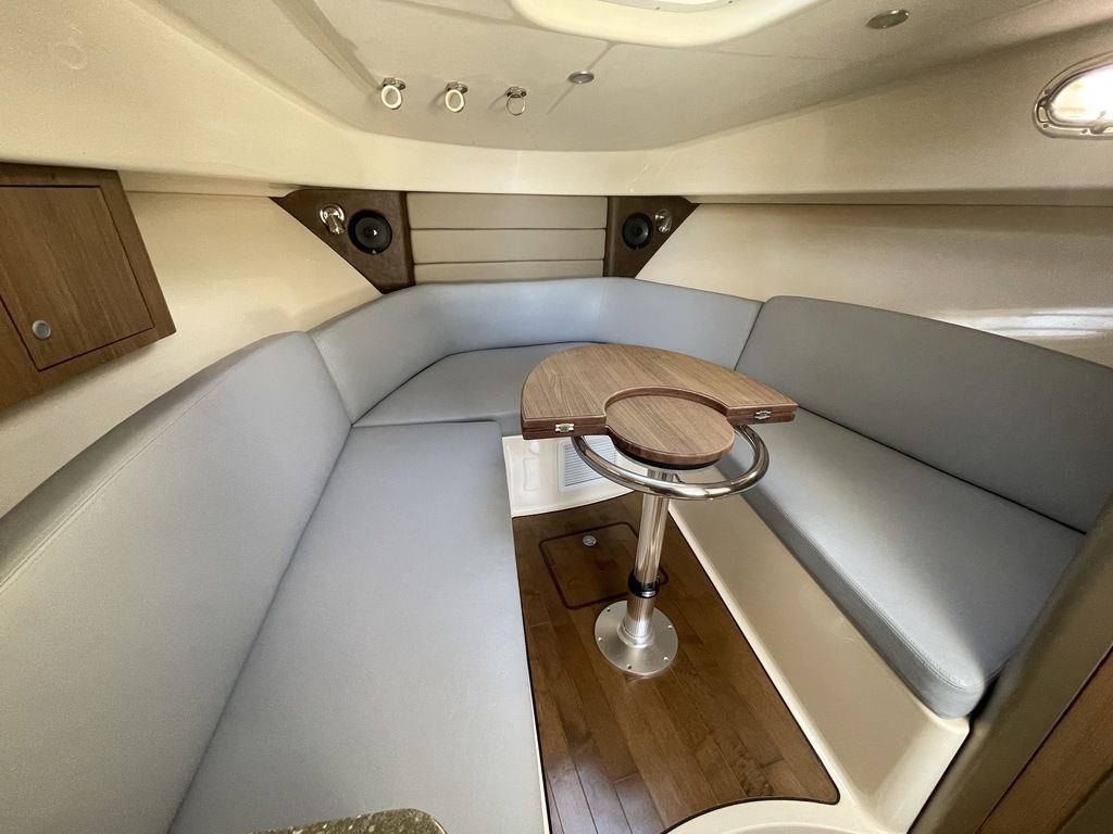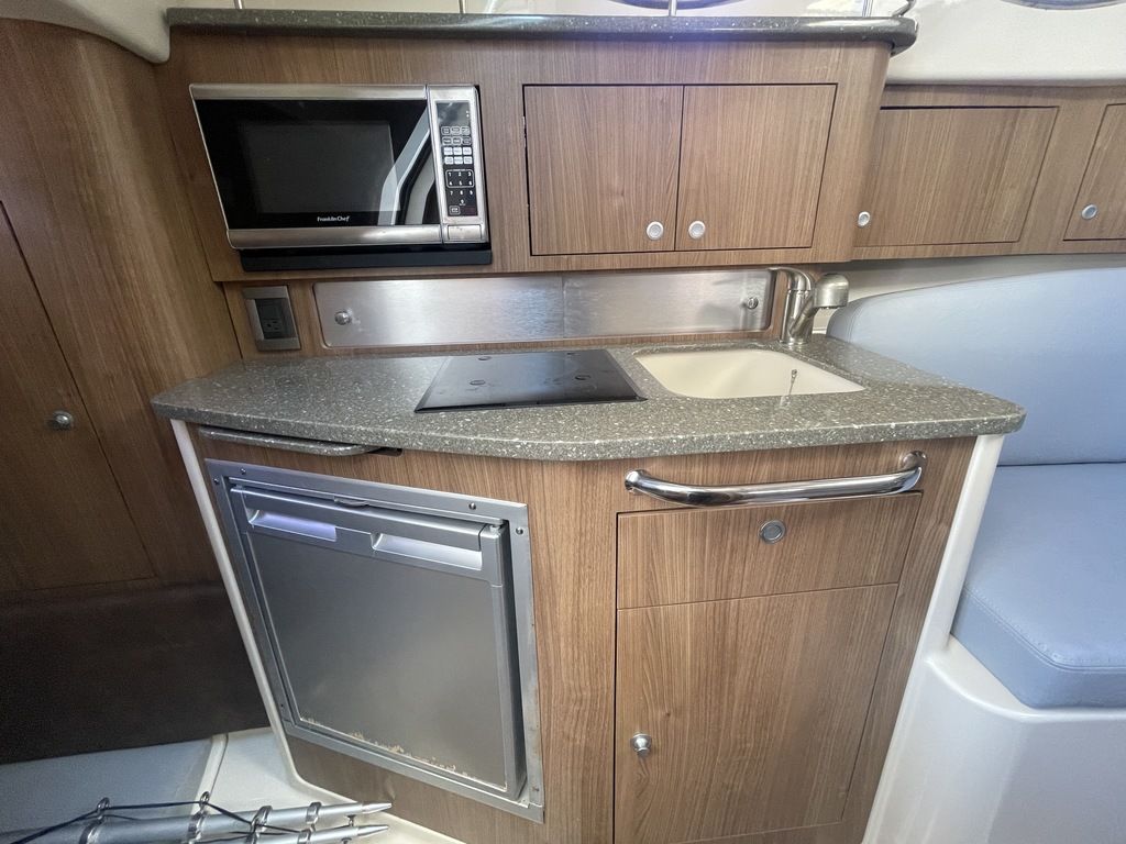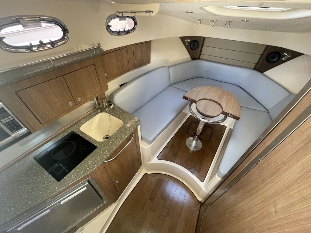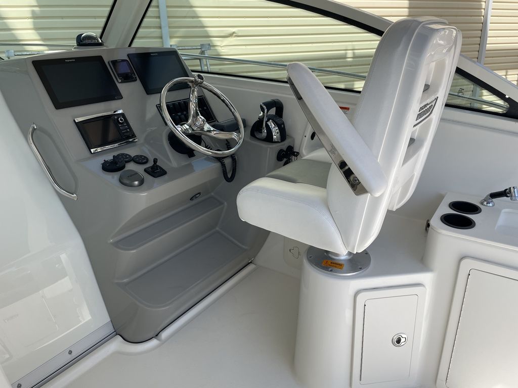 The boat's cabin features yacht-quality interior styling, including a skylight over the galley, and an expanded mid-berth with improved headroom and flexibility for bringing on extra family members and friends. Master the offshore with the power and fishability of the 315 Conquest.