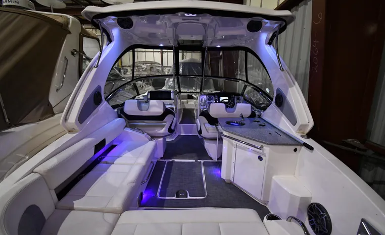 Freshwater since new this vessel features Twin MerCruiser 350-Mag 300-hp Gas Engine's (Note DTS w/Joy-Stick Piloting) with Bravo III Sterndrives and only 400 original hours. Notable features include but are not limited to the following: Air-Conditioning & Heat (1-Unit), Head (Vacuflush) w/Vanity/Sink, Windlass Anchor w/Polished Stainless-Steel Anchor / Forward Pedal-Controls, Westerbeke 5kw Generator, Garmin GPSMAP 942XS (Color / TouchScreen) GPS/Chartplotter, Fusion Apollo Premium Sound System w/Bluetooth (w/AMP / Subwoofer), Cockpit Wet Bar w/Sink/Beverage-Refrigerator, Cockpit Television, and MUCH more!