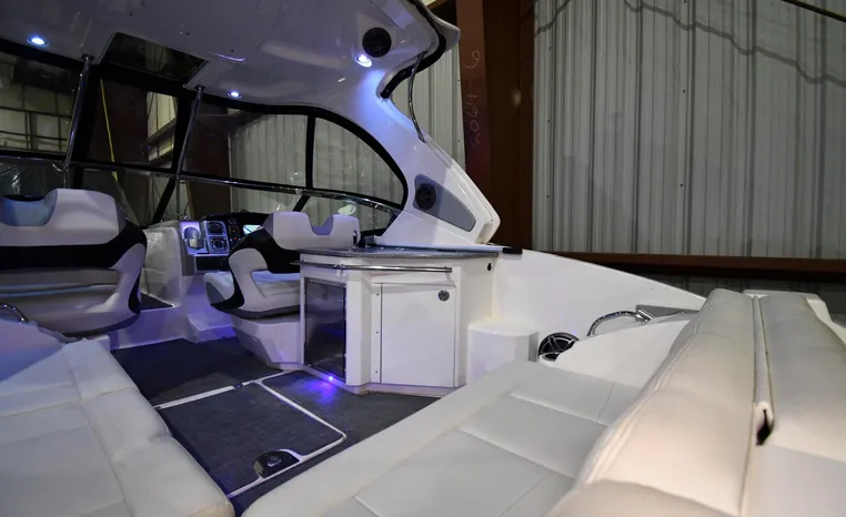 Freshwater since new this vessel features Twin MerCruiser 350-Mag 300-hp Gas Engine's (Note DTS w/Joy-Stick Piloting) with Bravo III Sterndrives and only 400 original hours. Notable features include but are not limited to the following: Air-Conditioning & Heat (1-Unit), Head (Vacuflush) w/Vanity/Sink, Windlass Anchor w/Polished Stainless-Steel Anchor / Forward Pedal-Controls, Westerbeke 5kw Generator, Garmin GPSMAP 942XS (Color / TouchScreen) GPS/Chartplotter, Fusion Apollo Premium Sound System w/Bluetooth (w/AMP / Subwoofer), Cockpit Wet Bar w/Sink/Beverage-Refrigerator, Cockpit Television, and MUCH more!