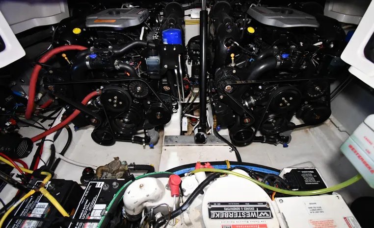 Freshwater since new this vessel features Twin MerCruiser 350-Mag 300-hp Gas Engine's (Note DTS w/Joy-Stick Piloting) with Bravo III Sterndrives and only 400 original hours. Notable features include but are not limited to the following: Air-Conditioning & Heat (1-Unit), Head (Vacuflush) w/Vanity/Sink, Windlass Anchor w/Polished Stainless-Steel Anchor / Forward Pedal-Controls, Westerbeke 5kw Generator, Garmin GPSMAP 942XS (Color / TouchScreen) GPS/Chartplotter, Fusion Apollo Premium Sound System w/Bluetooth (w/AMP / Subwoofer), Cockpit Wet Bar w/Sink/Beverage-Refrigerator, Cockpit Television, and MUCH more!
