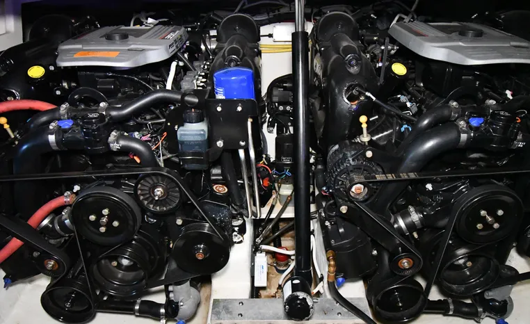 Freshwater since new this vessel features Twin MerCruiser 350-Mag 300-hp Gas Engine's (Note DTS w/Joy-Stick Piloting) with Bravo III Sterndrives and only 400 original hours. Notable features include but are not limited to the following: Air-Conditioning & Heat (1-Unit), Head (Vacuflush) w/Vanity/Sink, Windlass Anchor w/Polished Stainless-Steel Anchor / Forward Pedal-Controls, Westerbeke 5kw Generator, Garmin GPSMAP 942XS (Color / TouchScreen) GPS/Chartplotter, Fusion Apollo Premium Sound System w/Bluetooth (w/AMP / Subwoofer), Cockpit Wet Bar w/Sink/Beverage-Refrigerator, Cockpit Television, and MUCH more!
