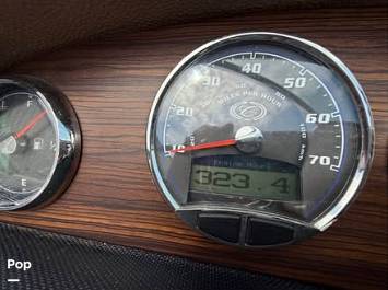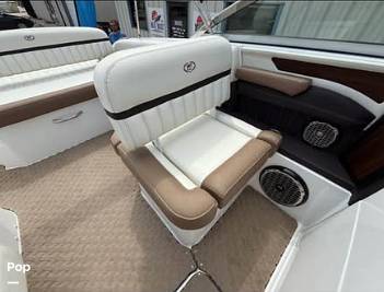 Key features include a wet bar with a refrigerator, a flip-down swim step, and a Garmin chart plotter/fish finder, making it a versatile and well-equipped boat.