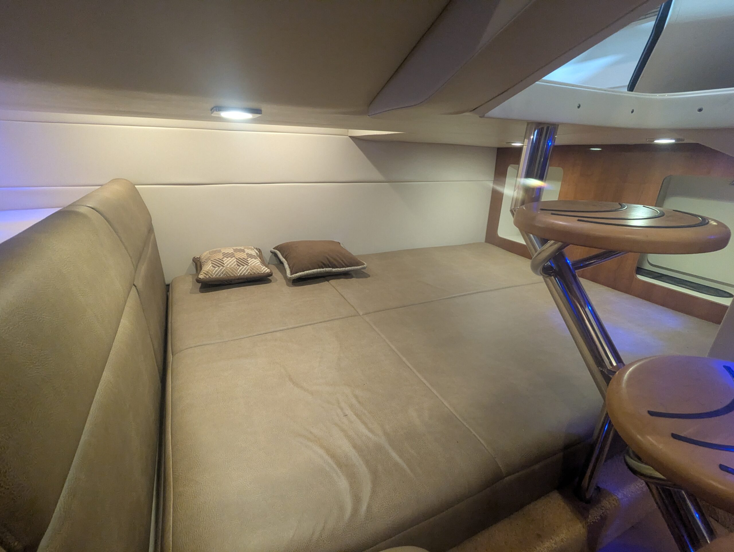 A roomy portside lounge along with the U-shaped lounge aft expand the comfortable, spacious seating, while the dual-height tables and filler cushions adapt to fit various on-water activities you and your guests may choose. The bow of the boat is a seamless transition from the cockpit with a flush floor all the way to the bow. Seating is plentiful, yet convertible to a spacious sun lounge with a double-wide lounge seat to starboard, two dual height tables and wrap-around seating with filler cushions. A comfortable armrest on the starboard folds up when not in use.