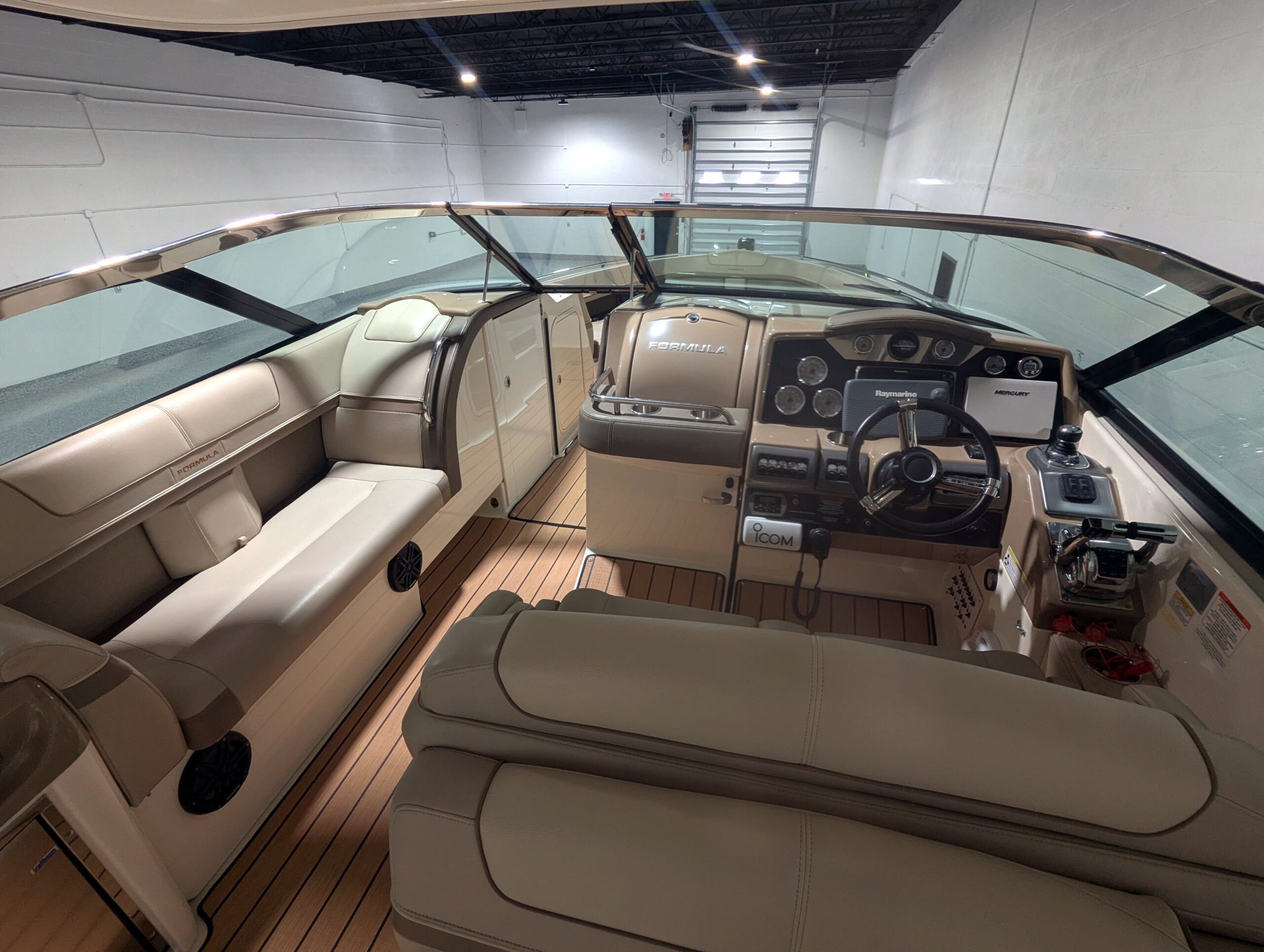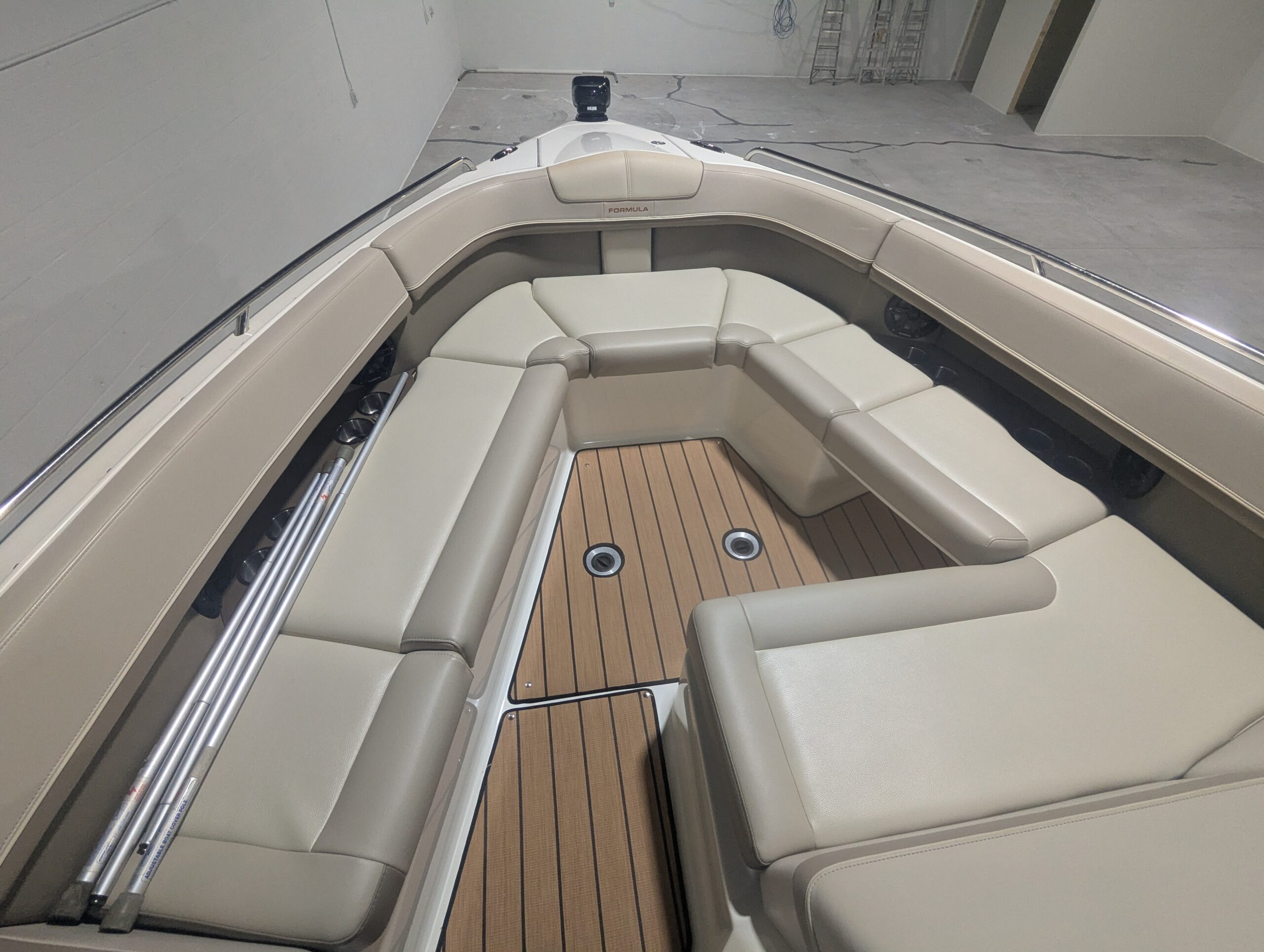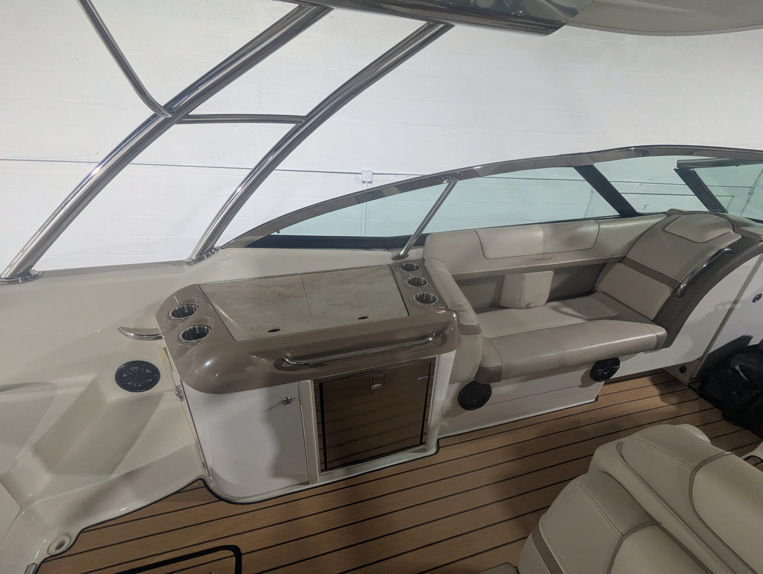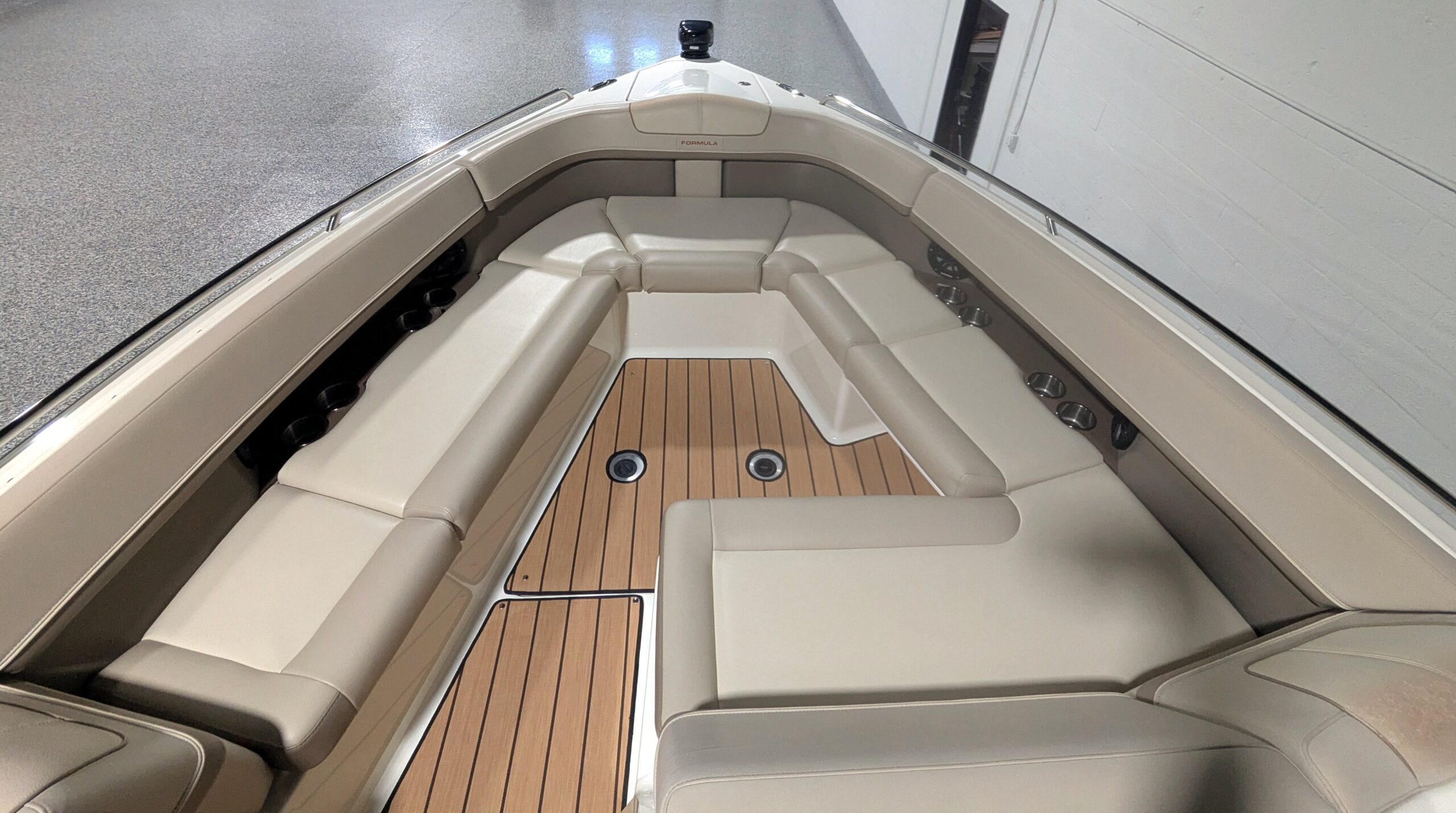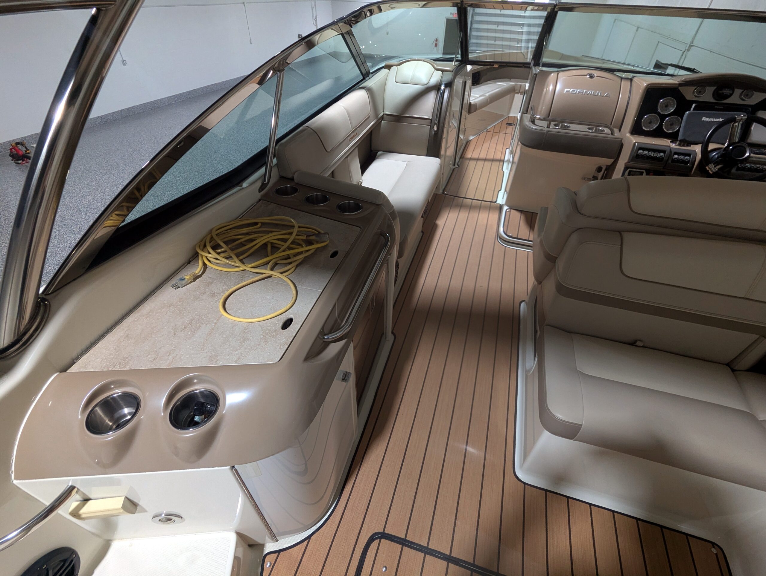 Entering the cabin through the centerline door at the helm, three solid wood steps lead down to reveal woodgrain-finish flooring and a full 5’10” of headroom. The doublewide lounge, cedar-lined hanging locker and AM/FM/CD stereo changer are to starboard. The cabin features a mini galley at centerline, similar to a private aircraft, with a microwave, neatly concealed sink and a pull-out stainless steel refrigerator. A full bank of galley drawers, storage cupboard with wastebasket and paper towel holder and an optional HDTV. The spacious head features a molded vanity with Corian® countertop, sink, shower and Vacuflush head unit, plus plenty of storage. Through the clever utilization of space only Formula’s unique Crossover Bowrider layout provides, a full-size double berth with Sensus® memory foam mattress is located aft, so there is no need to convert a lounge for sleeping. The cabin is perfect for overnight trips or taking a break from the sun, with room to stretch out and relax.
