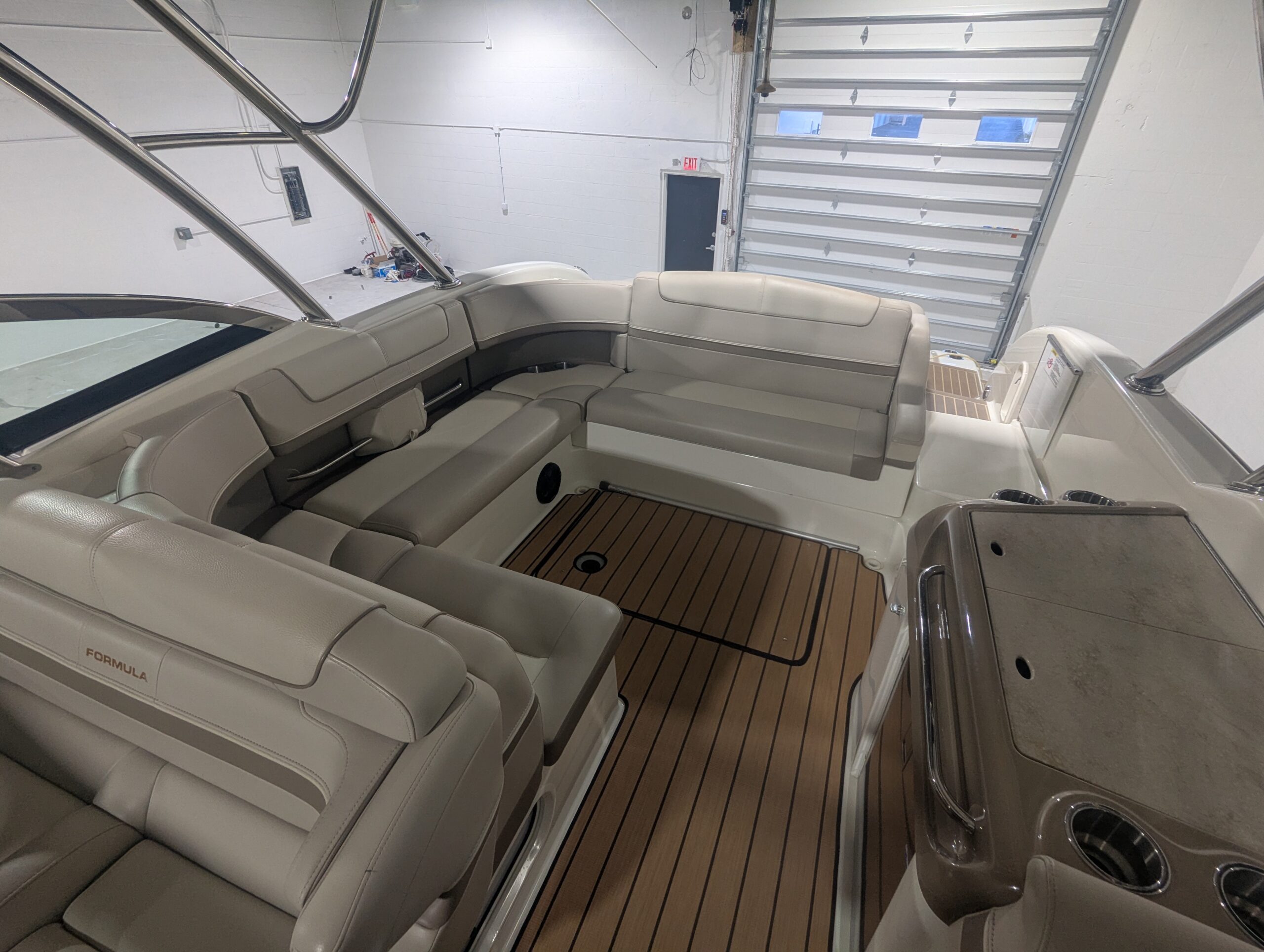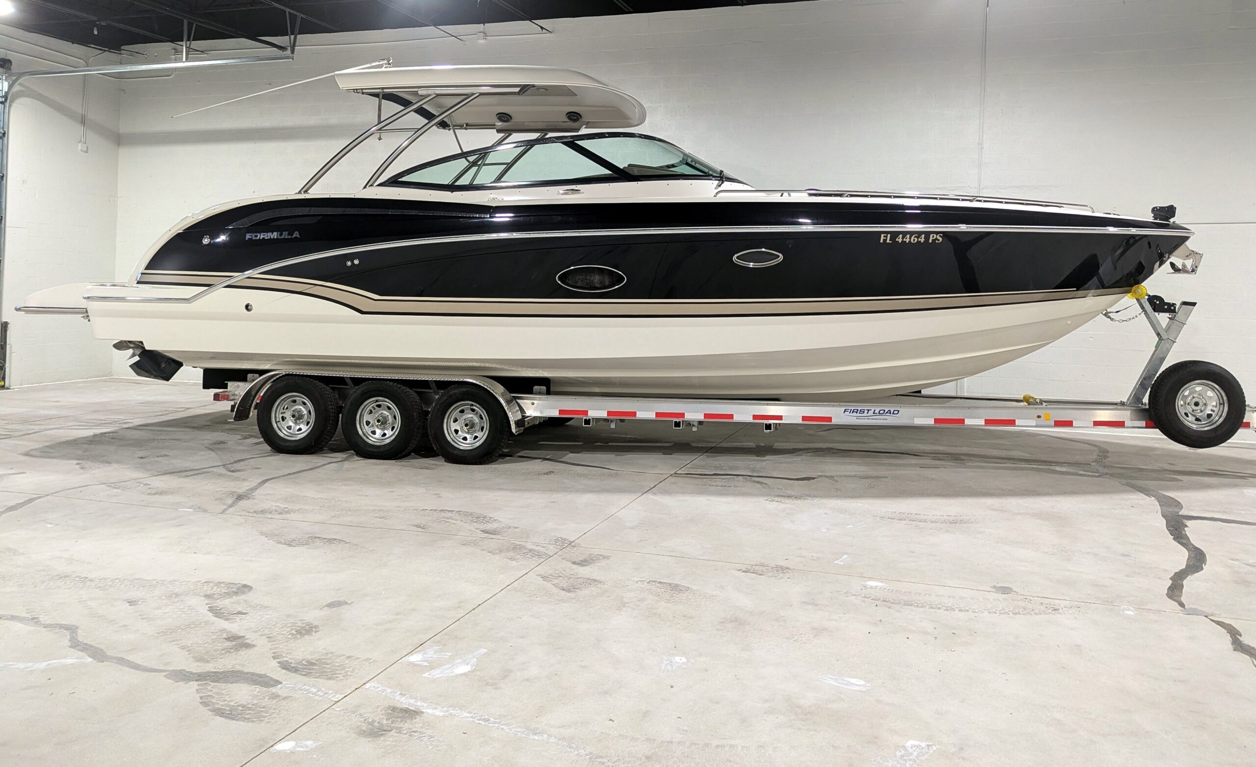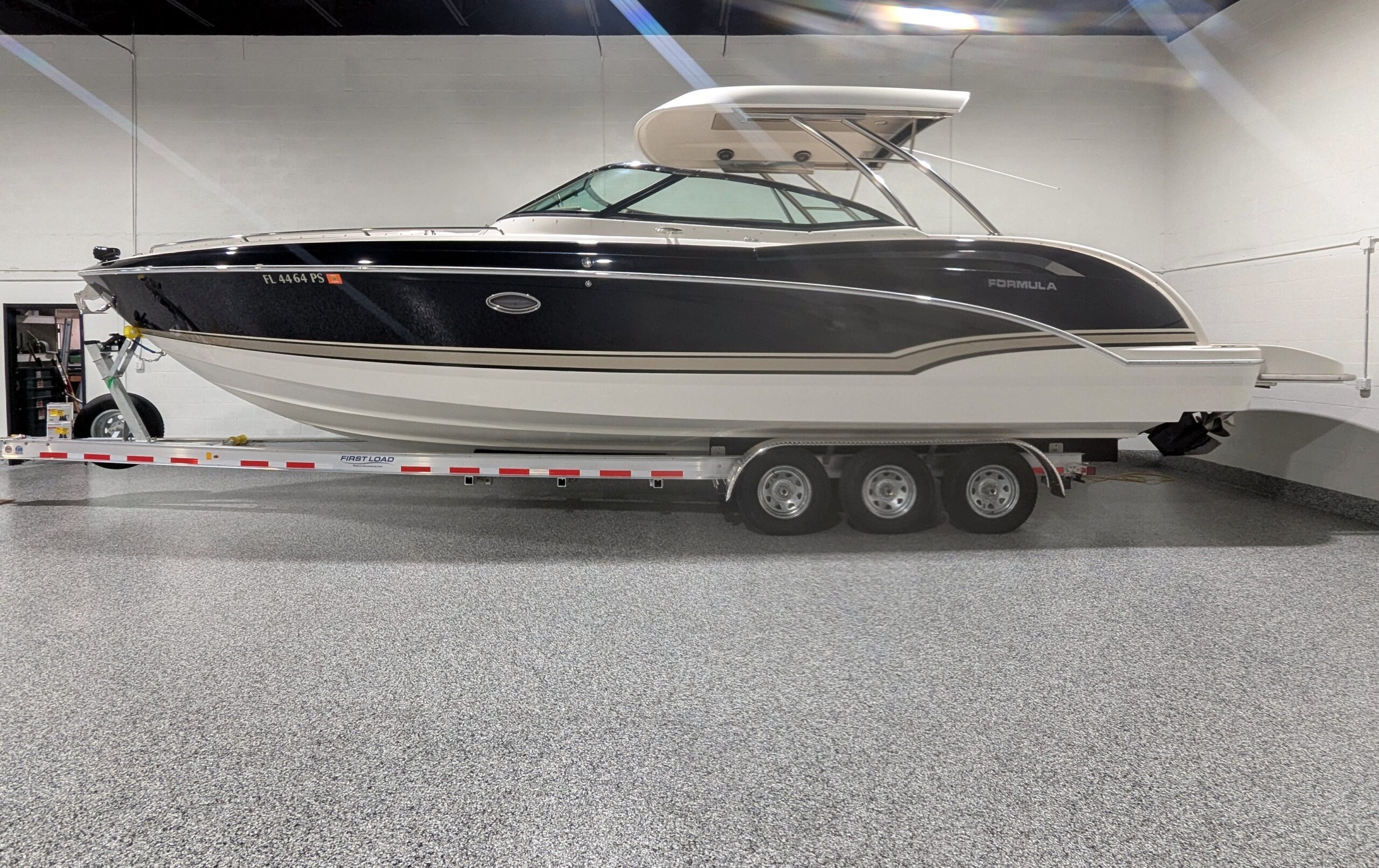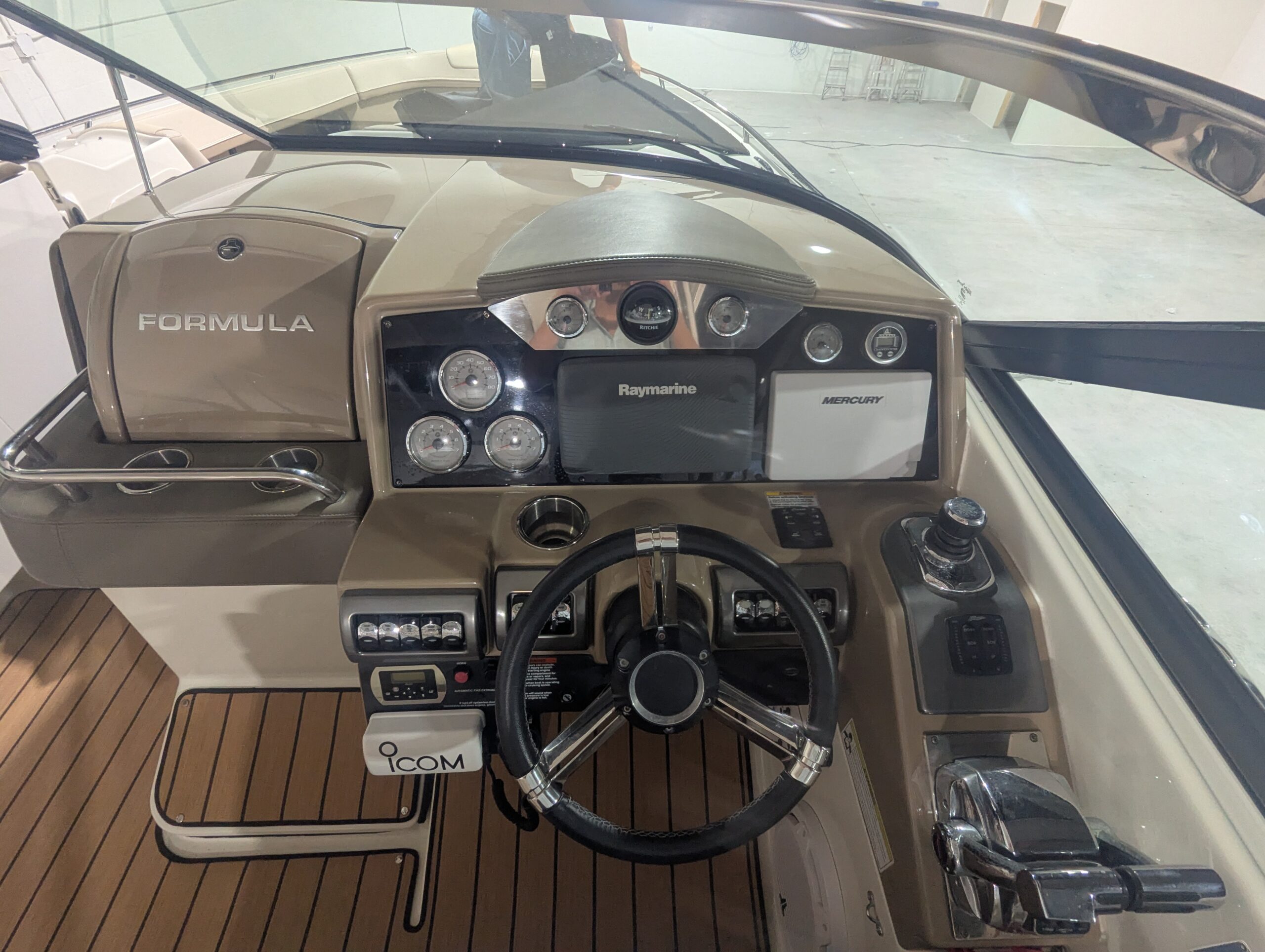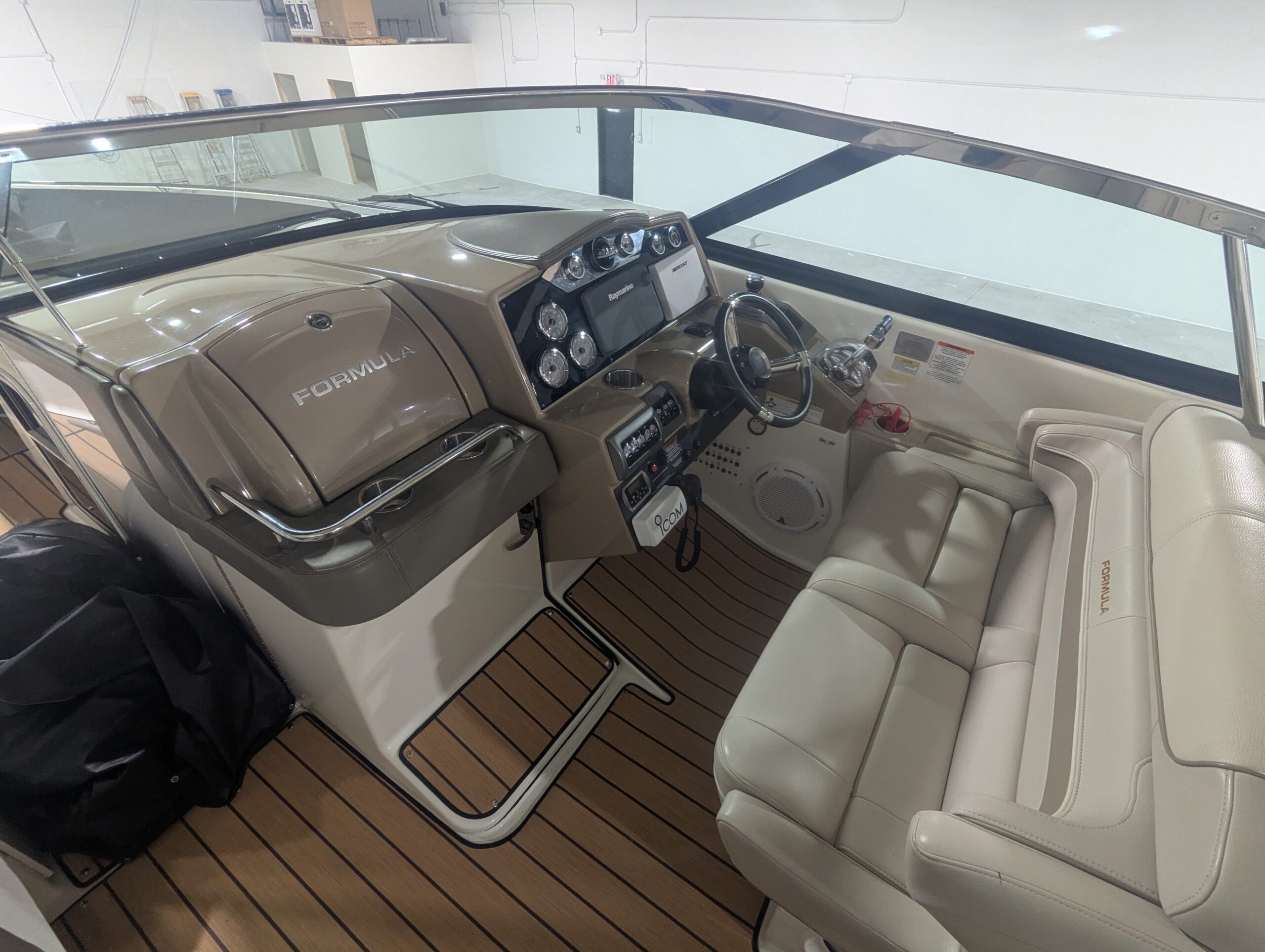 Entering the cabin through the centerline door at the helm, three solid wood steps lead down to reveal woodgrain-finish flooring and a full 5’10” of headroom. The doublewide lounge, cedar-lined hanging locker and AM/FM/CD stereo changer are to starboard. The cabin features a mini galley at centerline, similar to a private aircraft, with a microwave, neatly concealed sink and a pull-out stainless steel refrigerator. A full bank of galley drawers, storage cupboard with wastebasket and paper towel holder and an optional HDTV. The spacious head features a molded vanity with Corian® countertop, sink, shower and Vacuflush head unit, plus plenty of storage. Through the clever utilization of space only Formula’s unique Crossover Bowrider layout provides, a full-size double berth with Sensus® memory foam mattress is located aft, so there is no need to convert a lounge for sleeping. The cabin is perfect for overnight trips or taking a break from the sun, with room to stretch out and relax.