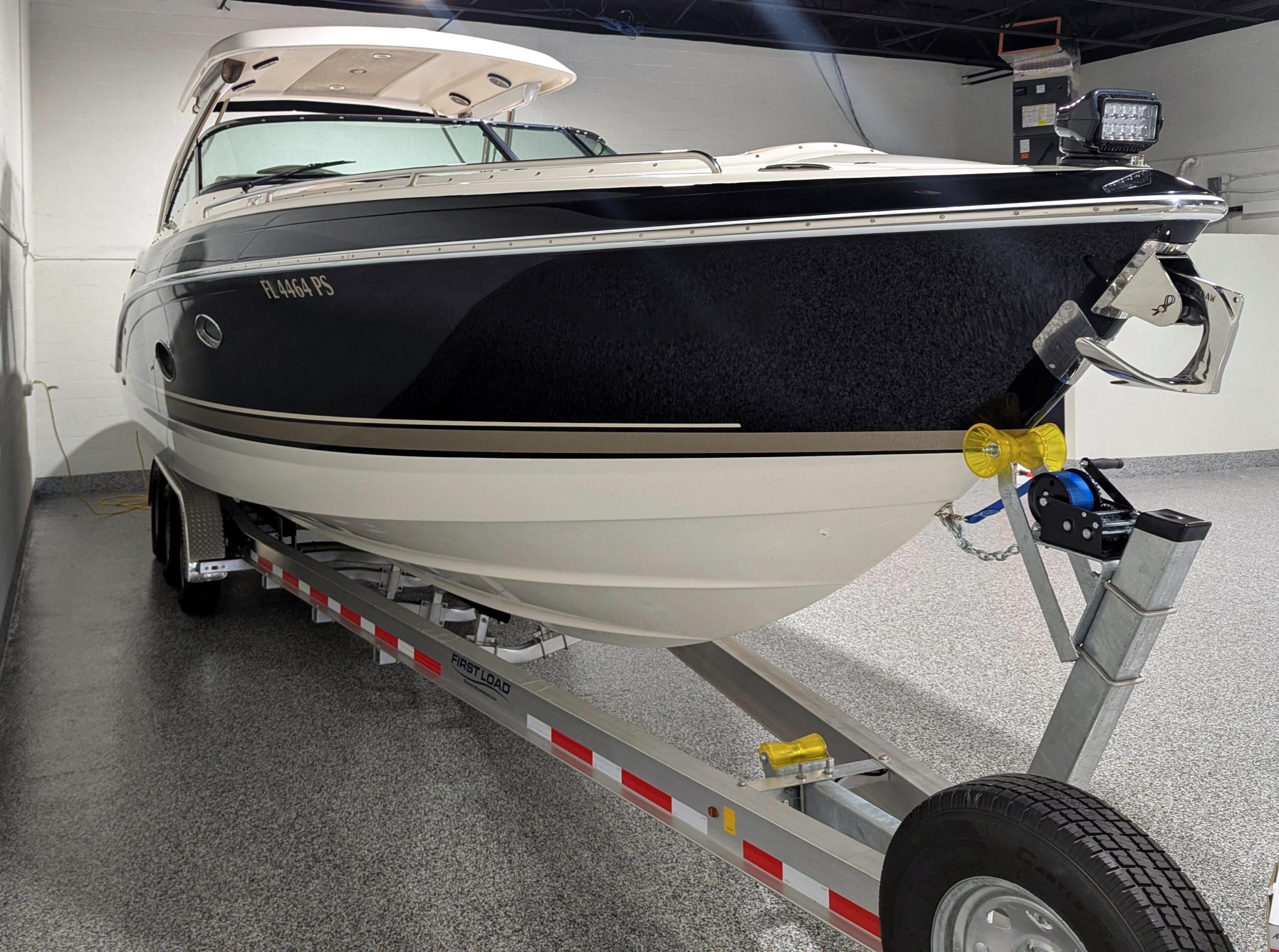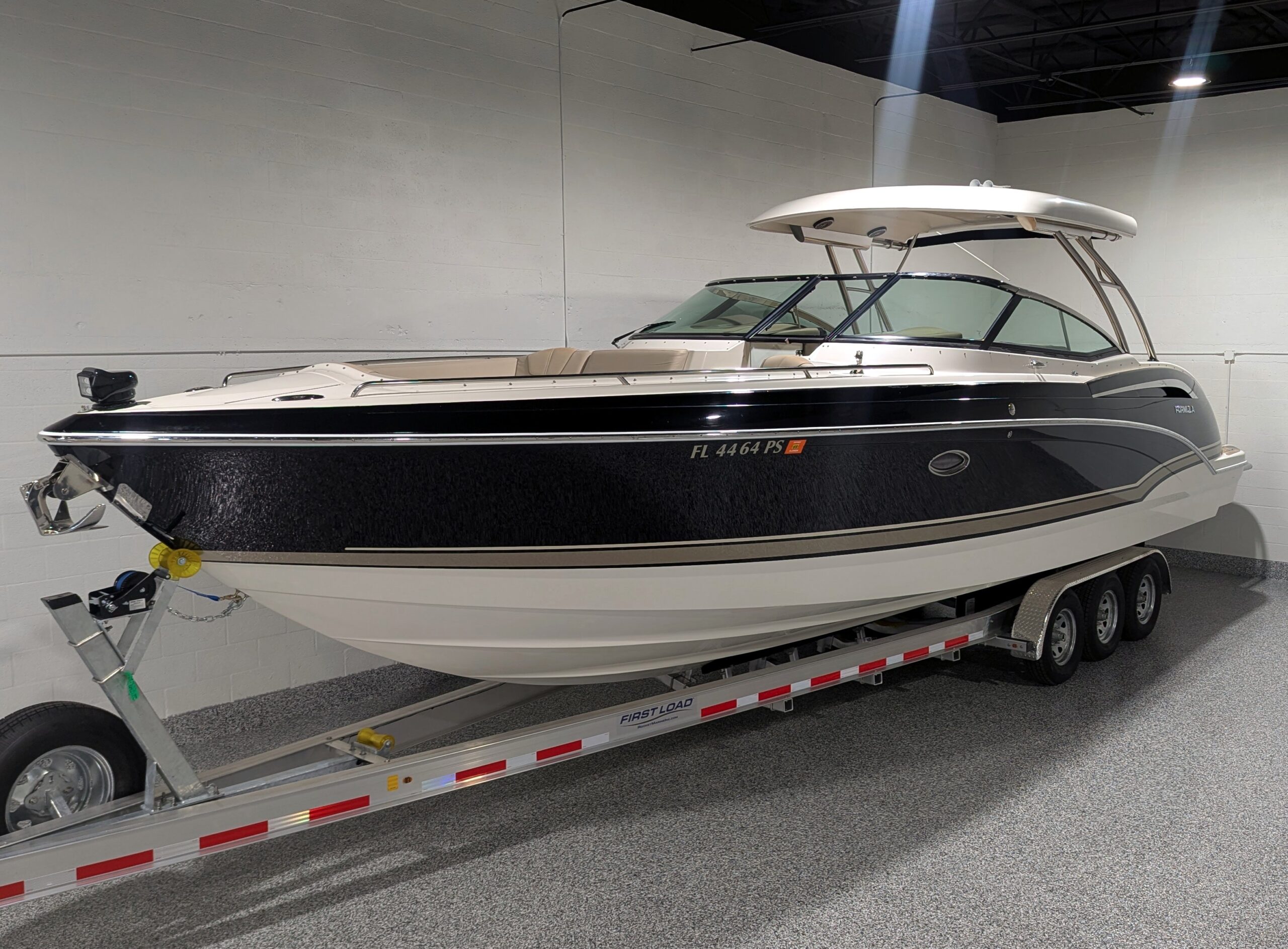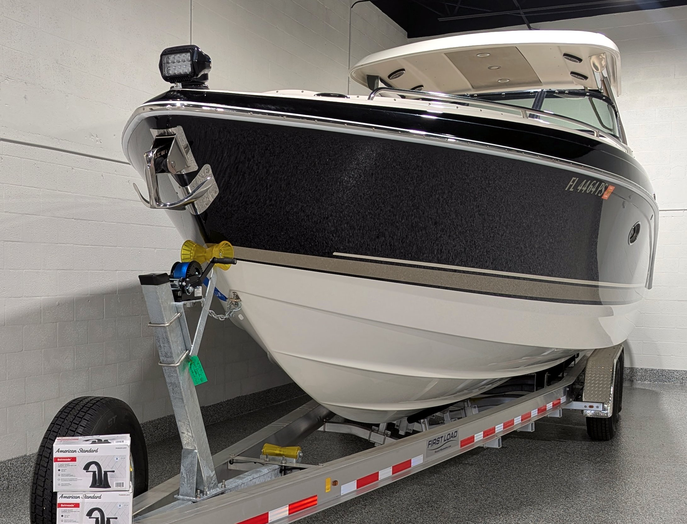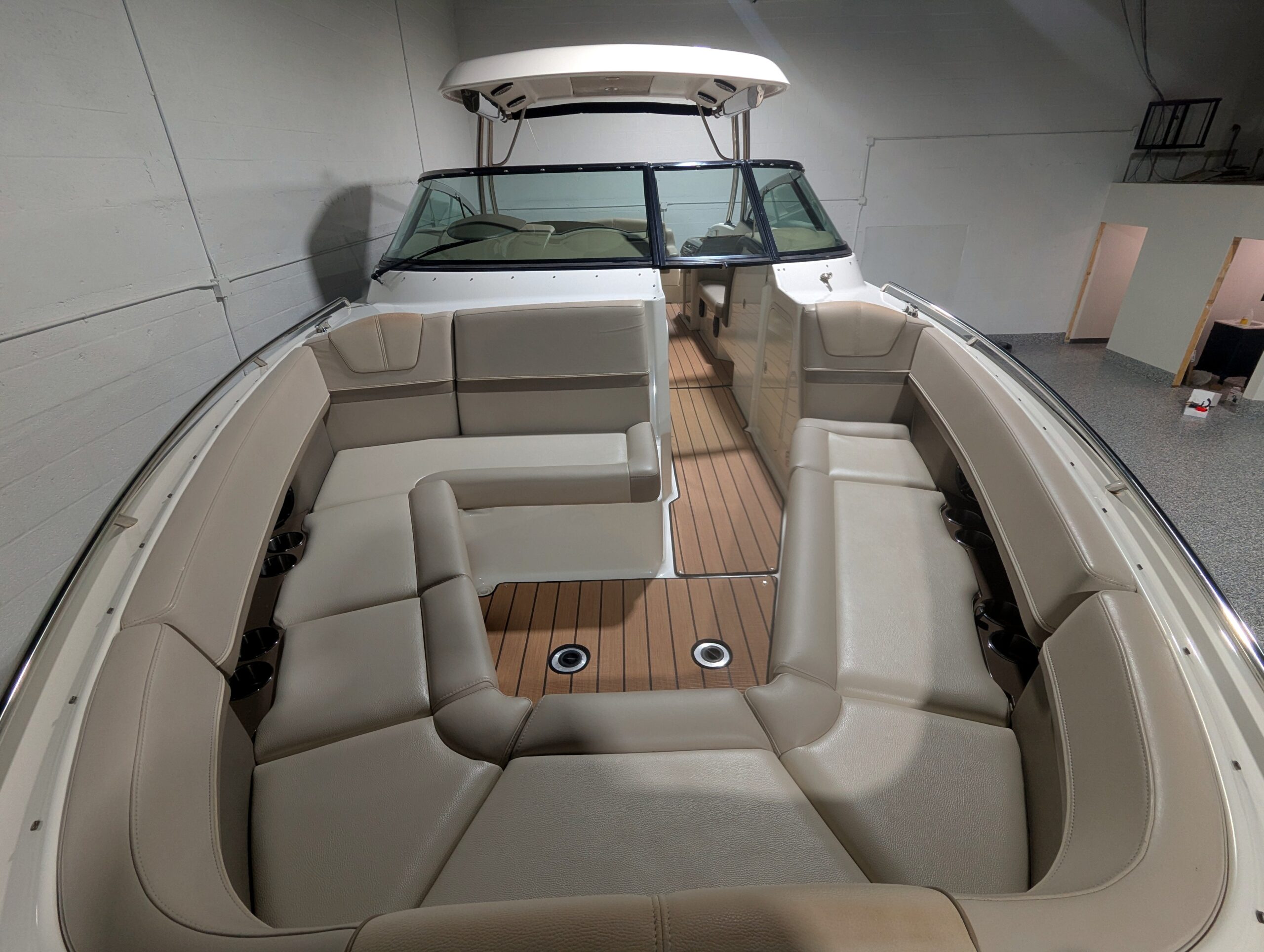 The rear-facing convertible aft sun lounge also adds to the sunning space and overlooks the extended swim platform. An all-new extended water-sport swim platform with four drink holders optional. A starboard side trunk, along with storage under the aft lounge, store boating necessities plus extras for a full day on the water. Blue/white LED lighting is standard on the swim platform and in the cockpit.