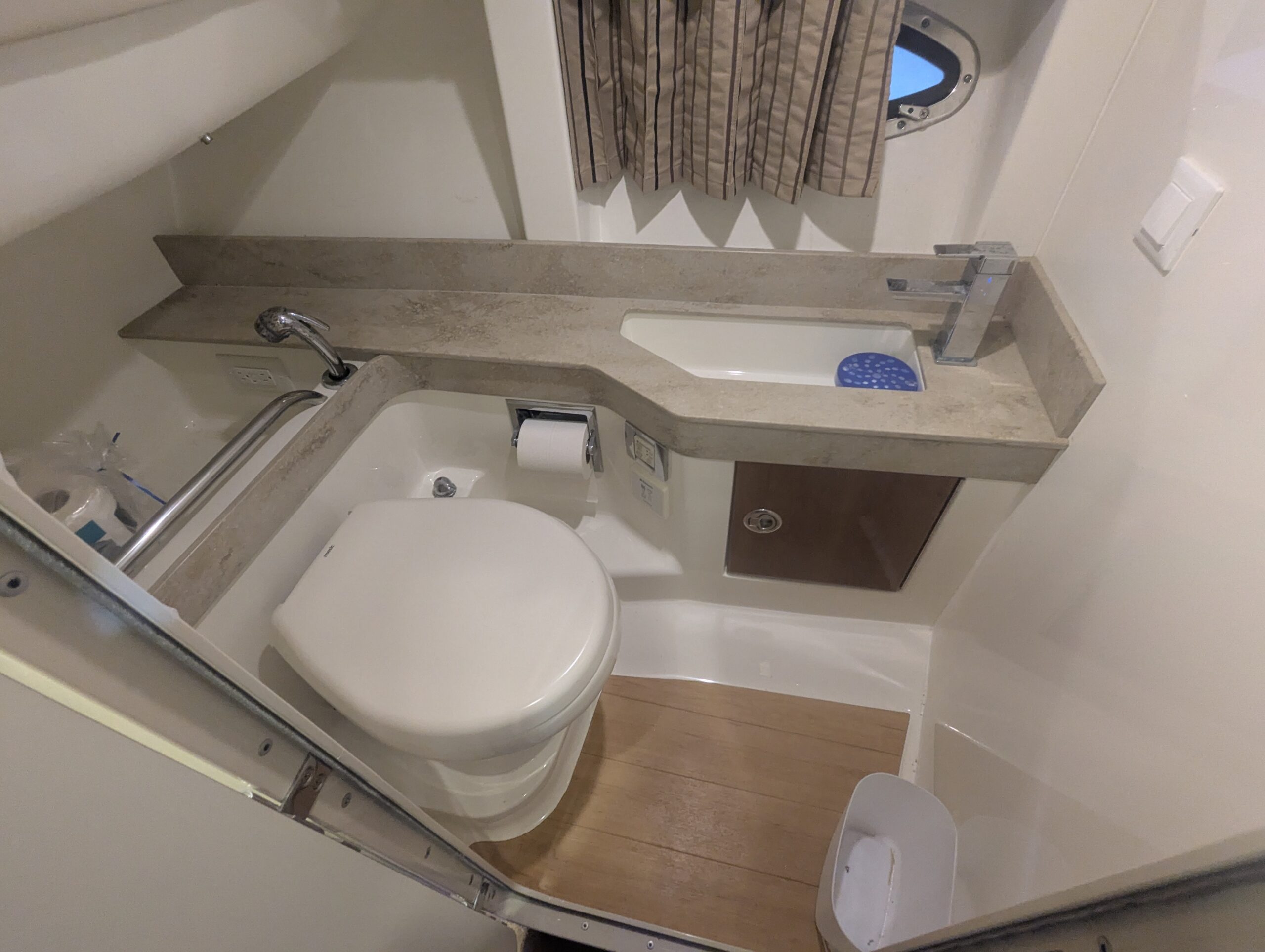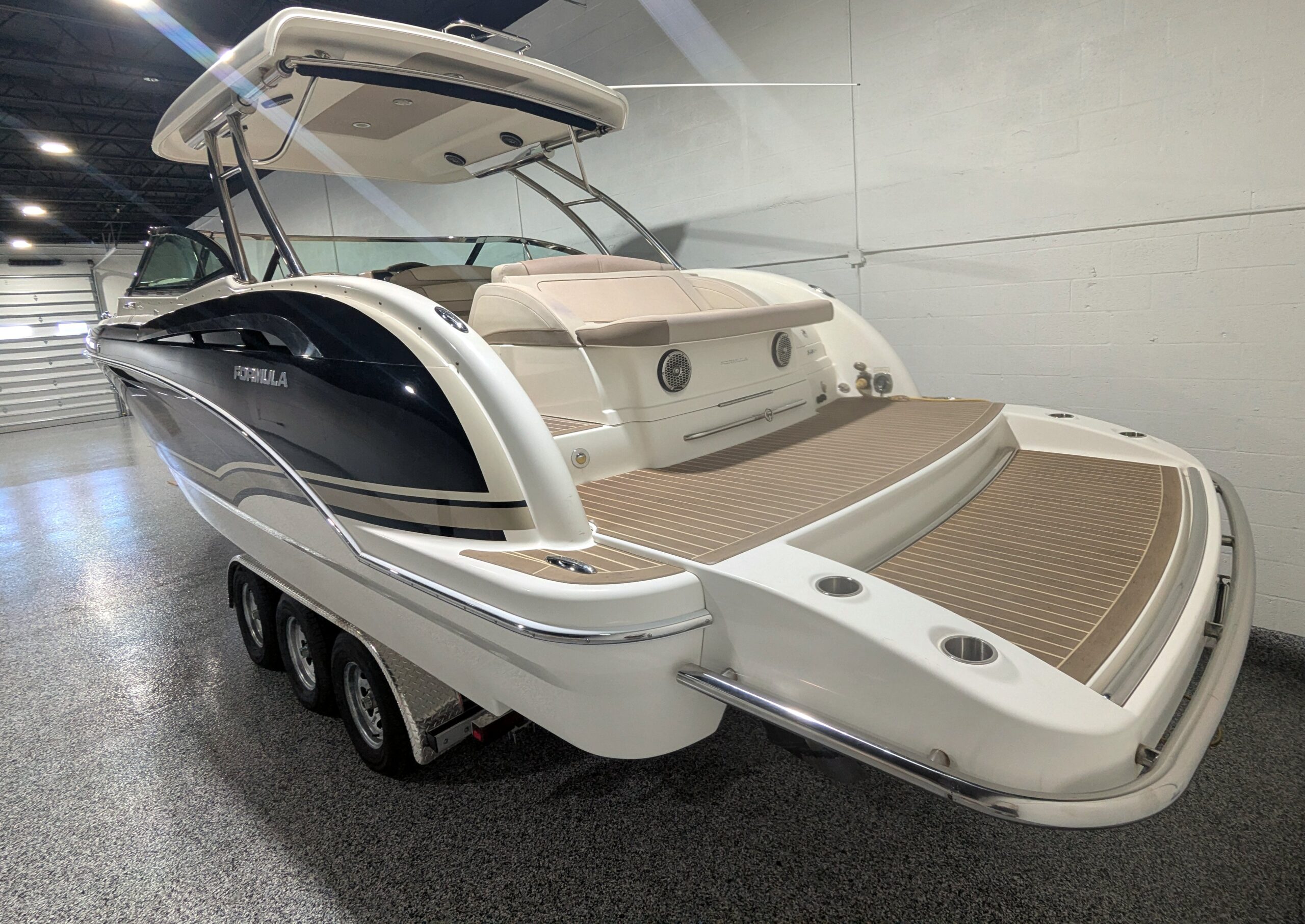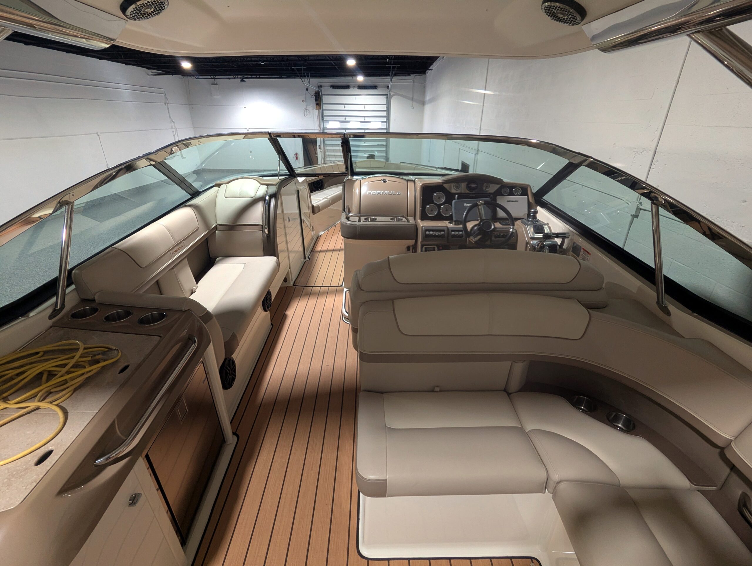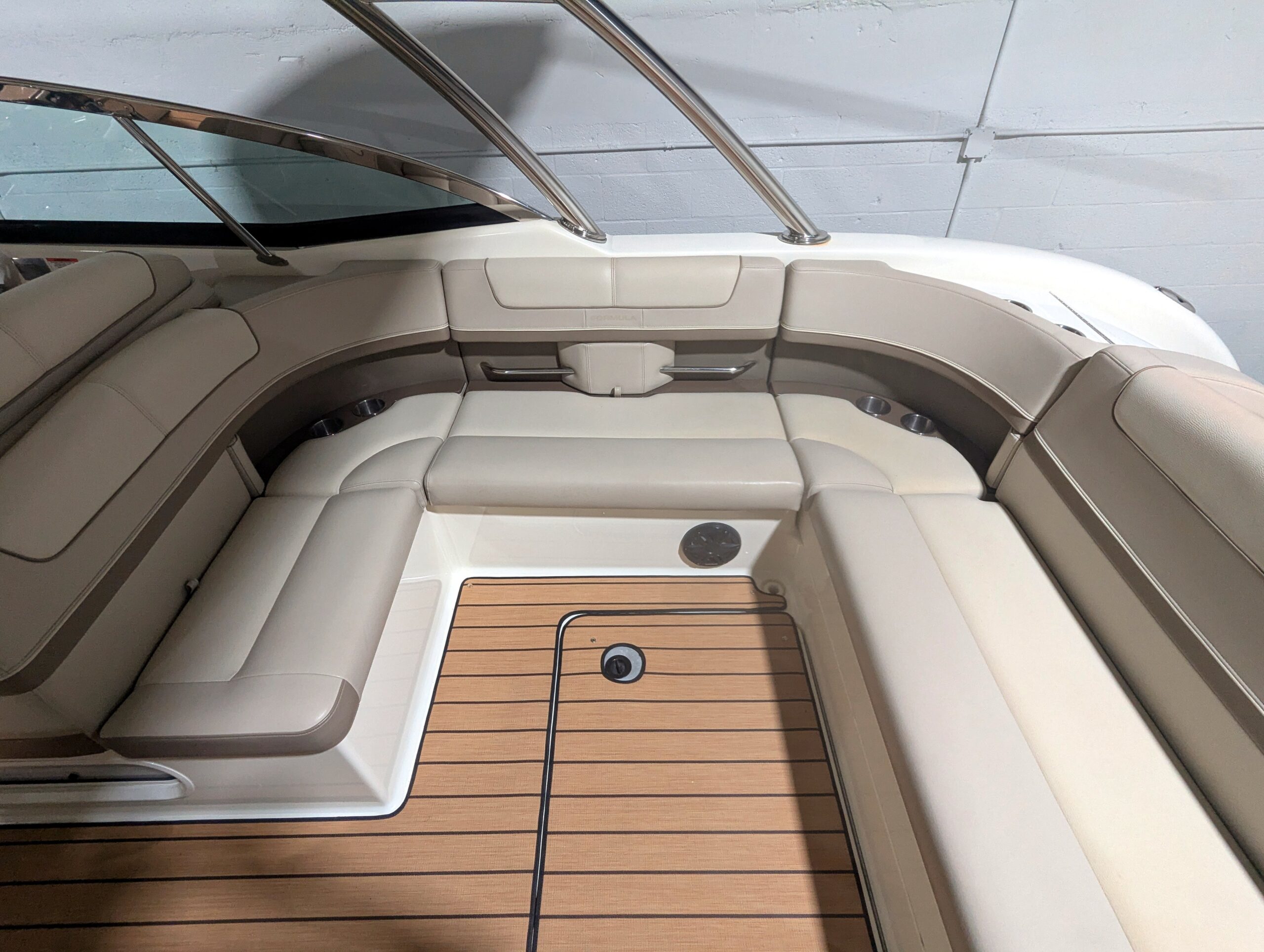 The helm features doublewide twin command seating at the completely redesigned dash with new panels and a layout that maximizes space, comfort and style. Livorsi gauges assure confident command at the liquid black dash where metallic accents announce the sporty feel of the boat. A dash-mounted, full-feature stereo remote control delivers music through eight marine-grade speakers in the cockpit and two in the cabin. The steering wheel features styling accented by an upholstered dash eyebrow introducing a sophisticated look and feel to the entire dash area, while a lockable glove box with individual compartments safeguards your valuables as you enjoy the day.