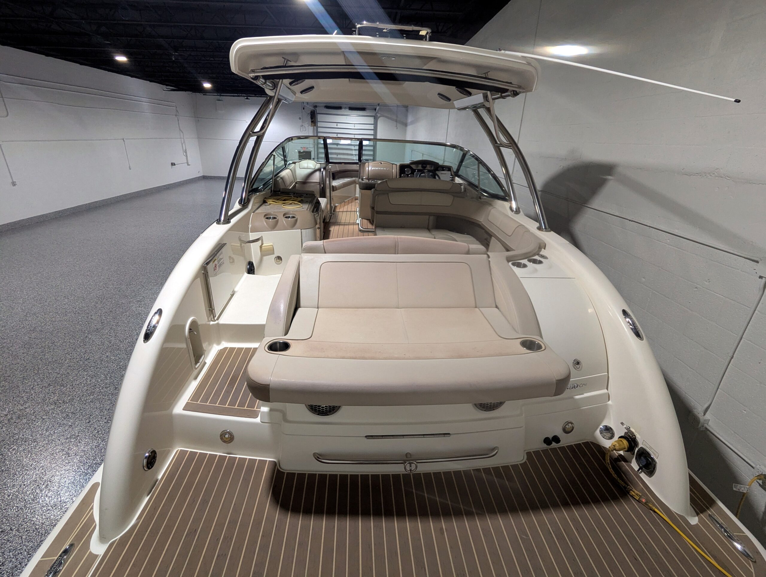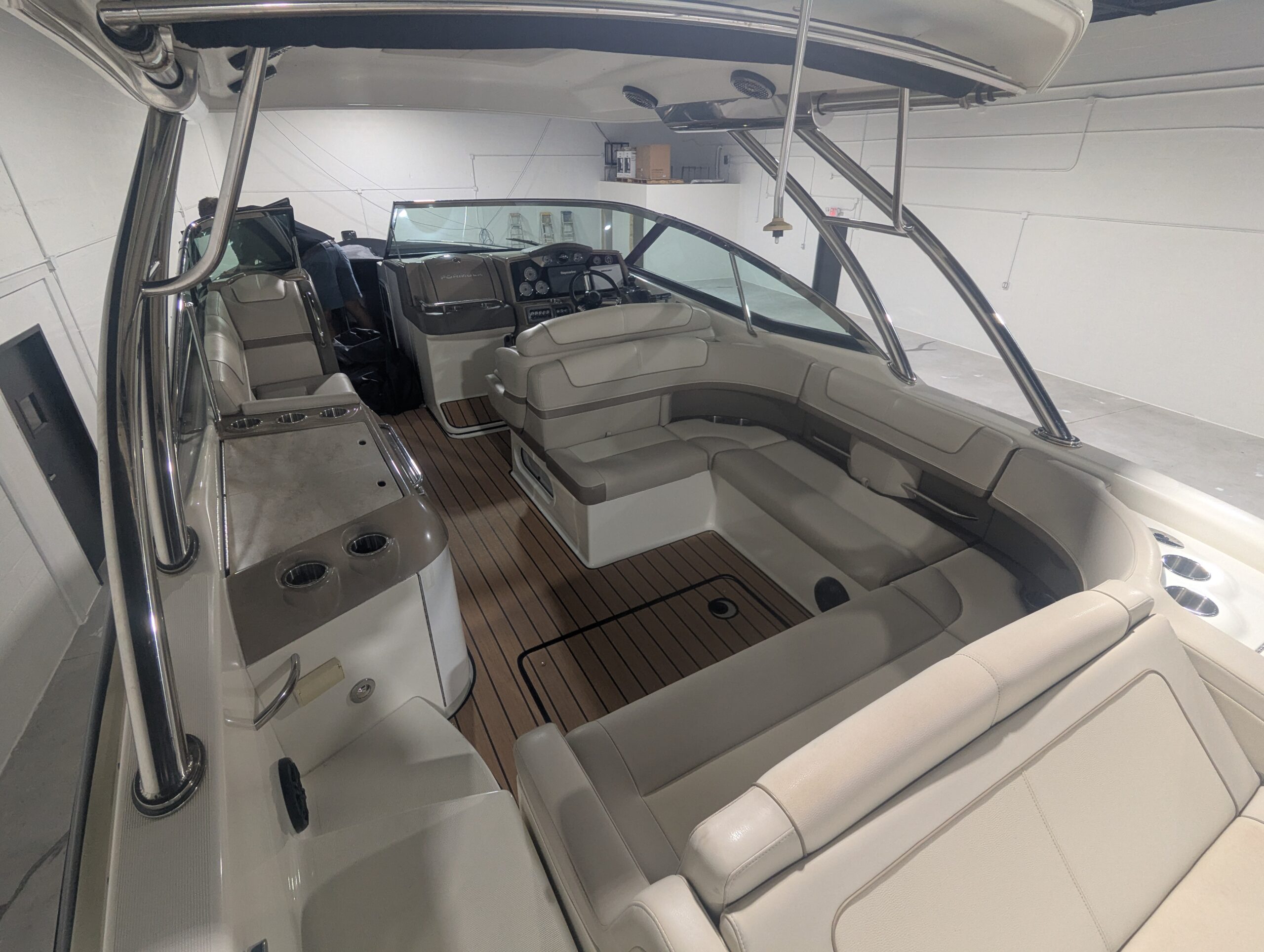 The cockpit takes a fresh, bold approach with sumptuously contoured seating, precision contrast stitching and color accents that speak volumes in styling expertise. Recessed lumbar areas convey a completely new design theme, and the 24 drinkholders throughout the bow and cockpit offer plenty of places to set your drink as you enjoy the ride. Storage is at every turn for all your boating gear, under seats, in lockers and in the floor. The molded cockpit wetbar features an integrated sink, Corian® countertop, 17.5-quart cooler, trash container and an optional fridge.