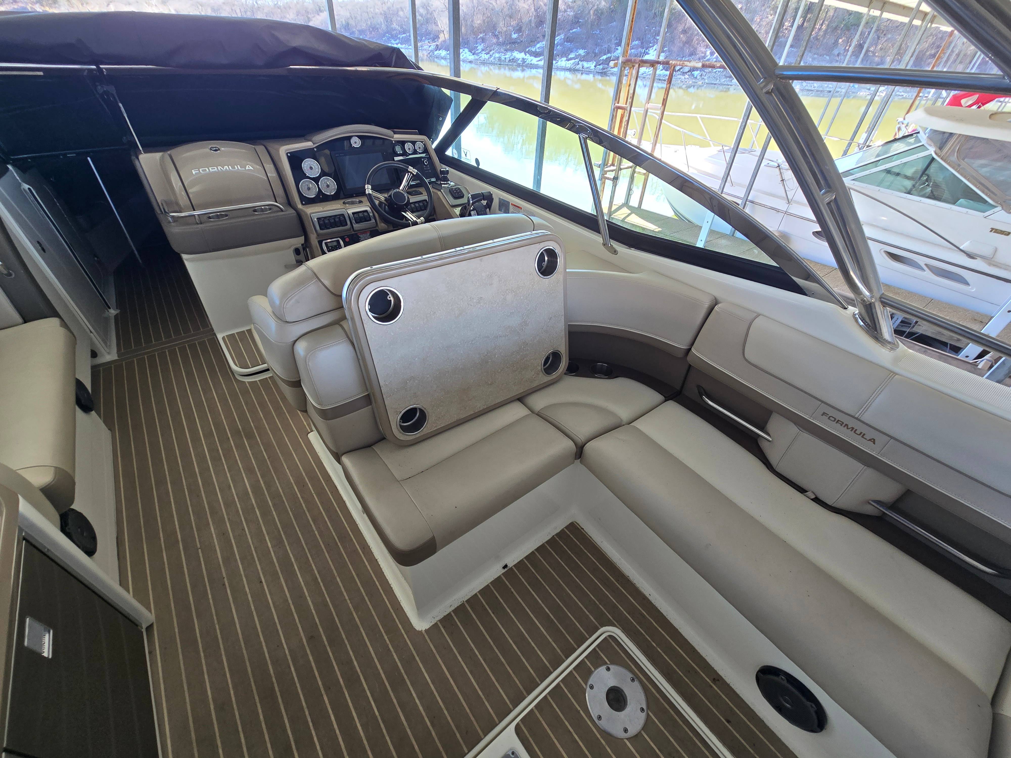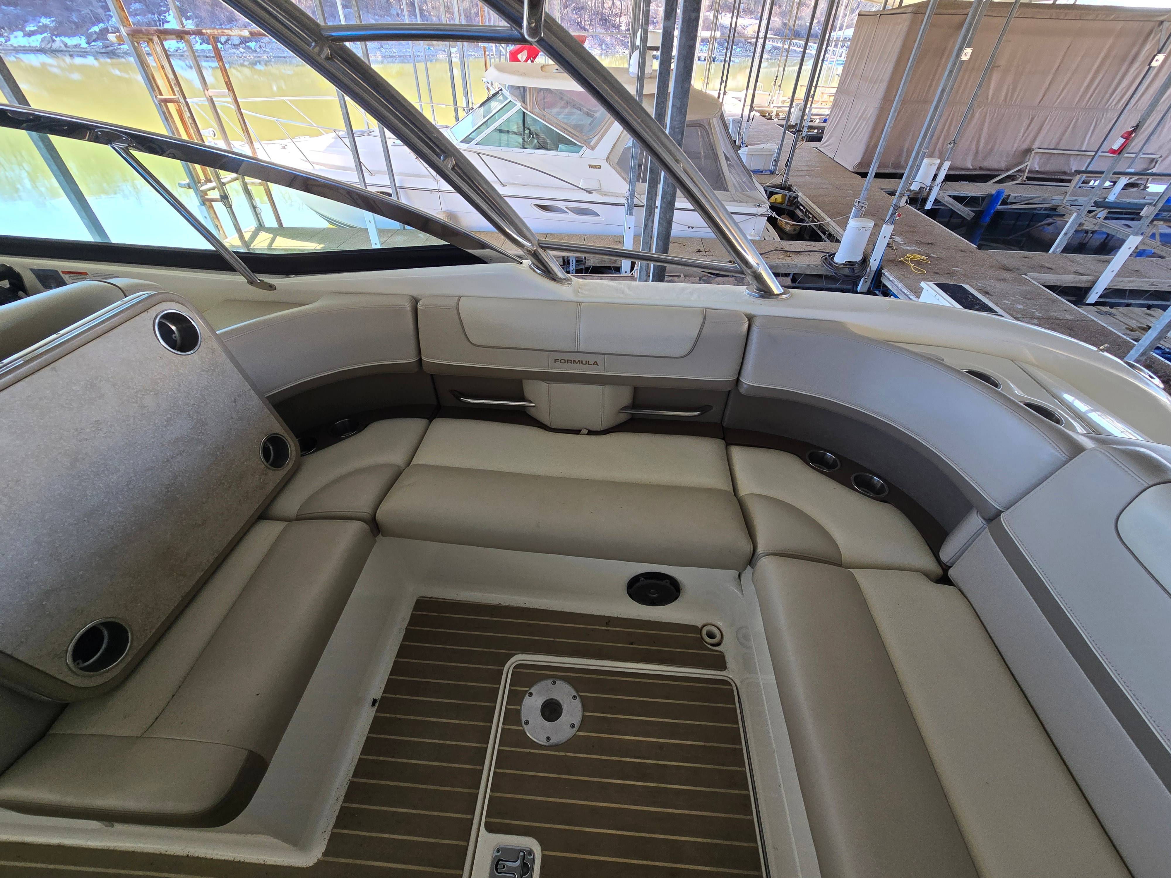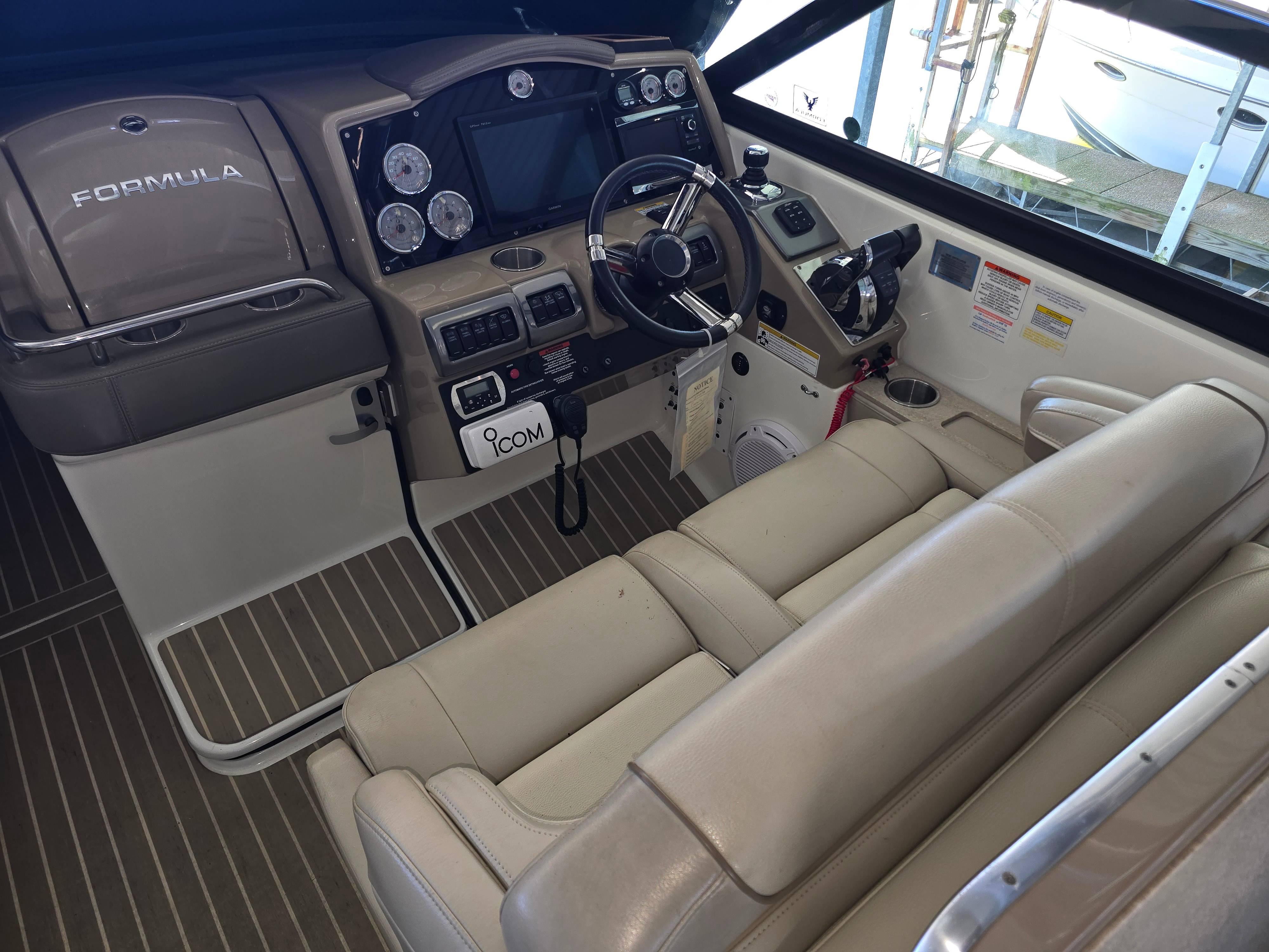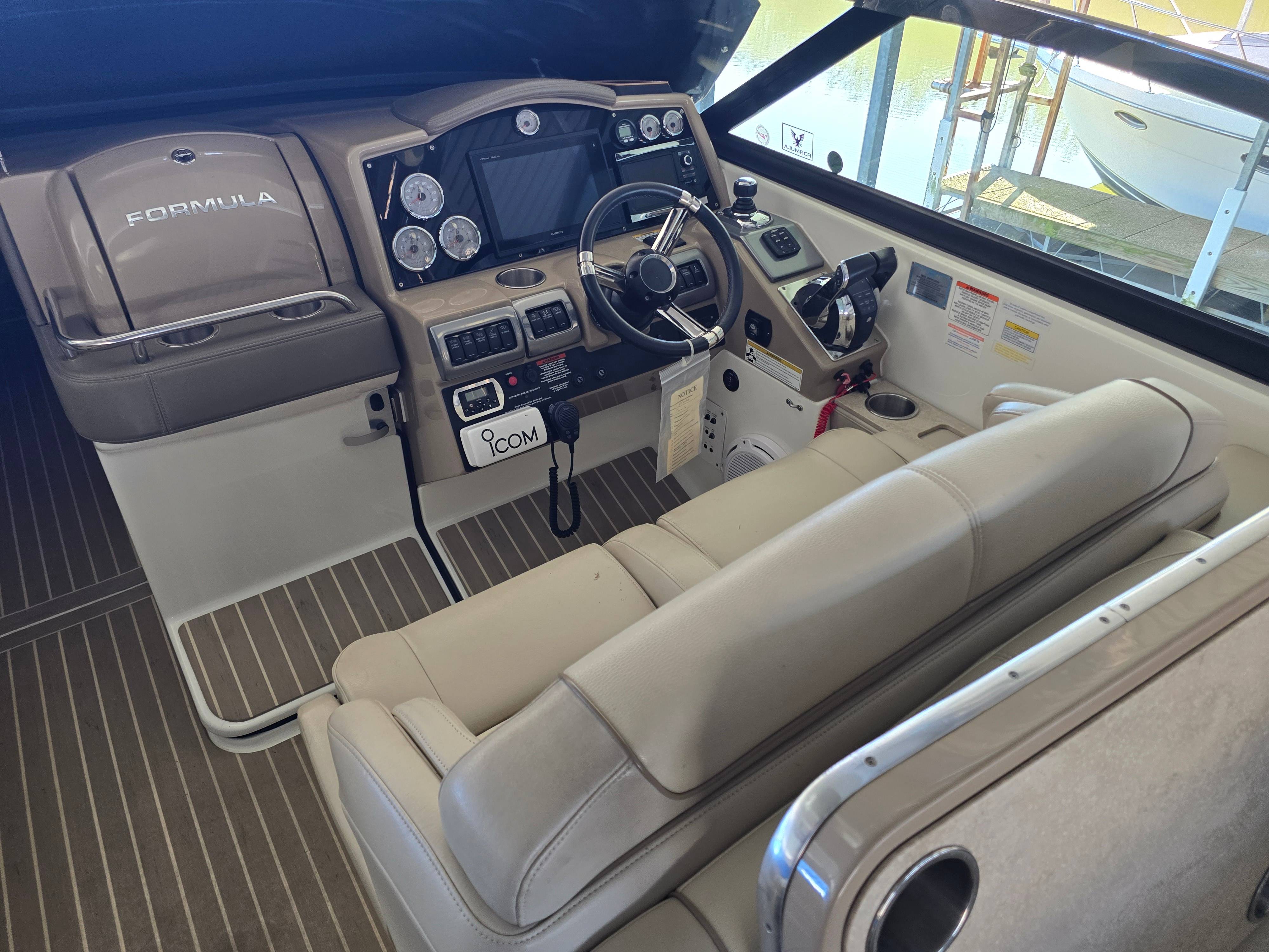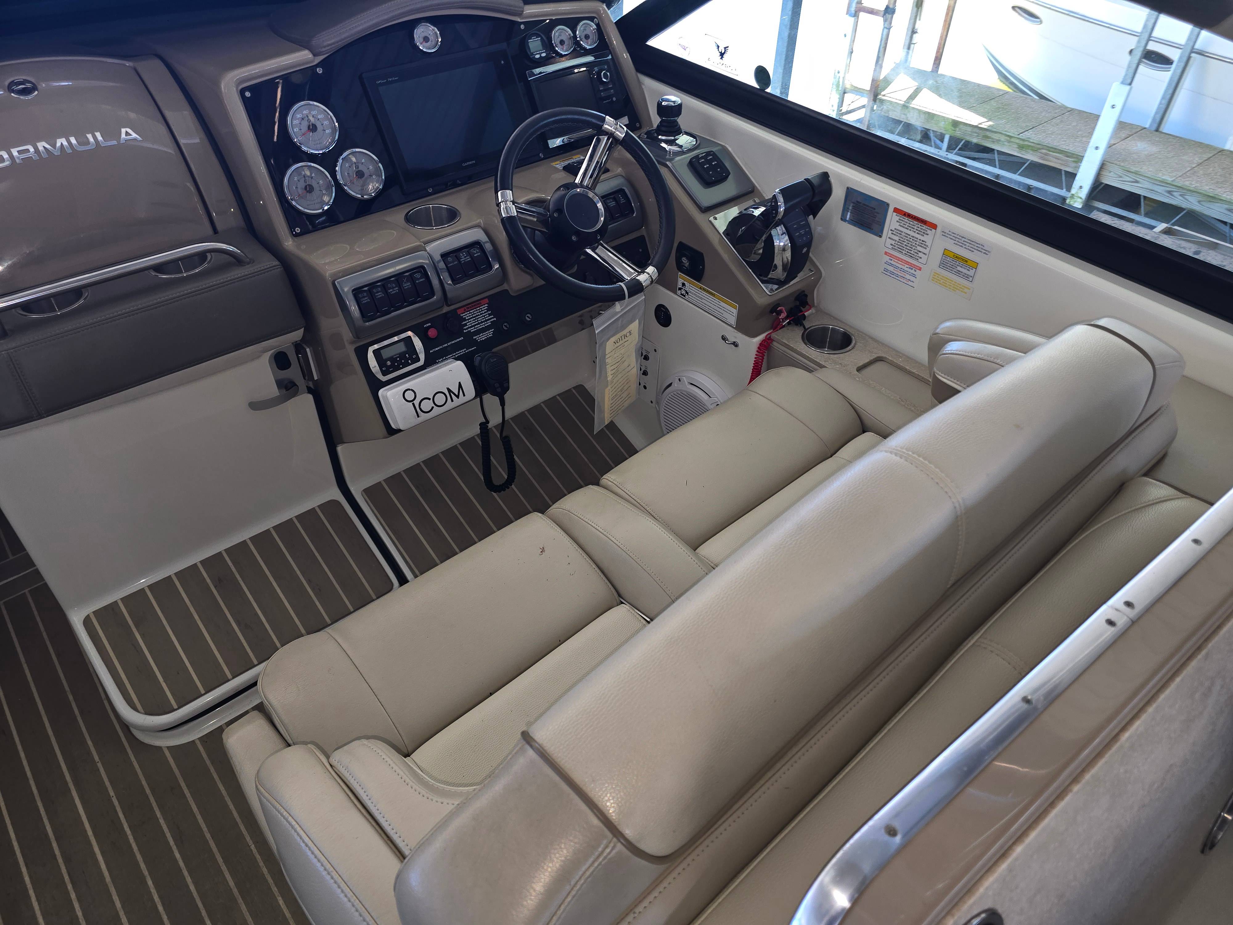 Formula has the best designed, best built pleasure boats on the water todat. Through 55 plus years of ongoing advancement in marine manufacturing, Formula's tradition of excellence continues to surpass expectations with the ultimate goal of providing consistently gratifying experiences on the water with family and friends Key Features May Include: Exterior NMMA Yacht Certification 10-year Structural Warranty Transferable 5-Year Formula Guard® Limited Protection Plan Imron® graphic A, B or C w/cockpit accent striping Pressure-treated Perma Panel™ structural hull matrix Foam-filled hull cavities Chemically bonded & thru-bolted deck-to-hull joint Heavy-duty PVC gunwale w/stainless steel insert Concealed fiberglass anchor locker Offshore bow rail Stainless steel hardware & 316L stainless steel welded rails Ten custom Formula logo-cast cleats Stainless steel fuel fill w/integral vent Polished stainless steel vent trim Two polished Bomar® cabin venting hatches w/screens Four polished stainless steel portlights w/screens Nonskid foredeck center walkway Continuous tinted, tempered curved-glass windshield w/stainless steel top frame & center walk-thru Windshield wiper Air horn Starboard transom trunk storage & two fenders Transom shower w/hot & cold controls Cockpit Continuous molded deck & cockpit liner Molded in-dash deck access steps w/316L stainless steel handrail Dash panels w/silver burl or wood finish & brushed metallic finish Complete Livorsi® illuminated instrumentation, domed w/chrome bezels Dash panel-mounted Ritchie® compass Digital depth sounder Garmin® GPS navigational system w/color chartplotter Livorsi chromed shifters/throttles w/in-handle outdrive trim switch Safety ignition stop switches w/tethers Dino™ tilt steering wheel w/silver burl or wood & brushed metallic insets Lockable under-dash storage compartment Bennett® trim tab switches & indicators Fingertip outdrive trim/trailer switches Auxiliary 12V outlet iPod™/MP3 port Port lounge w/line storage Fire extinguisher Battery parallel emergency switch Custom patterned cockpit carpet Cabin Sliding/locking cabin door w/screen Woodgrain-finish entry steps Woodgrain-finish flooring throughout cabin Custom décor pillows & draperies Hanging locker Demand water system Fire extinguisher 120V water heater w/heat exchanger Carbon monoxide detector Automatic cabin bilge pump w/high water alarm Aft cabin stateroom/full-size berth w/Sensus® memory foam mattress & full-width storage Engine Twin engine installation Motorized hatch lift Courtesy lighting Fume detector Automatic fire extinguisher Thru-bolted engine mounts Starting & auxillary marine batteries w/retainers 60-amp battery charger Active & passive galvanic corrosion protection systems Bilge blowers Automatic bilge pump Bilge high water alarm