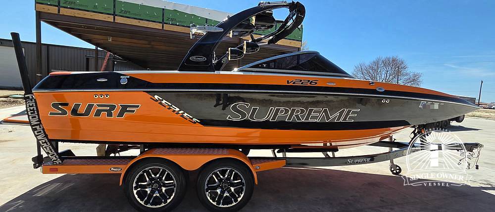 Introducing the 2014 Ski Supreme V226 Surf Edition! She's located in Weatherford, Texas and has only had one owner. Freshwater use only! 166 hours on the engine! Booming sound system!