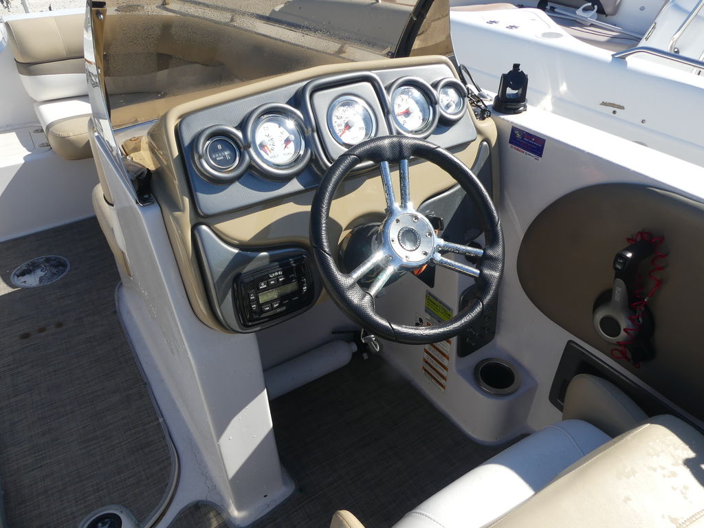 The helm station is clean and easy to use, featuring intuitive controls and clear gauges for a confident driving experience. Additional highlights include stainless-steel hardware for durability, non-skid decking for added safety, and cup holders placed throughout for convenience.