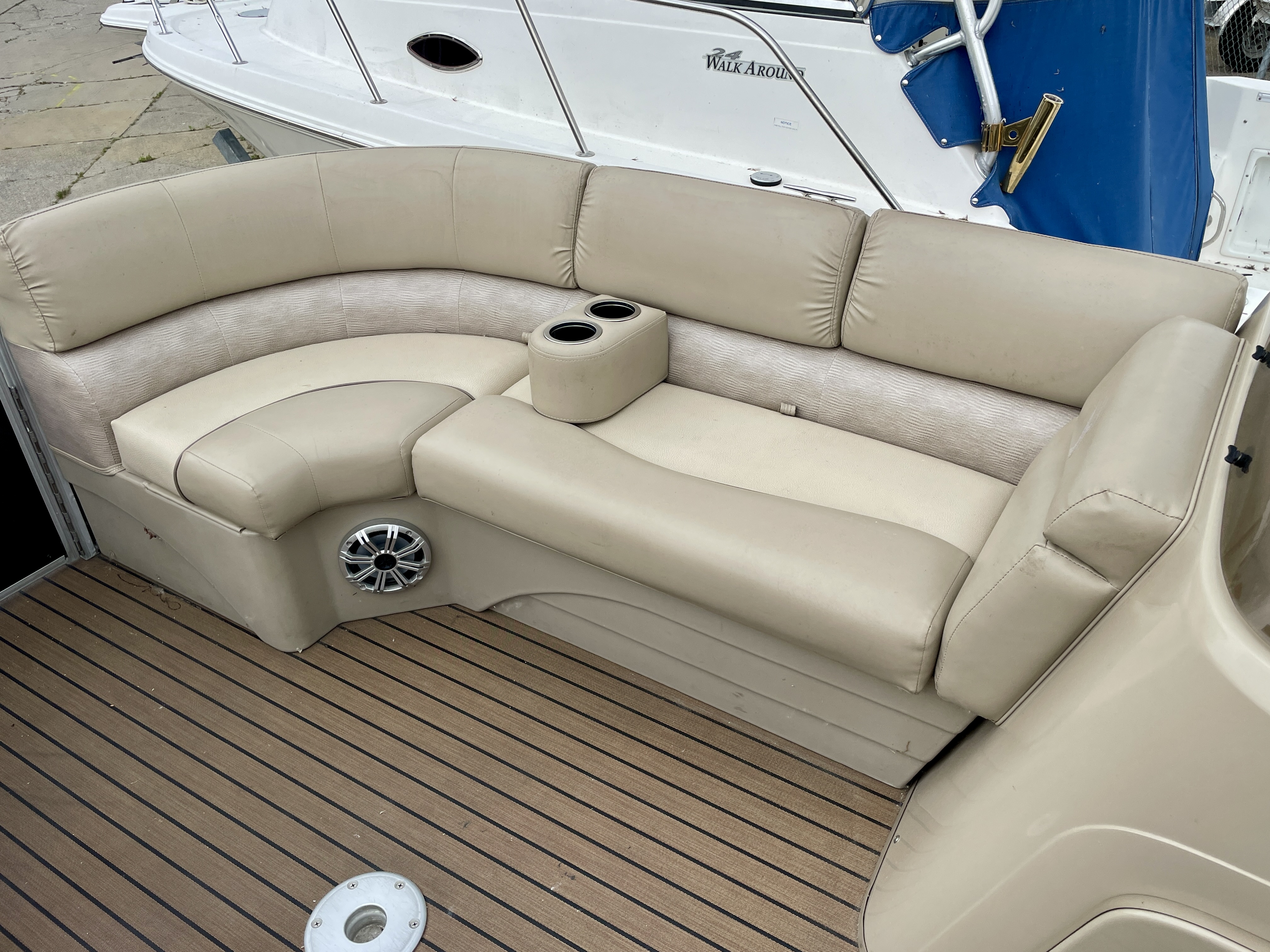 Boat is equipped with tri-toon package, ski locker, full vinyl teak flooring upgrade, pillowtop upholstery, rear lounger in the stern, stainless steel docking lights, stereo with speakers and more!