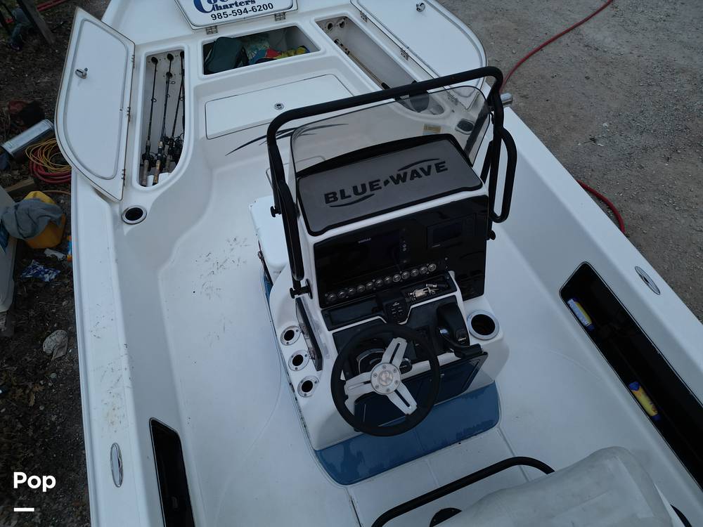 This 2015 Blue Wave 2400 Pure Bay is a large bay boat with an 8' 6" beam, a 25' 3" overall length, and a 78-gallon fuel capacity. It is designed for versatility in shallow and deeper water and features a large casting deck, two livewells and extensive storage for all of your gear.