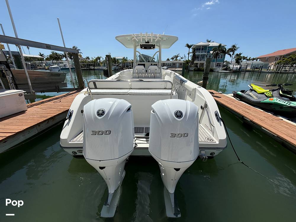 The Century is equipped with dual Yamaha 300 horsepower four-stroke outboards. This boat will max out around 50 mph on the water.
