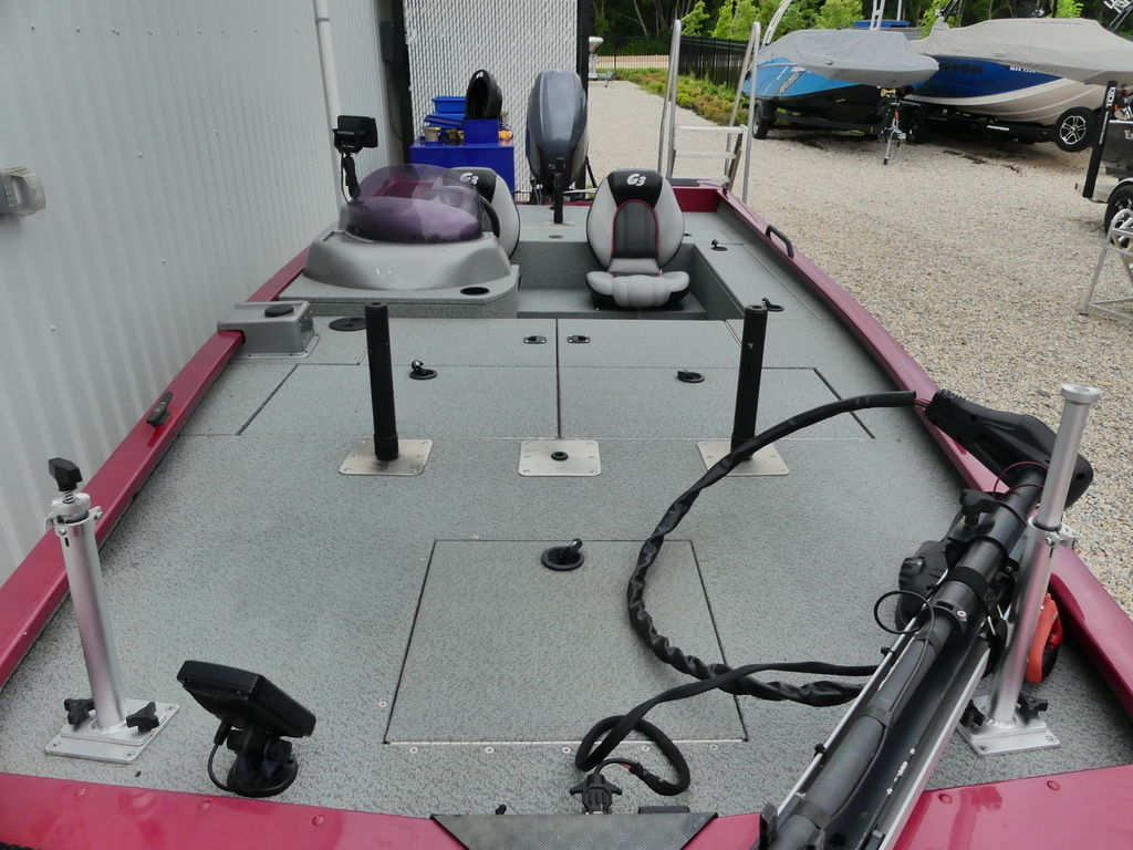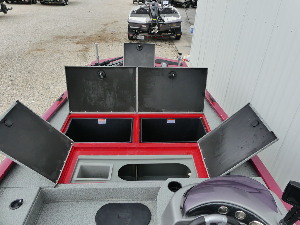 The layout is designed with anglers in mind, featuring ample casting space, multiple pedestal seat positions, and generous storage throughout. Dual aerated livewells (approximately 54 gallons total) help keep your catch fresh, while lockable rod storage and organized compartments keep gear secure and accessible.