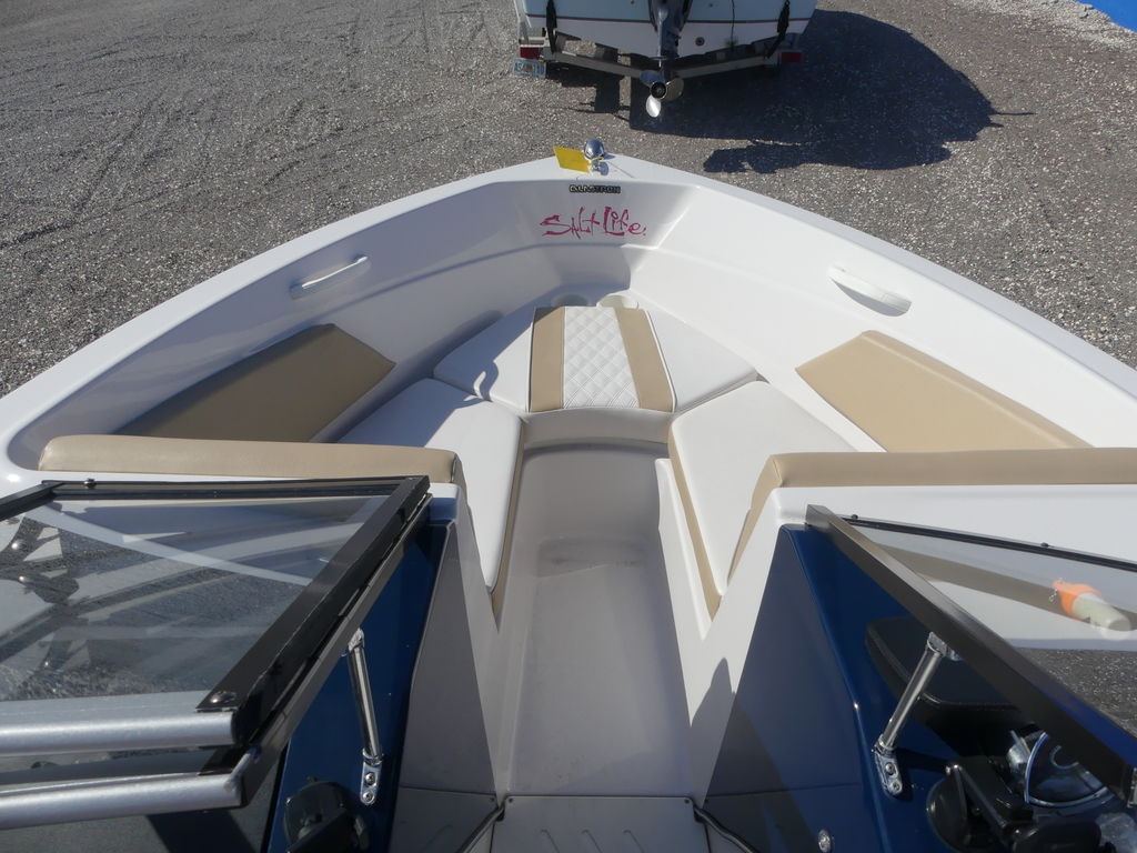 The spacious cockpit layout features wrap-around seating with plush cushions, roomy storage compartments, and thoughtful design elements that keep gear and personal items secure and accessible. The walkthrough windshield adds convenience, opening up easy access from the helm to the bow seating area. Comfortable seating for family and guests ensures every trip is enjoyable, whether you’re heading out for a quick spin or spending the whole day on the water.