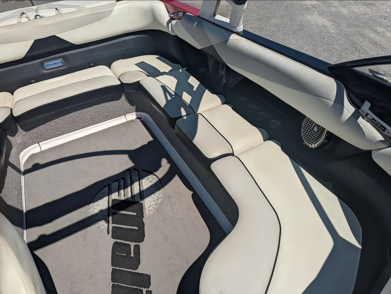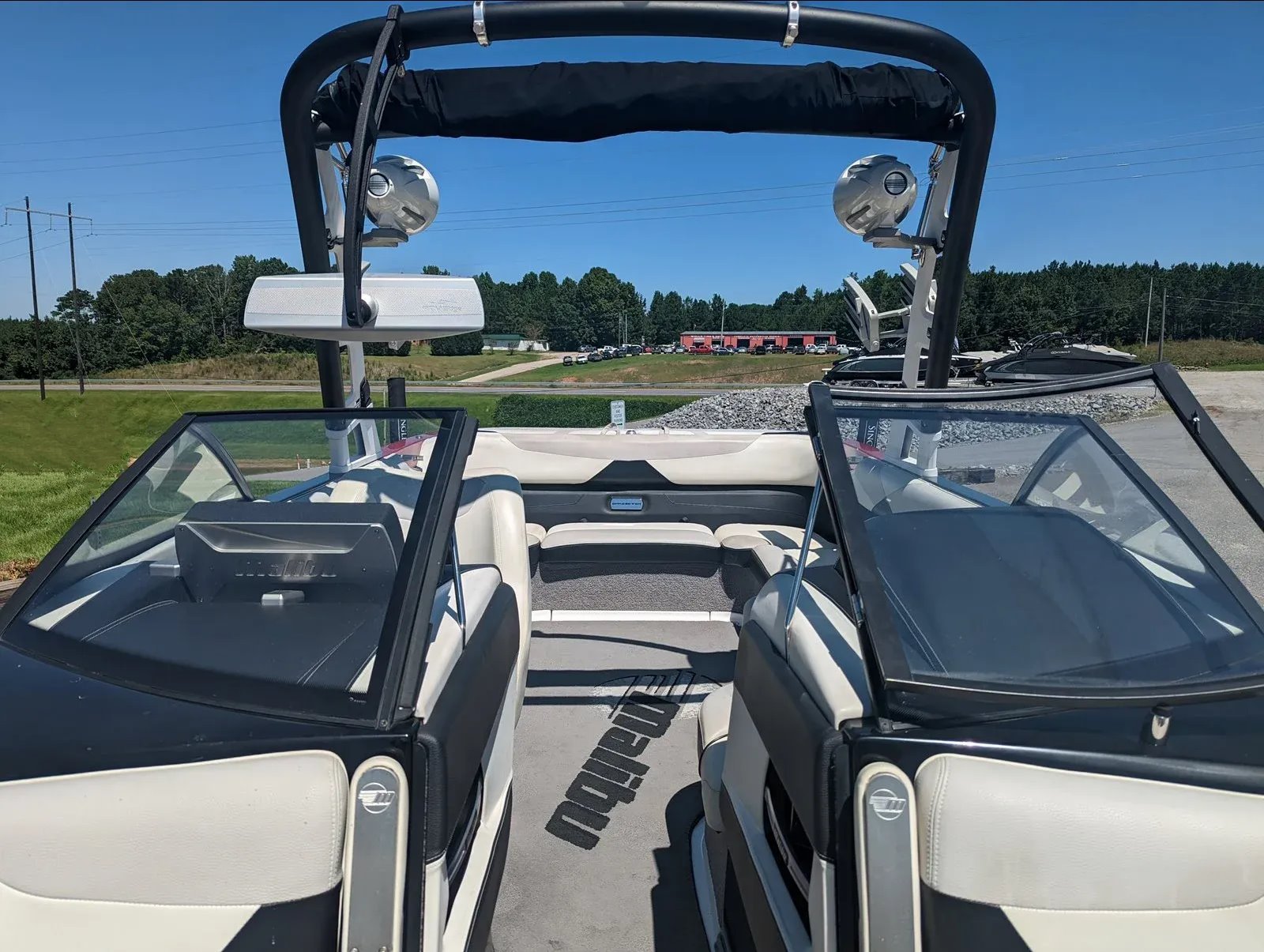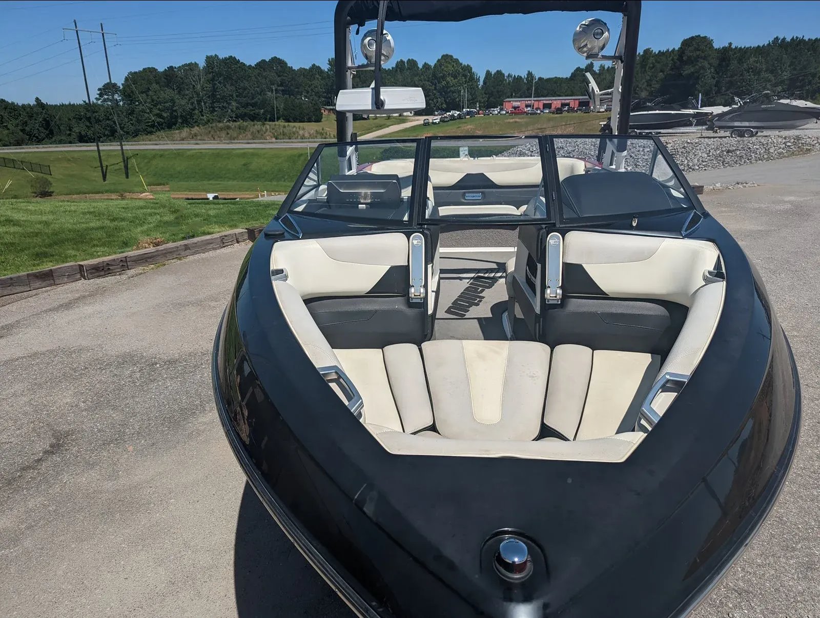 It comes with a full mooring cover, bimini top, stereo with dual tower speakers and subwoofer, dual board racks, mirror, and more.