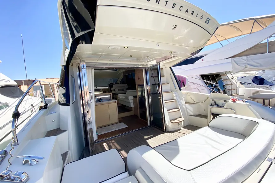 This Monte Carlo 5S takes the next step in the evolution of her sister's - the MC5 - success. In the "S" model, the flying bridge version gives way to a sedan design, still utilizing the upper deck for sunbathing and entertaining. The upper deck layout allows a private area for sunning and relaxation. Features include 3 staterooms and 2 heads, a 6-person salon, upper deck for sunbathing or entertaining, transom compartment, twin Volvo IPS 600 engines, IPS joystick controls, electric windlass and much more! The Beneteau Monte Carlo 5S offers an upper deck to catch some rays or enjoy a meal in wrap-around seating at a high-low table. The tulip-shaped bow and round port lights deliver a distinctive retro look to the yacht, but she's fully loaded with modern engineering beneath her radiant skin.