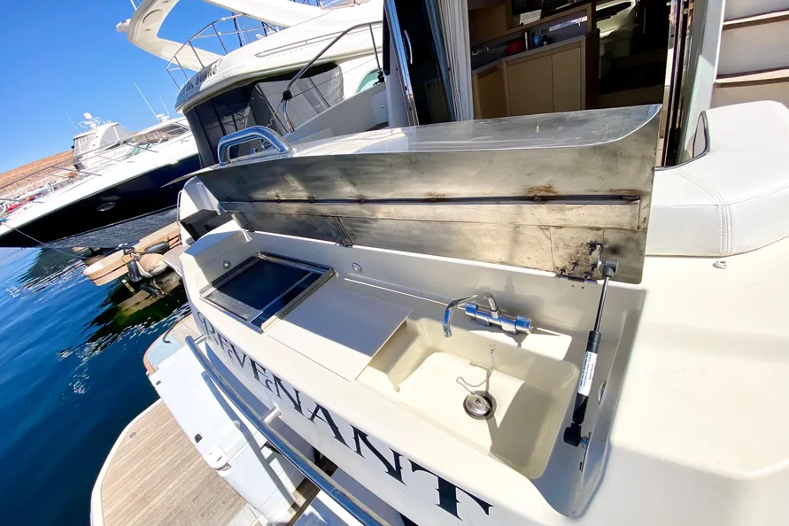 A compartment in the transom can be used for line and gear storage or the optional grill, sink and a food prep area. With the huge swim platform, this becomes a handy BBQ for entertaining while at anchor and handy to the table on the aft deck.