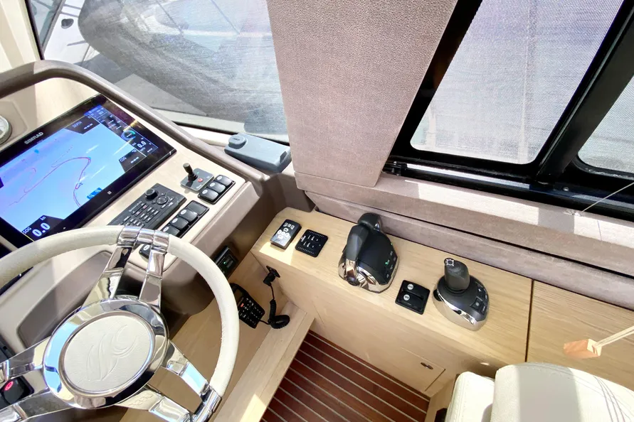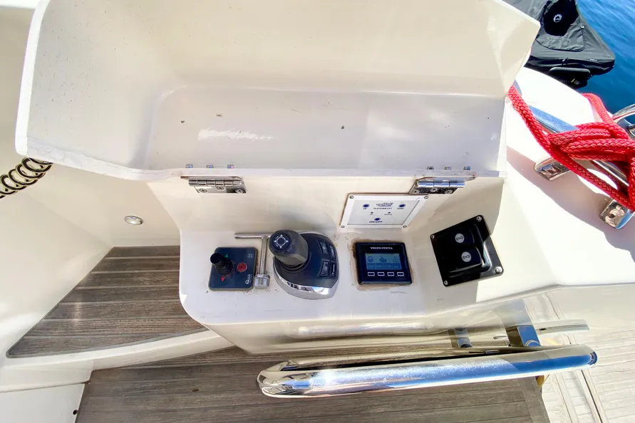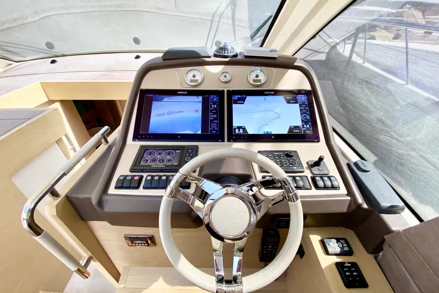 Starboard on the main deck is the Helm, including an adjustable double-wide seat. The window to the right opens allowing the captain full view of the boat’s length when docking. The Volvo Penta engine diagnostic screen is to the left of the wheel, optional bow thruster control is to the right.