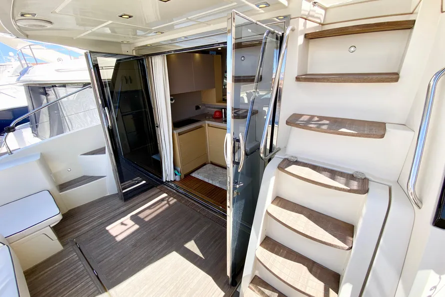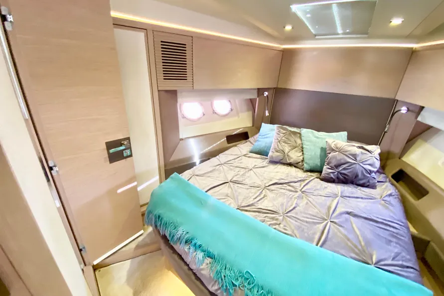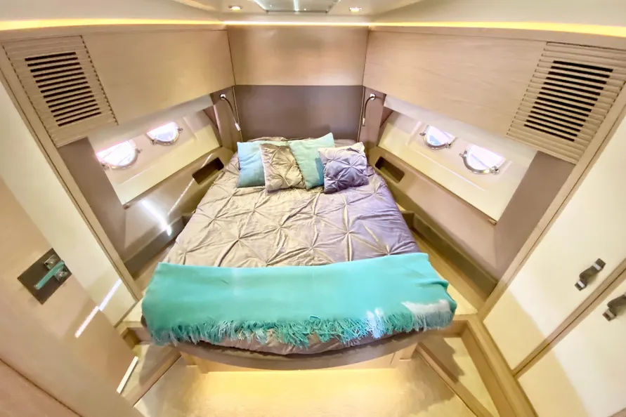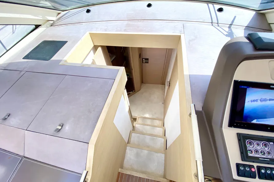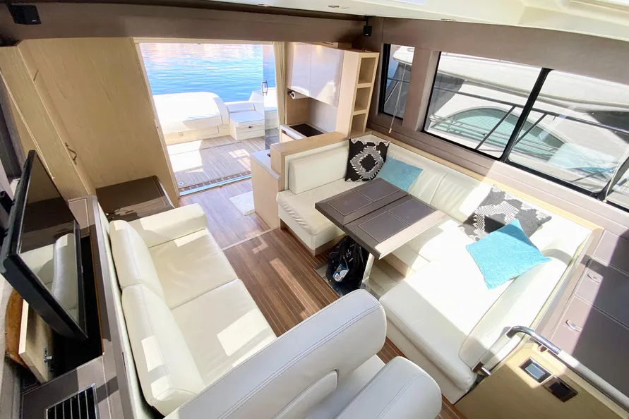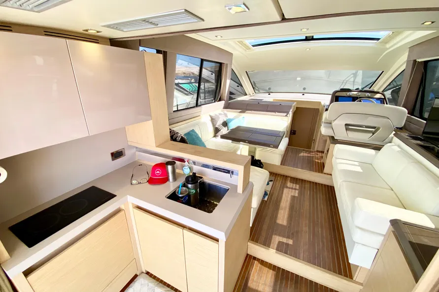 In sun lounging mode, the Monte Carlo 5S’ upper deck allows for the privacy that some sunbathers are looking for with a large sunpad. While still retaining all the features of a fully capable cruising boat, the upper deck allows a private sunning retreat with a stunning view of the surroundings. With the pedestal in the elevated position, al fresco dining takes on a new meaning. Here one can dine or enjoy cocktails with a spectacular view along with speakers for music.
