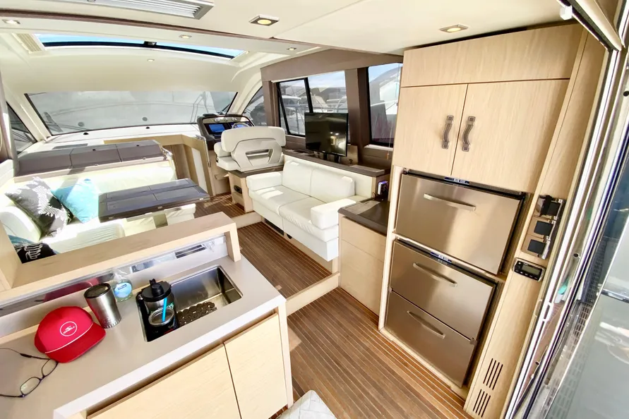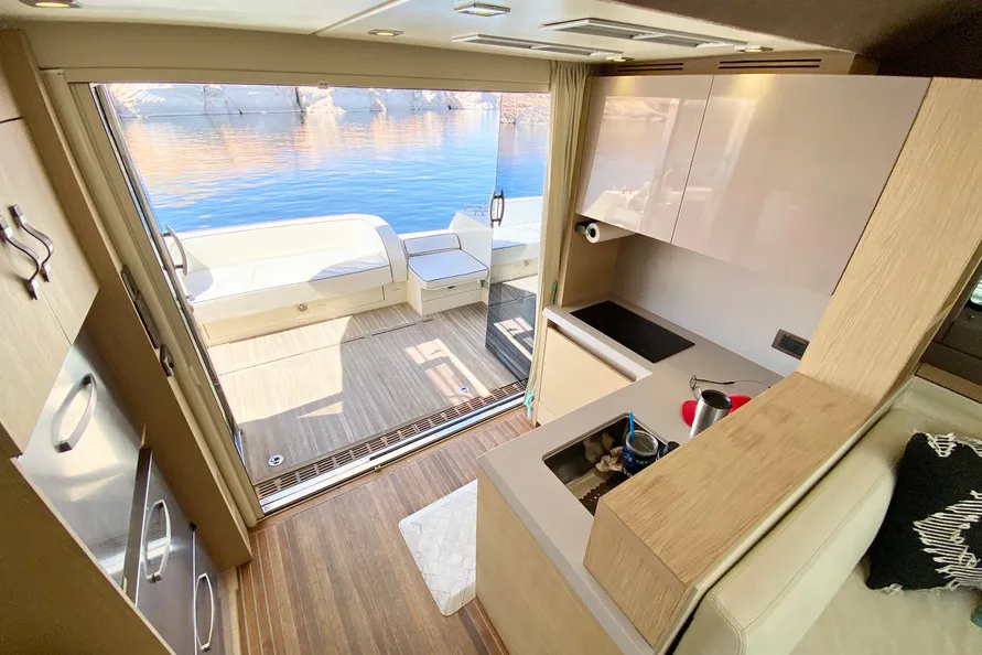 From the Aft Deck, leading into stainless steel and glass doors is the Galley. To the left is a two-burner ceramic stove top with an oven underneath. To the right is the stainless steel sink under the Corian countertop insert. The refrigerator and freezer are behind wood doors to starboard. Opposite the galley are deep drawers and more cabinet space. Pop-up TV at left.