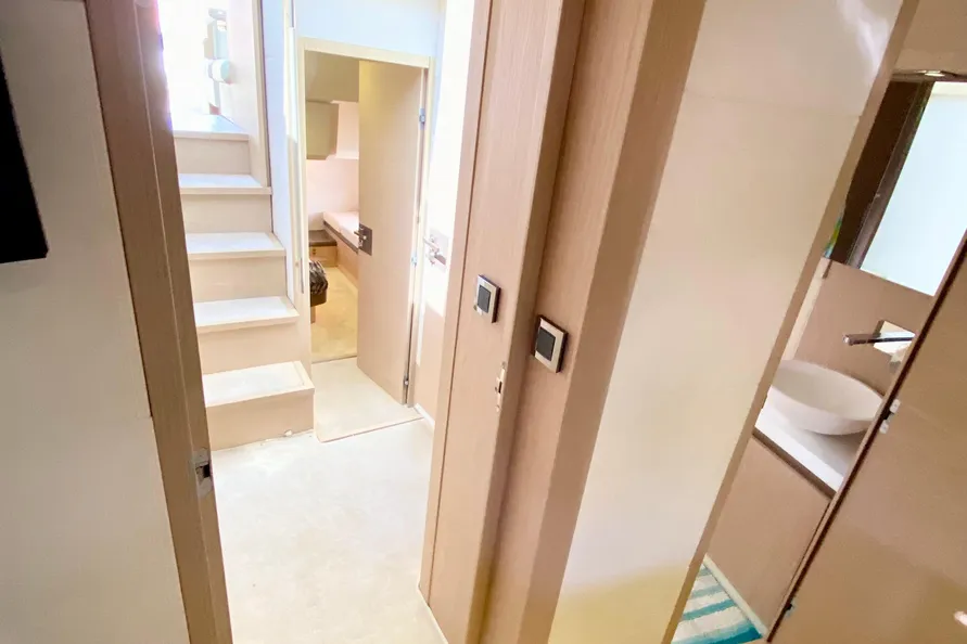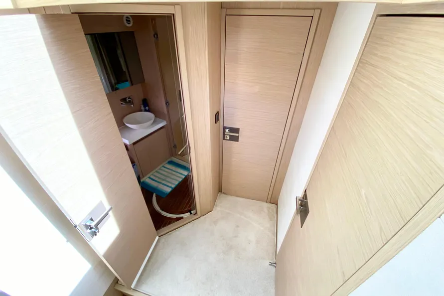 The VIP stateroom and the starboard guest stateroom share this head, which has a private entrance to the VIP cabin forward. It also serves as the day head.