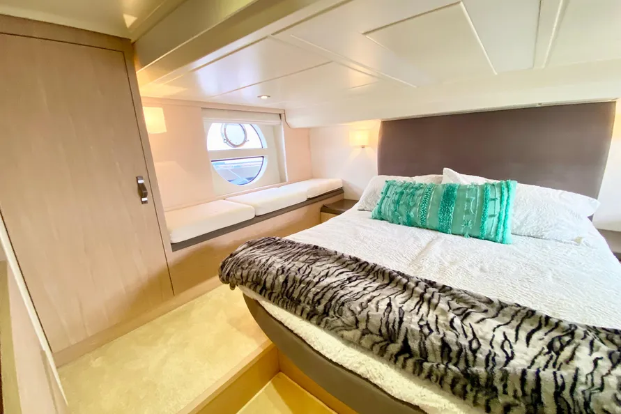 Aft of the vessel is the Master Suite. Large portlights fill the cabin with lighting while giving a great view outside just above the waterline. The master bed is flanked by night stands and has a custom-selected headboard. To port in the master stateroom, underneath the huge, round portlight, is a bench seat that will come in handy, along with storage underneath. The overhead rises higher over the aisles on either side of the bed to give 6'1" of headroom all around the bed.