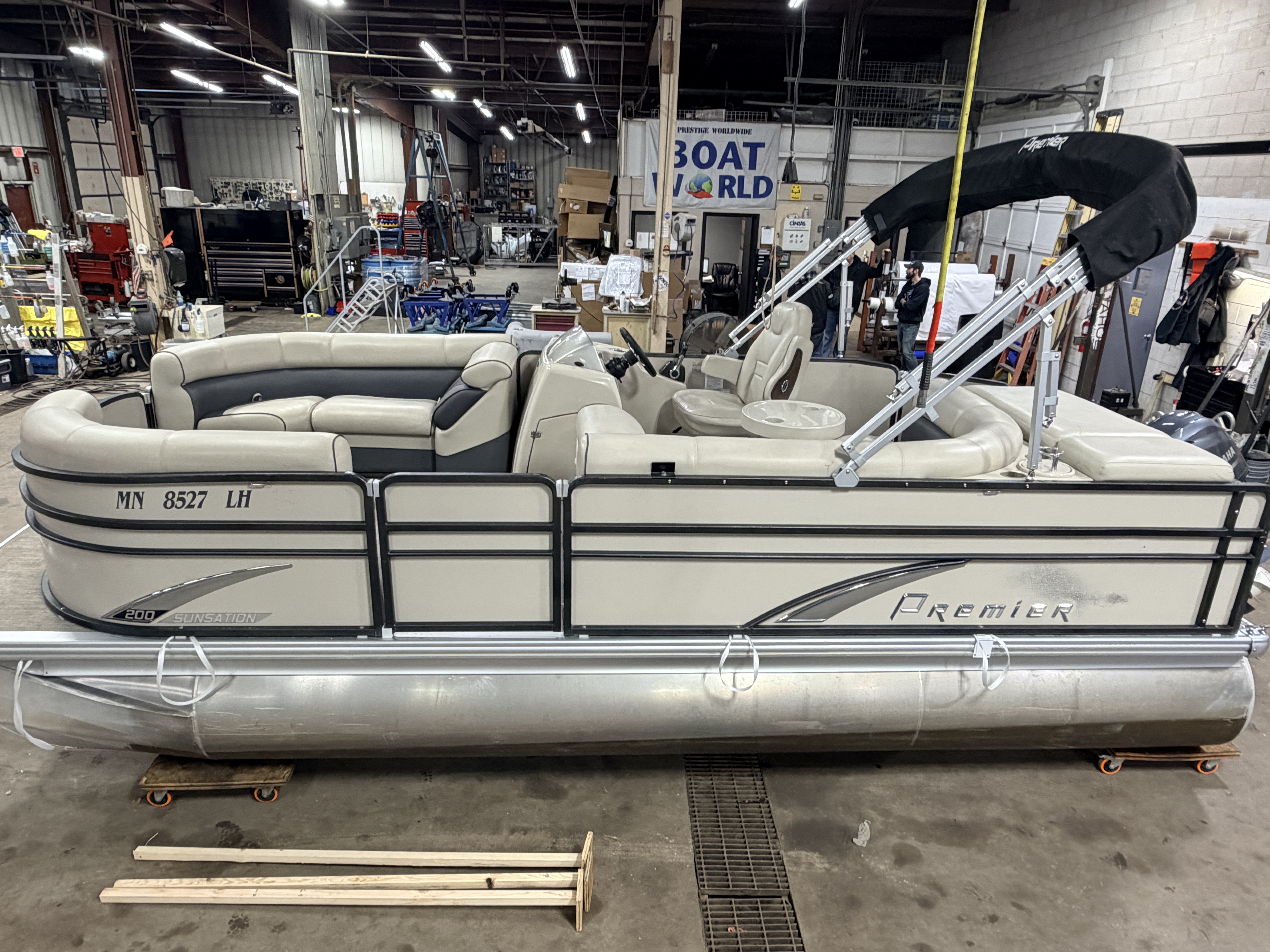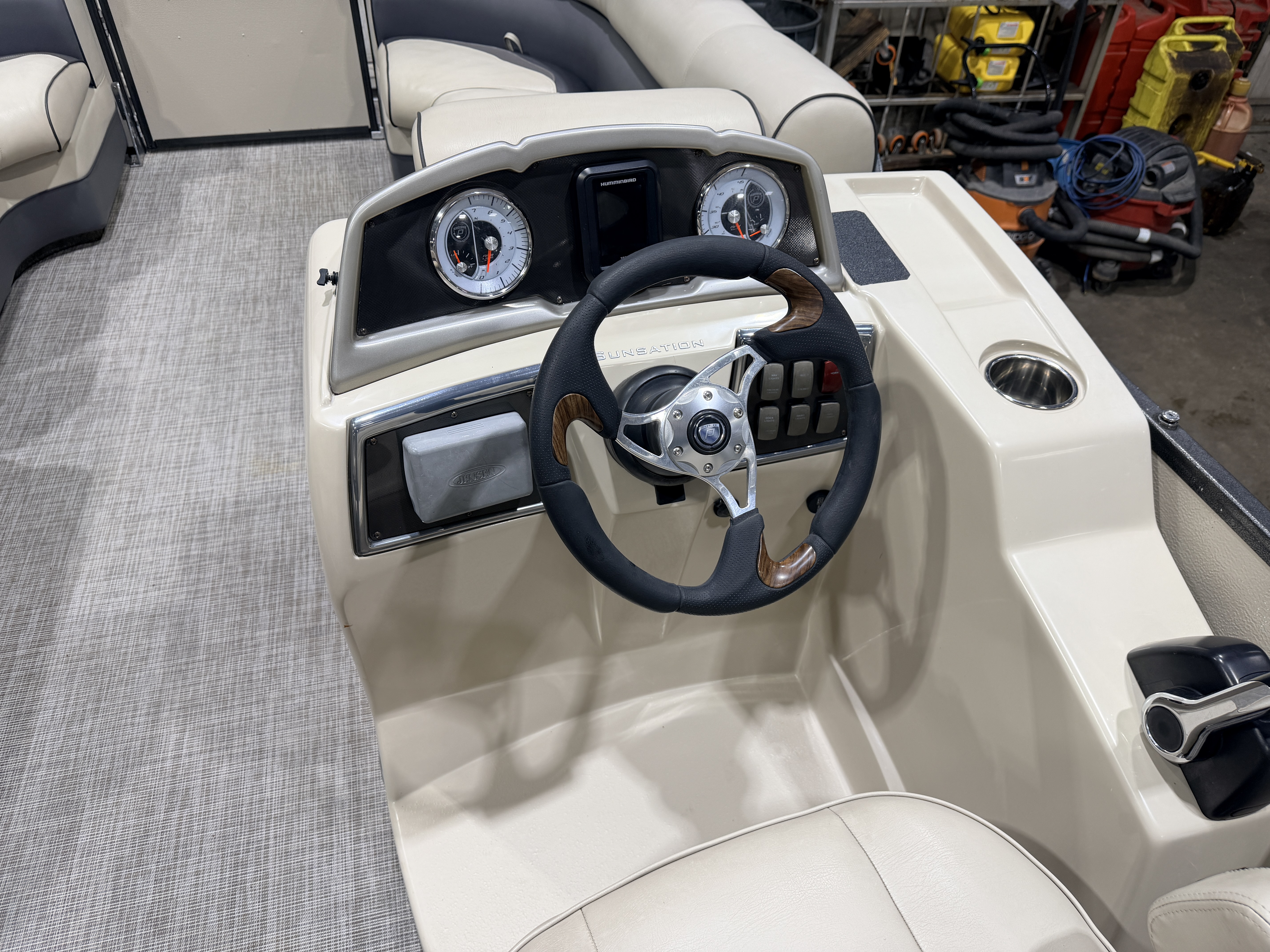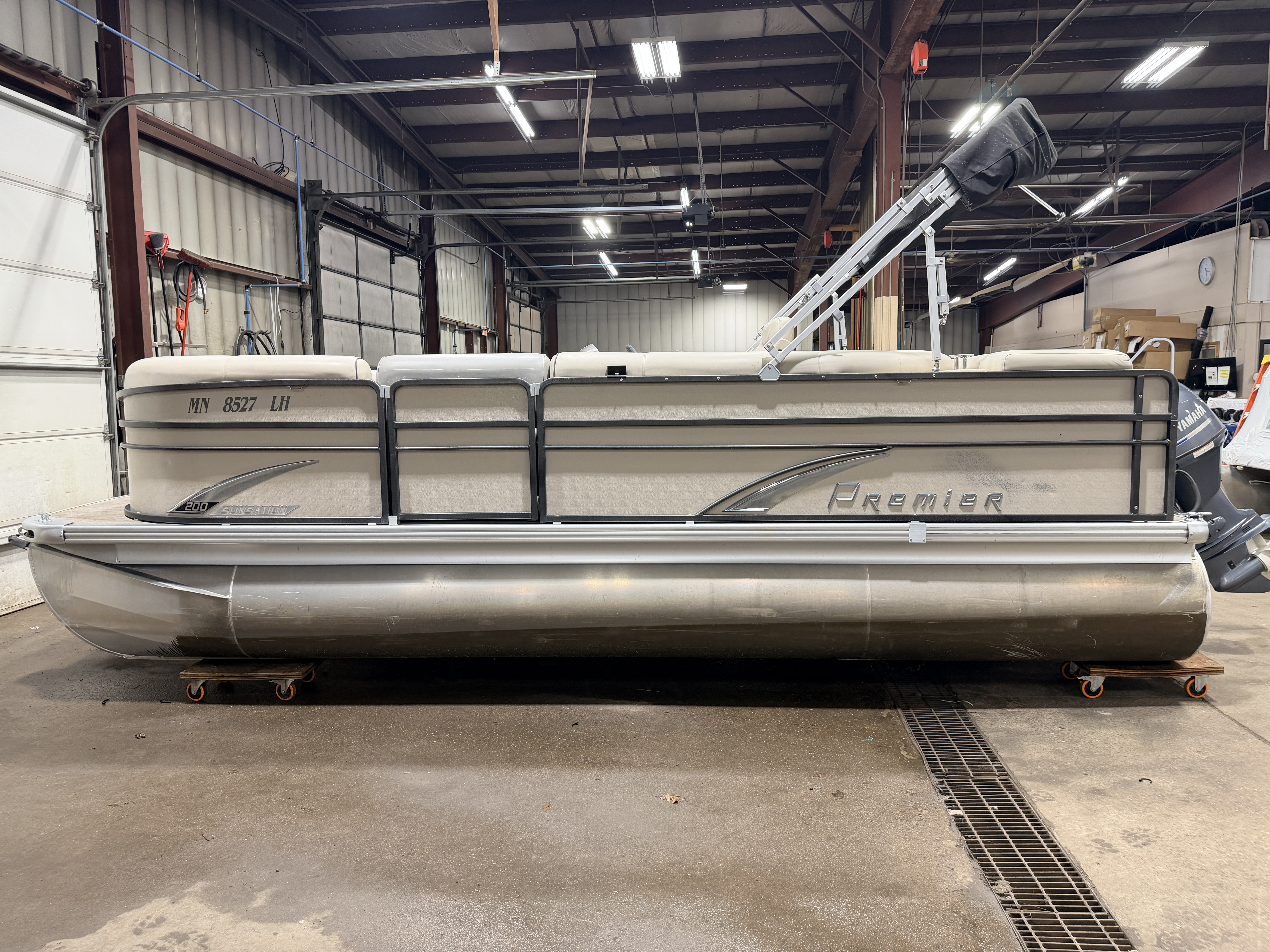 2015 Premier 200 SunSation Pontoon with 50HP Yamaha Fourstroke EFI Outboard. This cruise model pontoon features 2 couches in front along with an L-shaped couch amidships. This pontoon features modern woven vinyl flooring throughout for great looks, easy clean up and great durability. There is a table mounted at the L-shaped couch. The front end of the L-shaped couch lifts up and has storage space underneath. It is a great location for a trash receptacle, as there is also a door on the front of the couch which would go right to the trash can. The helm features 2 multi-function gauges including Speedometer and Fuel, and Tachometer and Trim. There is a Humminbird 197c GPS depth/fish finder mounted in the dash. There is a Jensen JMS2212 Marine radio with USB and auxiliary inputs. The captain's chair is a high back sport seat by Flexsteel which features swivel, slide and recline functions as well as fold up arm rests. There is a sun deck at the rear of the pontoon behind the L couch which has a flip up privacy/changing station underneath and can accommodate storage as well. Between the couch and the sun deck is a triple cup holder in which the center cup holder also has a paper towel holder built-in.