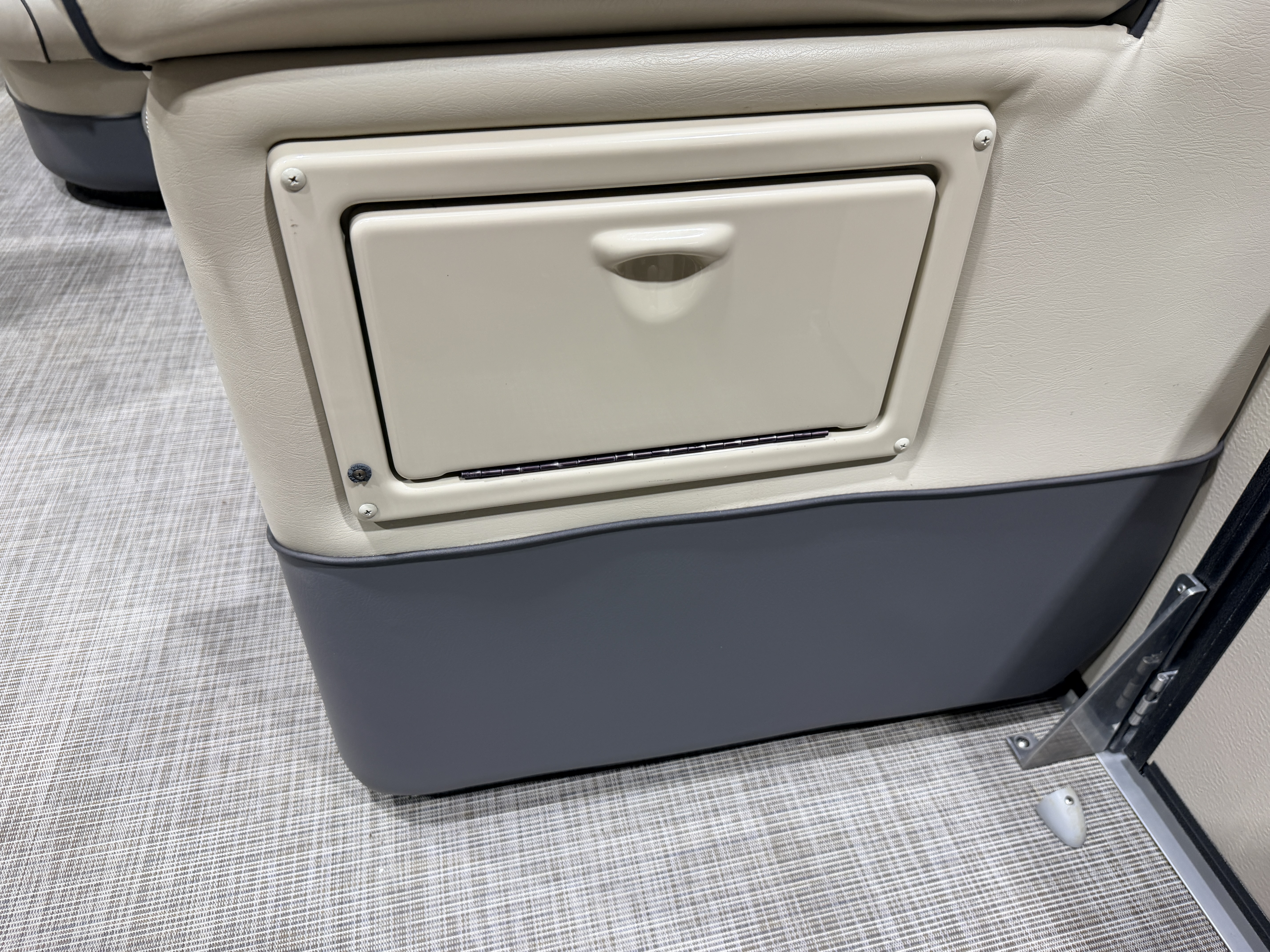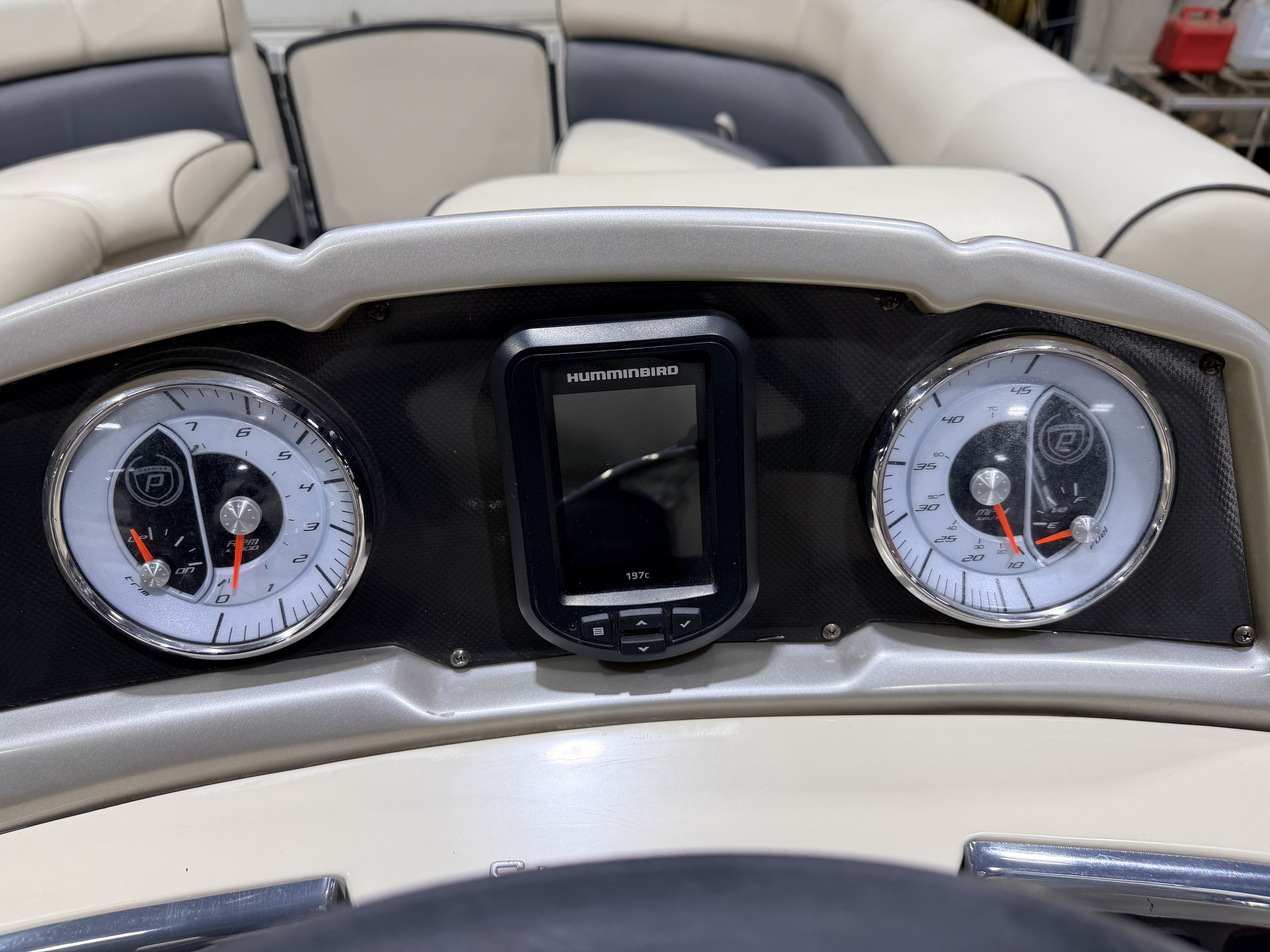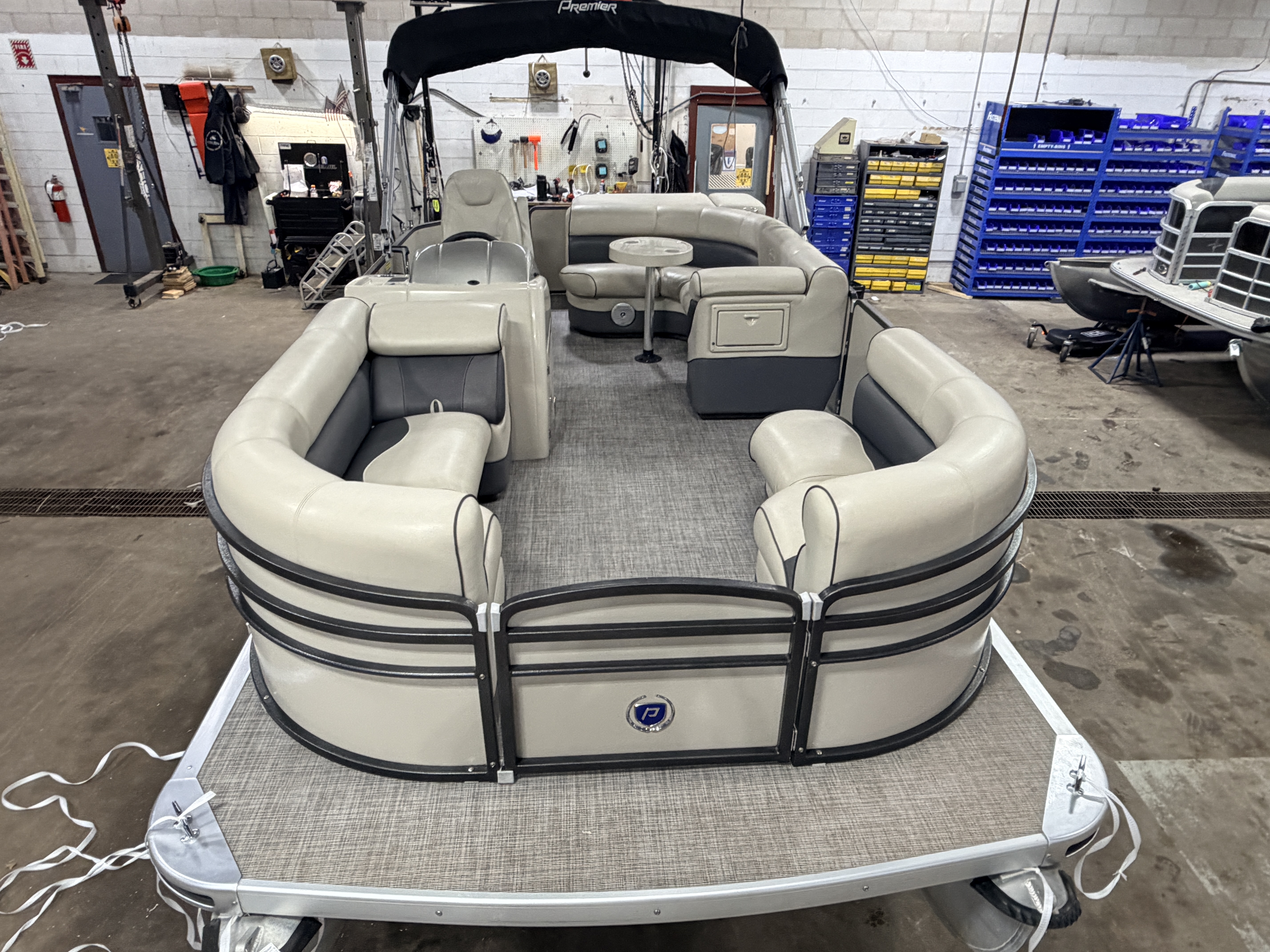 2015 Premier 200 SunSation Pontoon with 50HP Yamaha Fourstroke EFI Outboard. This cruise model pontoon features 2 couches in front along with an L-shaped couch amidships. This pontoon features modern woven vinyl flooring throughout for great looks, easy clean up and great durability. There is a table mounted at the L-shaped couch. The front end of the L-shaped couch lifts up and has storage space underneath. It is a great location for a trash receptacle, as there is also a door on the front of the couch which would go right to the trash can. The helm features 2 multi-function gauges including Speedometer and Fuel, and Tachometer and Trim. There is a Humminbird 197c GPS depth/fish finder mounted in the dash. There is a Jensen JMS2212 Marine radio with USB and auxiliary inputs. The captain's chair is a high back sport seat by Flexsteel which features swivel, slide and recline functions as well as fold up arm rests. There is a sun deck at the rear of the pontoon behind the L couch which has a flip up privacy/changing station underneath and can accommodate storage as well. Between the couch and the sun deck is a triple cup holder in which the center cup holder also has a paper towel holder built-in.