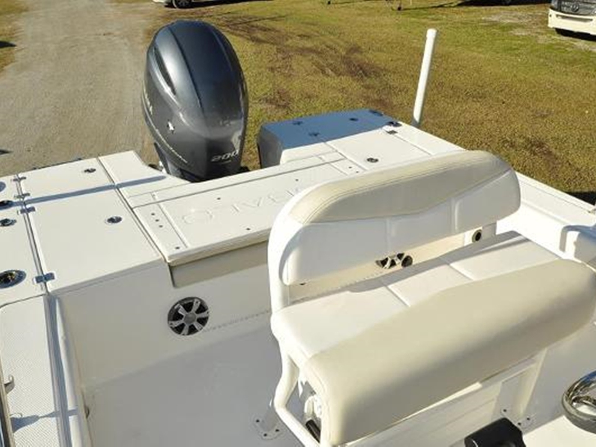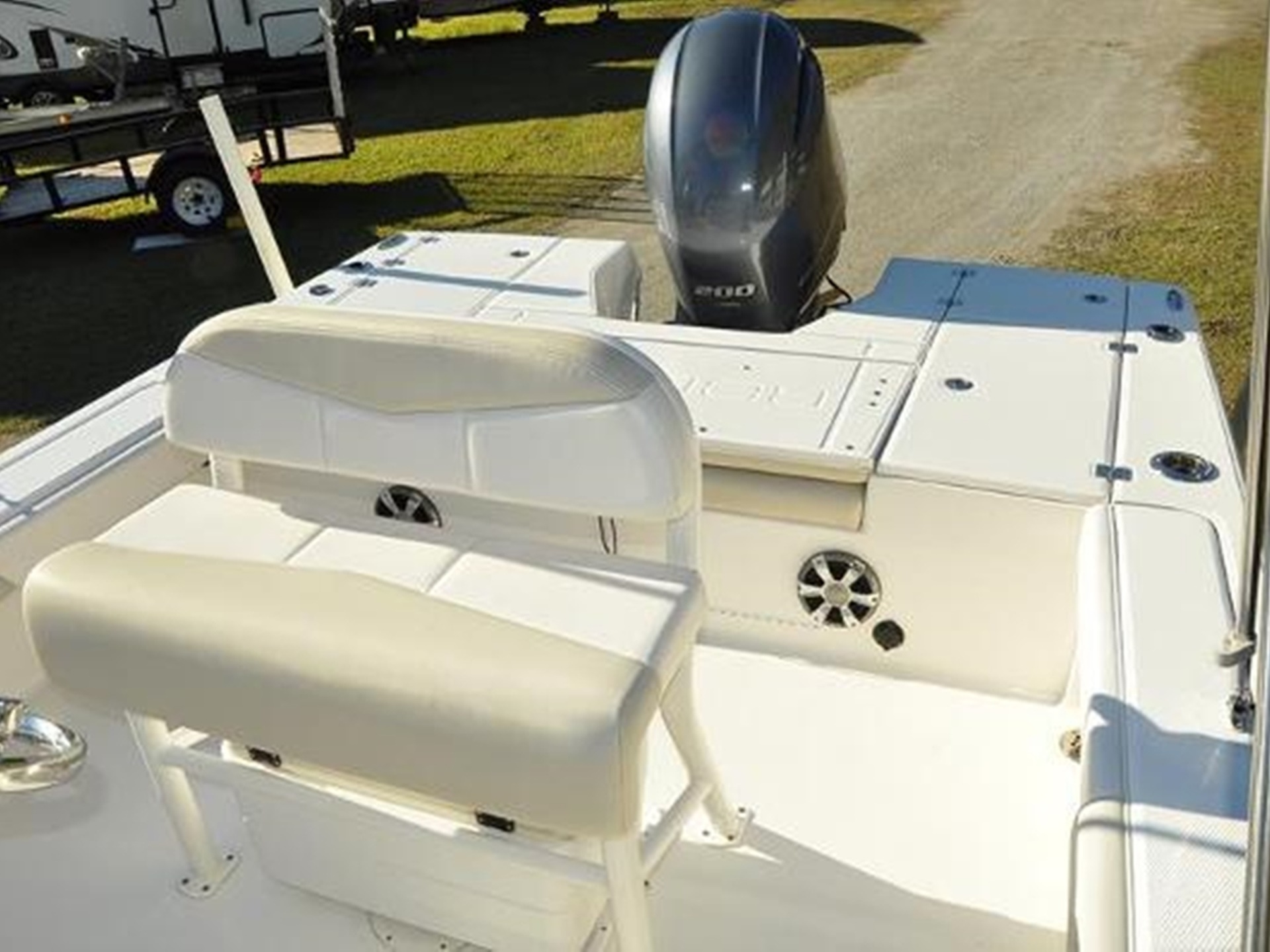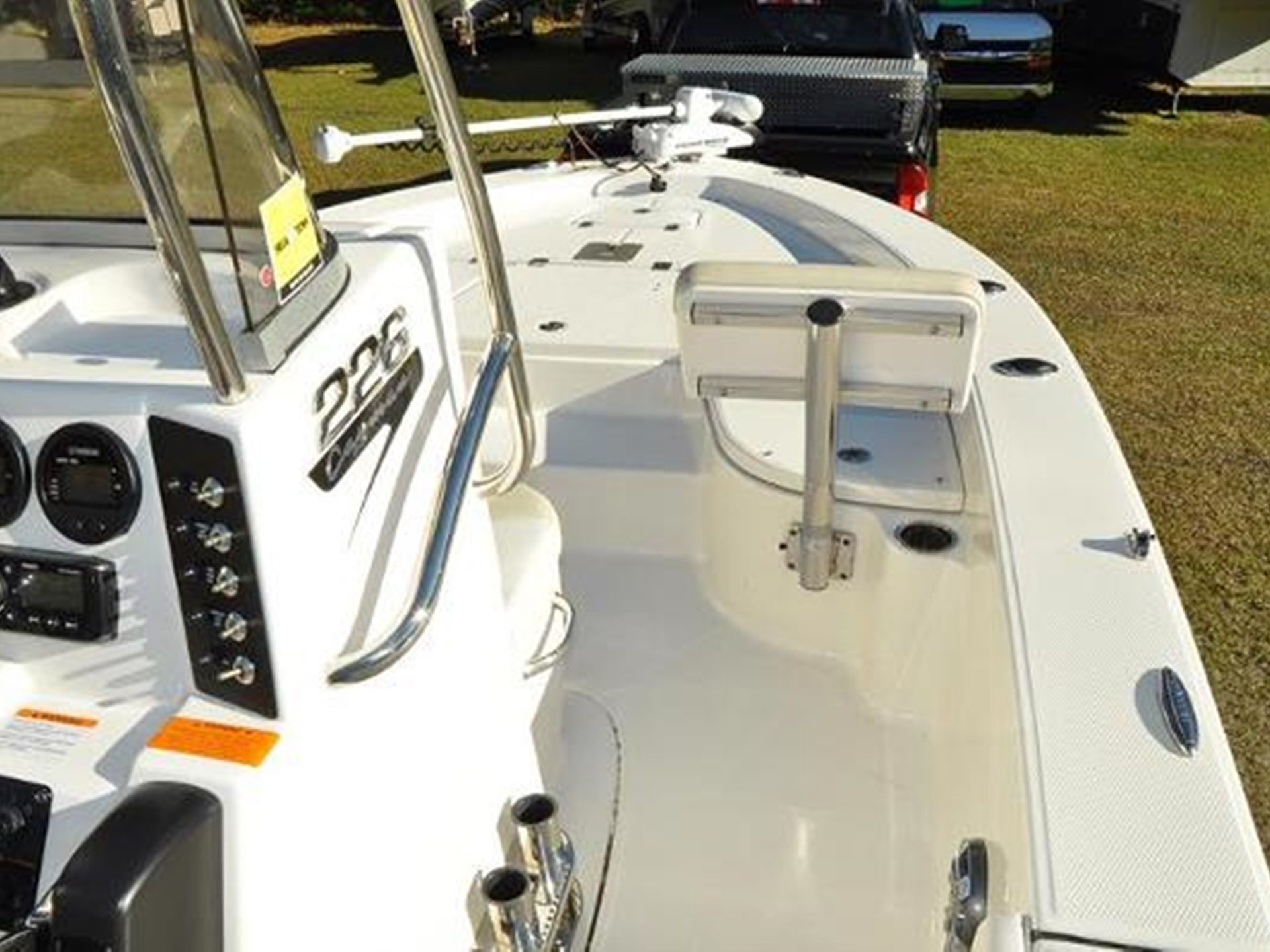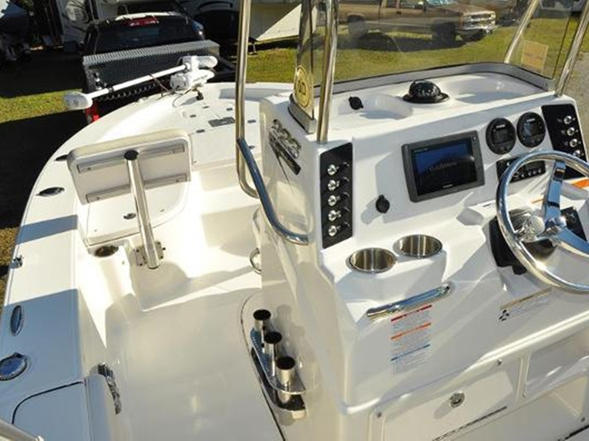Designed with comfort and functionality in mind, the boat is outfitted with bow cushions, a leaning post with backrest, two livewells, a washdown system, hydraulic steering, a head in the console, a bimini top, bow backrests, and a battery charger.