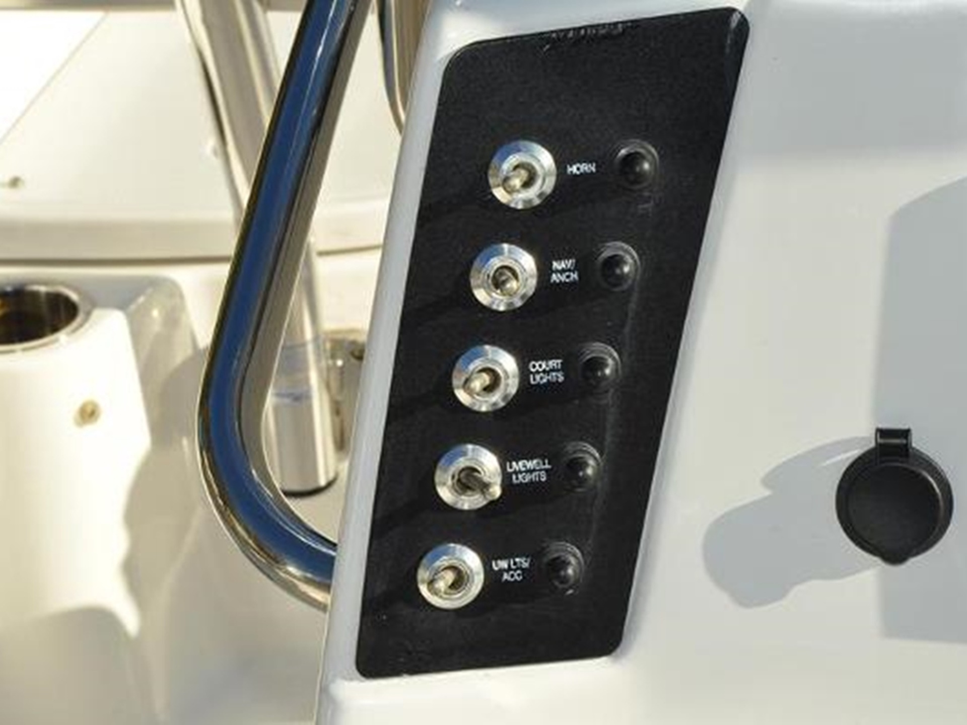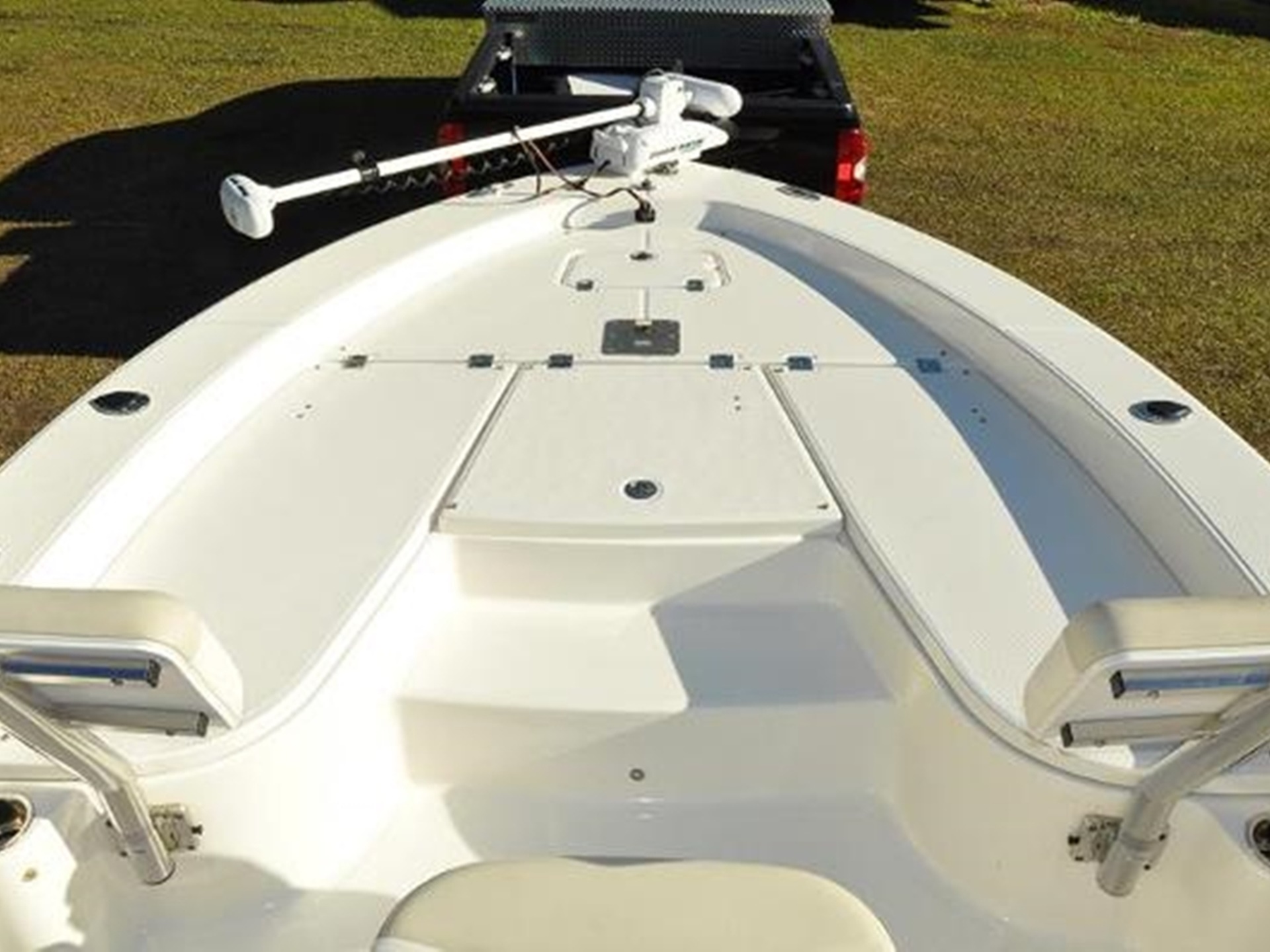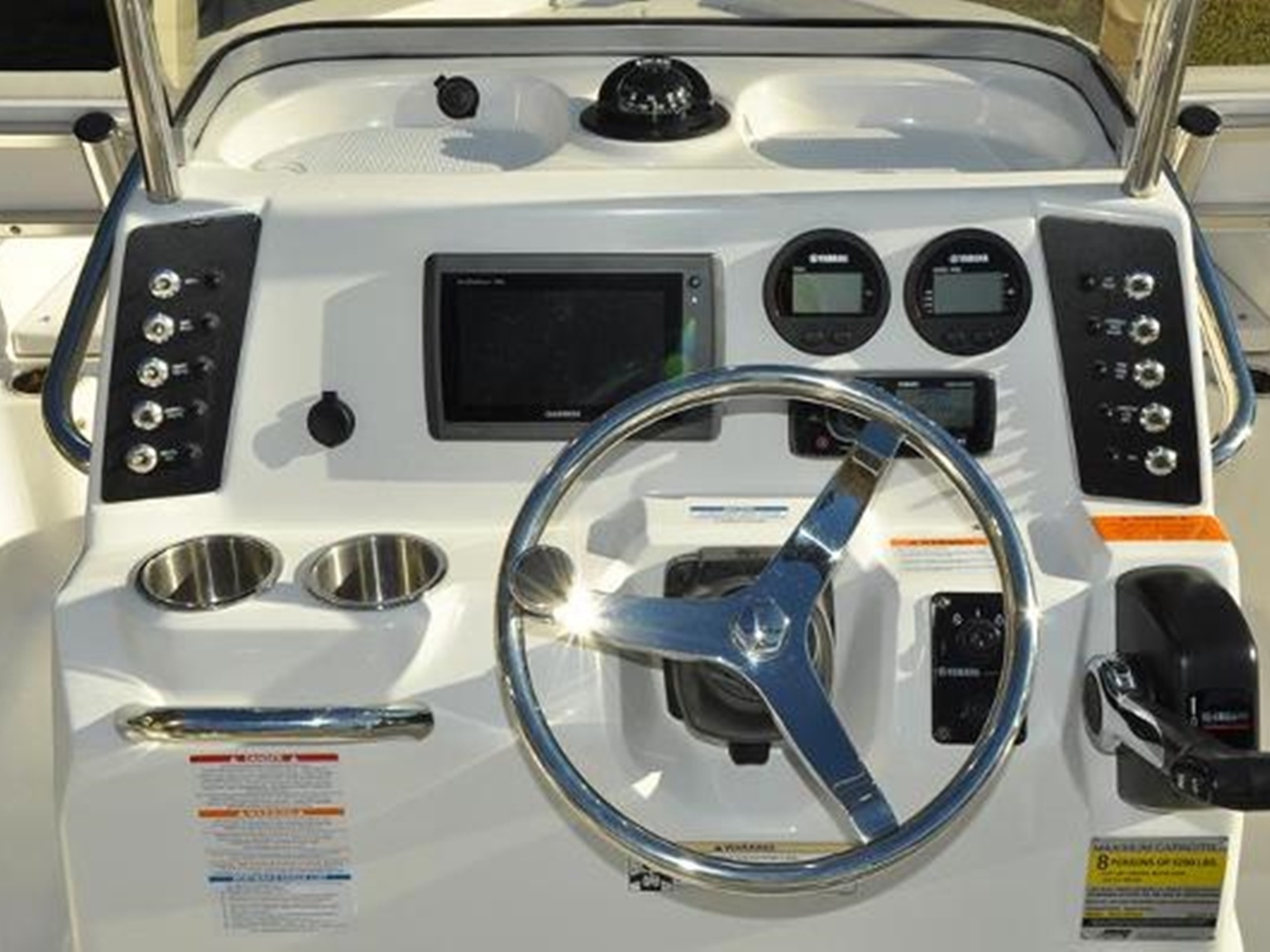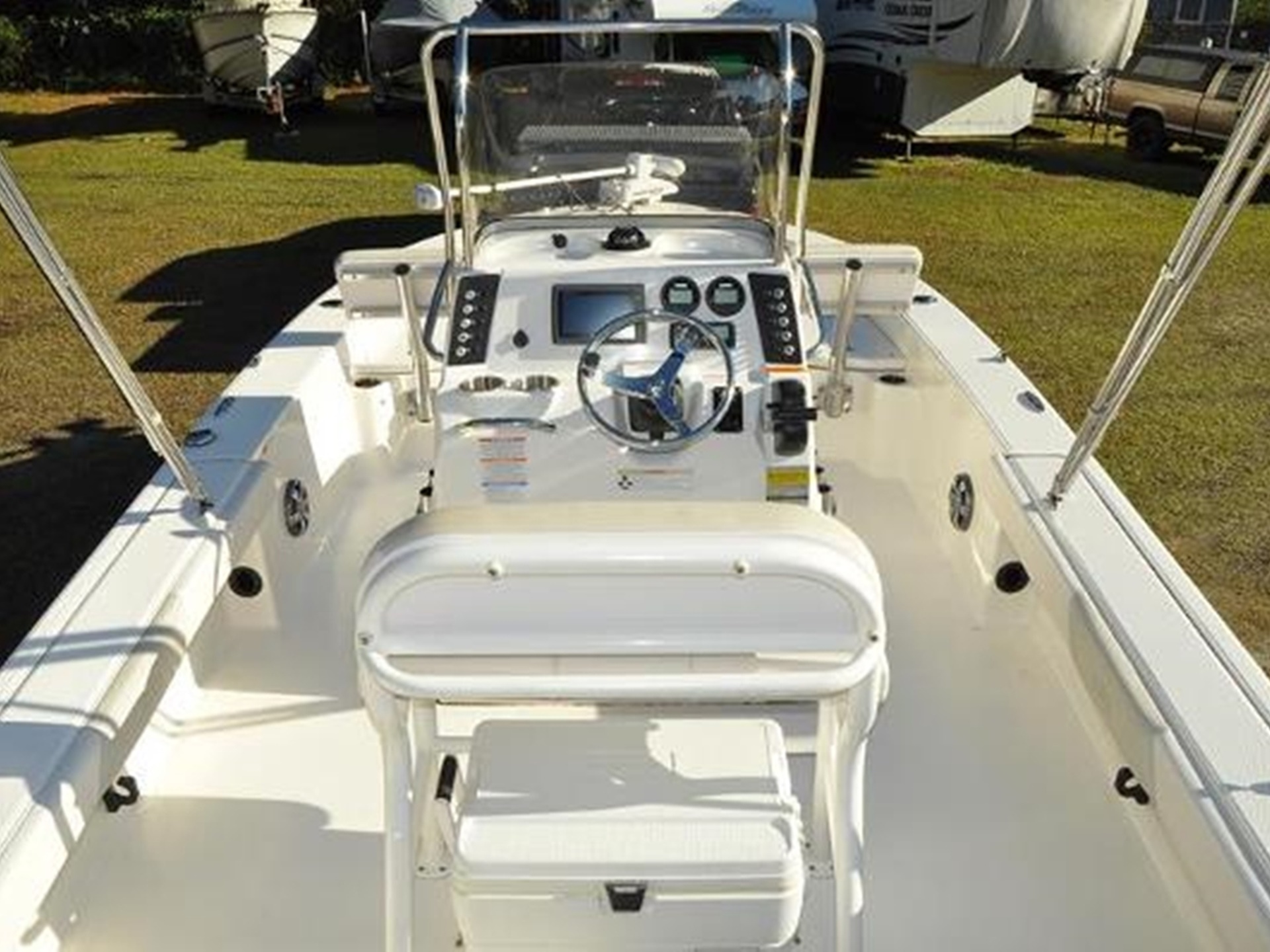 Designed with comfort and functionality in mind, the boat is outfitted with bow cushions, a leaning post with backrest, two livewells, a washdown system, hydraulic steering, a head in the console, a bimini top, bow backrests, and a battery charger.