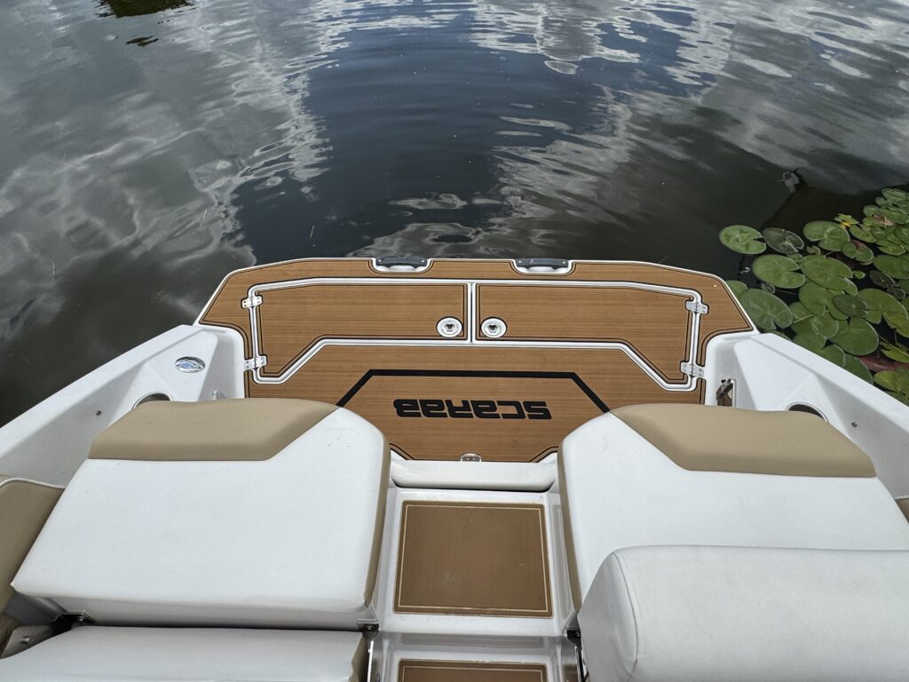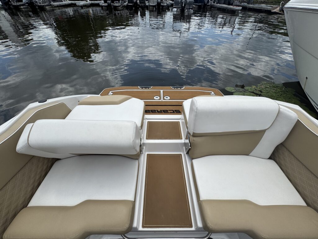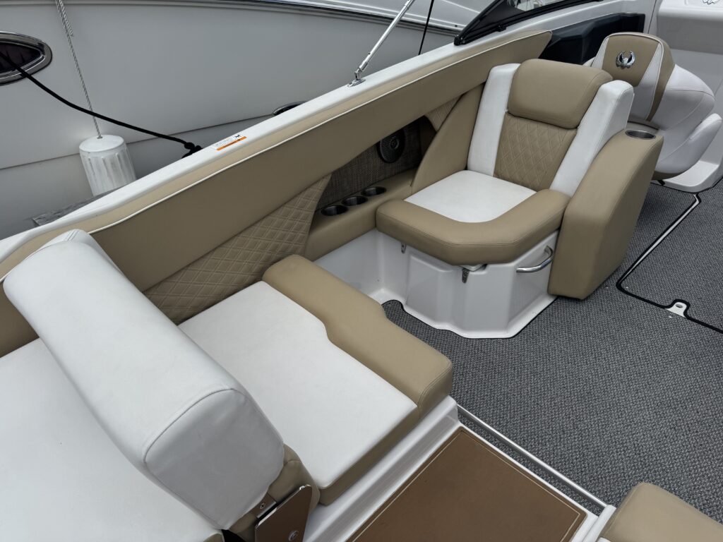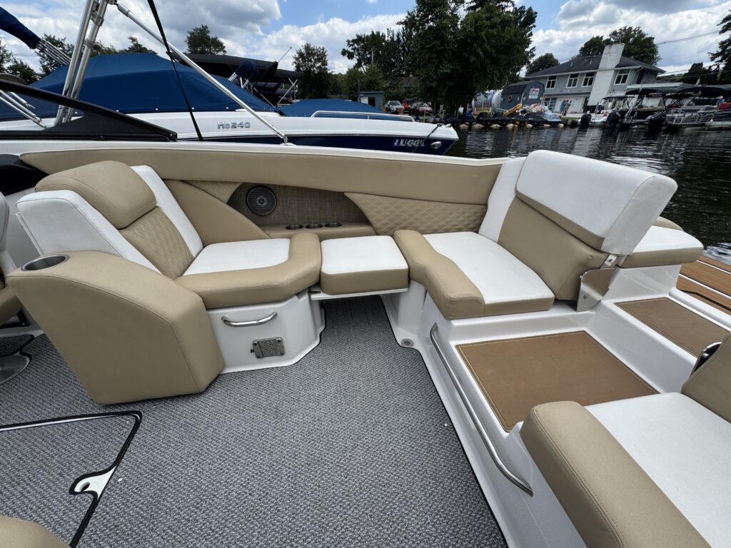Features include bimini top, snap in carpet, Bluetooth stereo with remote on dash, head with pump out, depth finder, swim platform with speakers and mat, docking lights, underwater lights, blue interior lighting, two tables, and more!