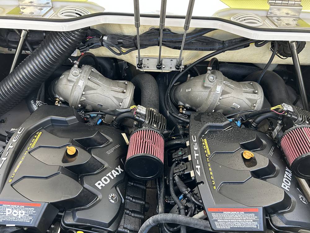 Powered by twin supercharged Rotax engines, the 215HO Impulse features a jet propulsion system that provides quick acceleration, shallow water capability, and added safety by eliminating external propellers. Its reduced draft also allows for greater access to more remote or shallow waterways.