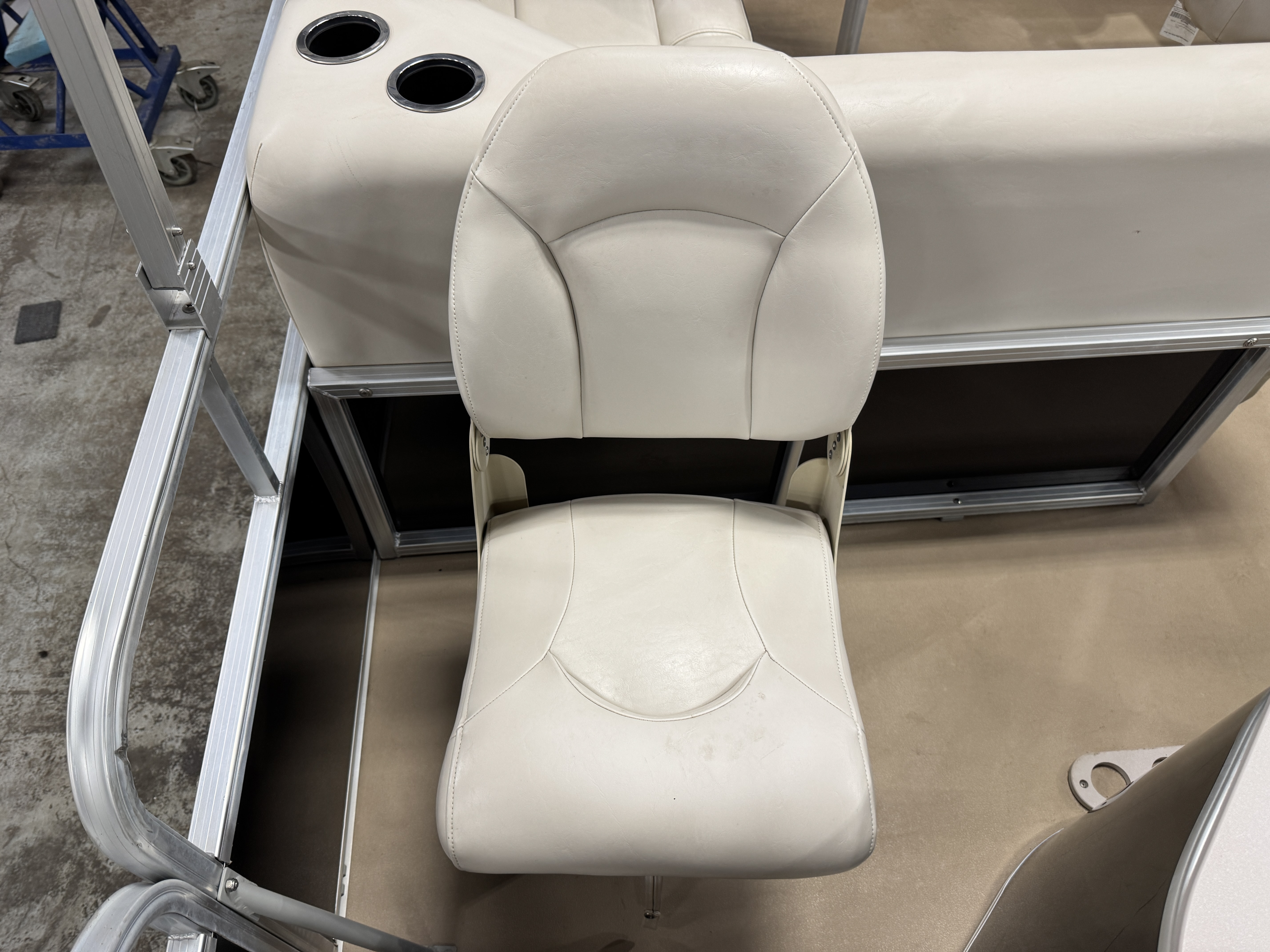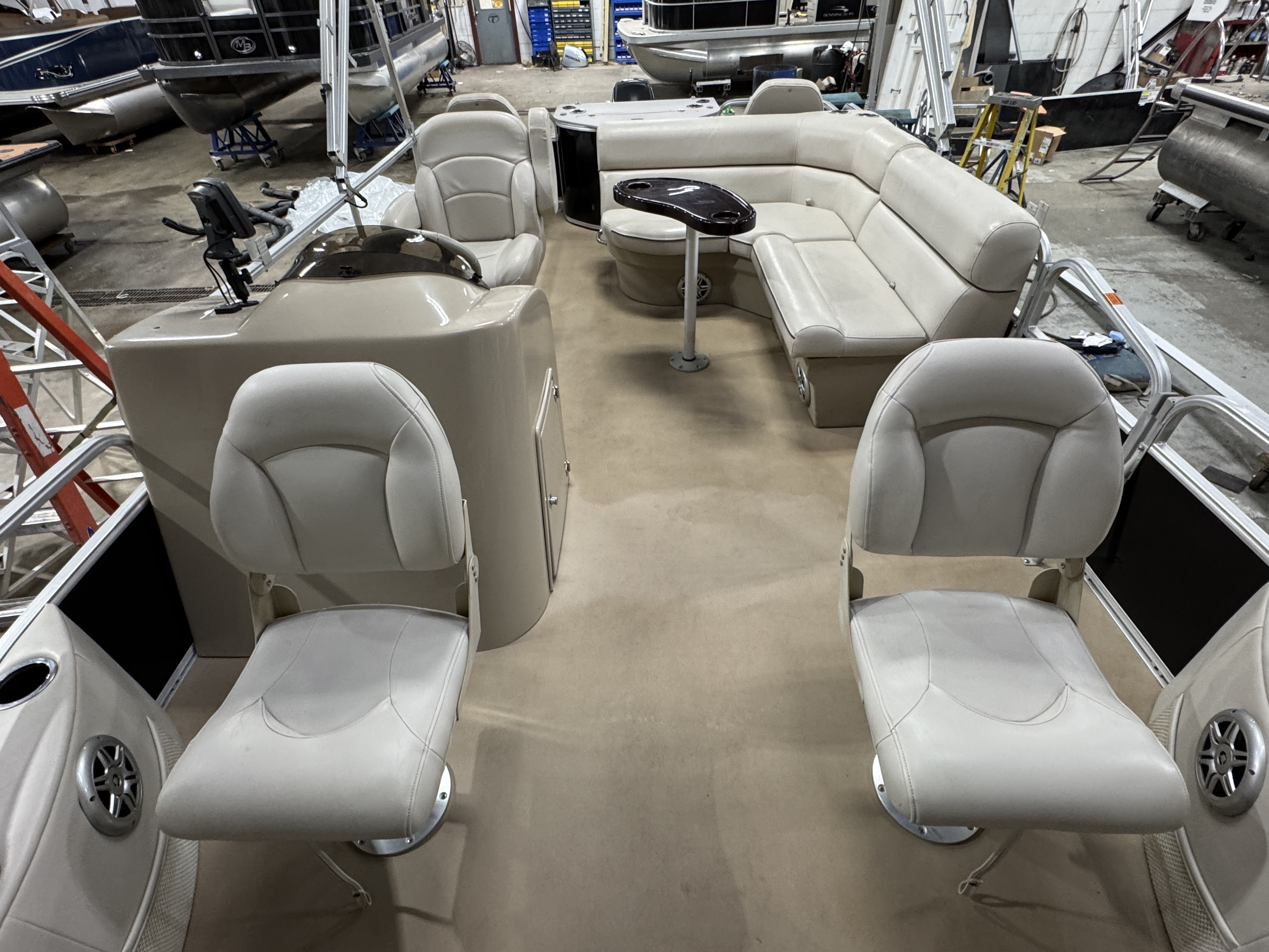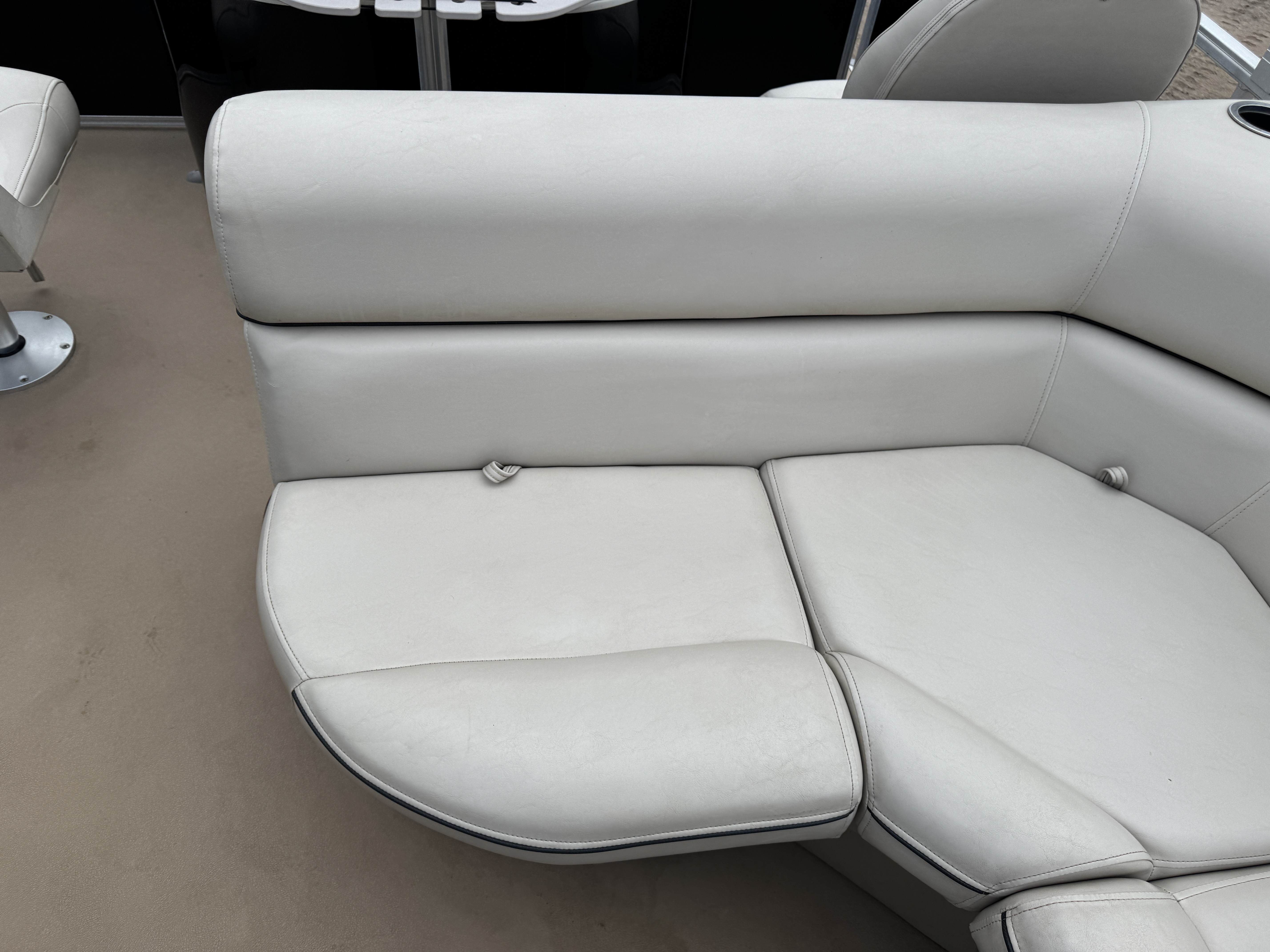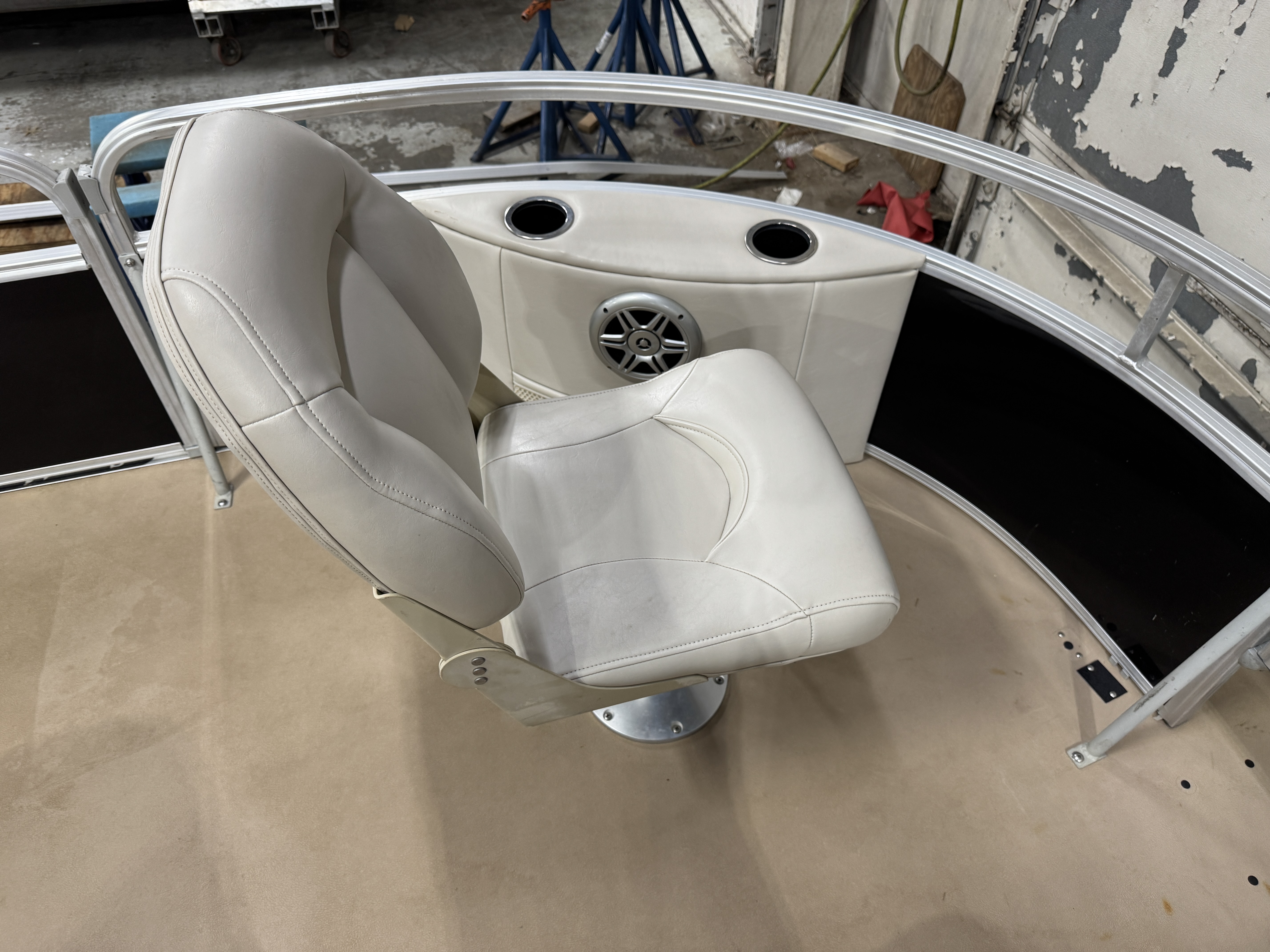 each corner of the pontoon. The front fishing seats have a mini console in the