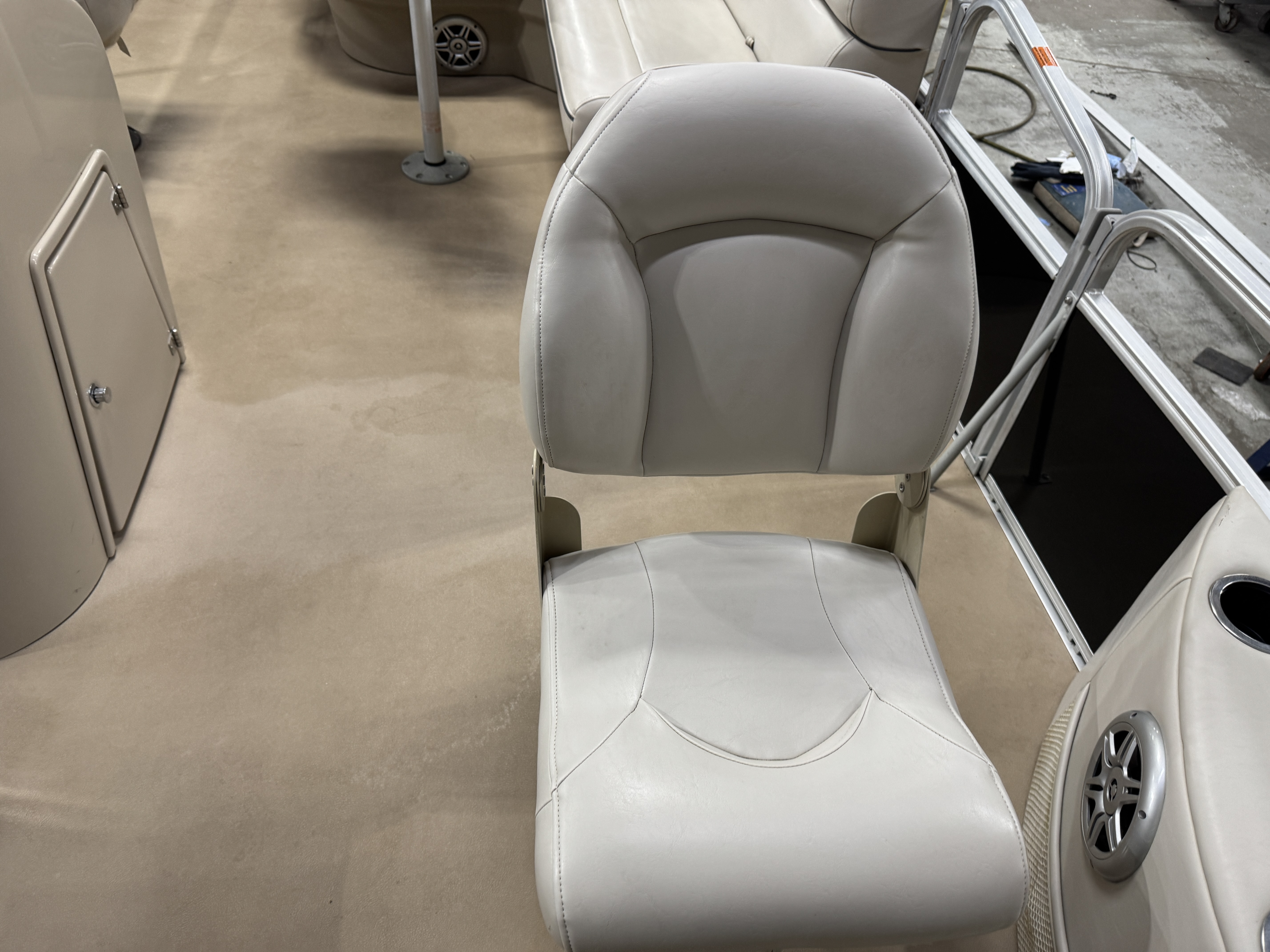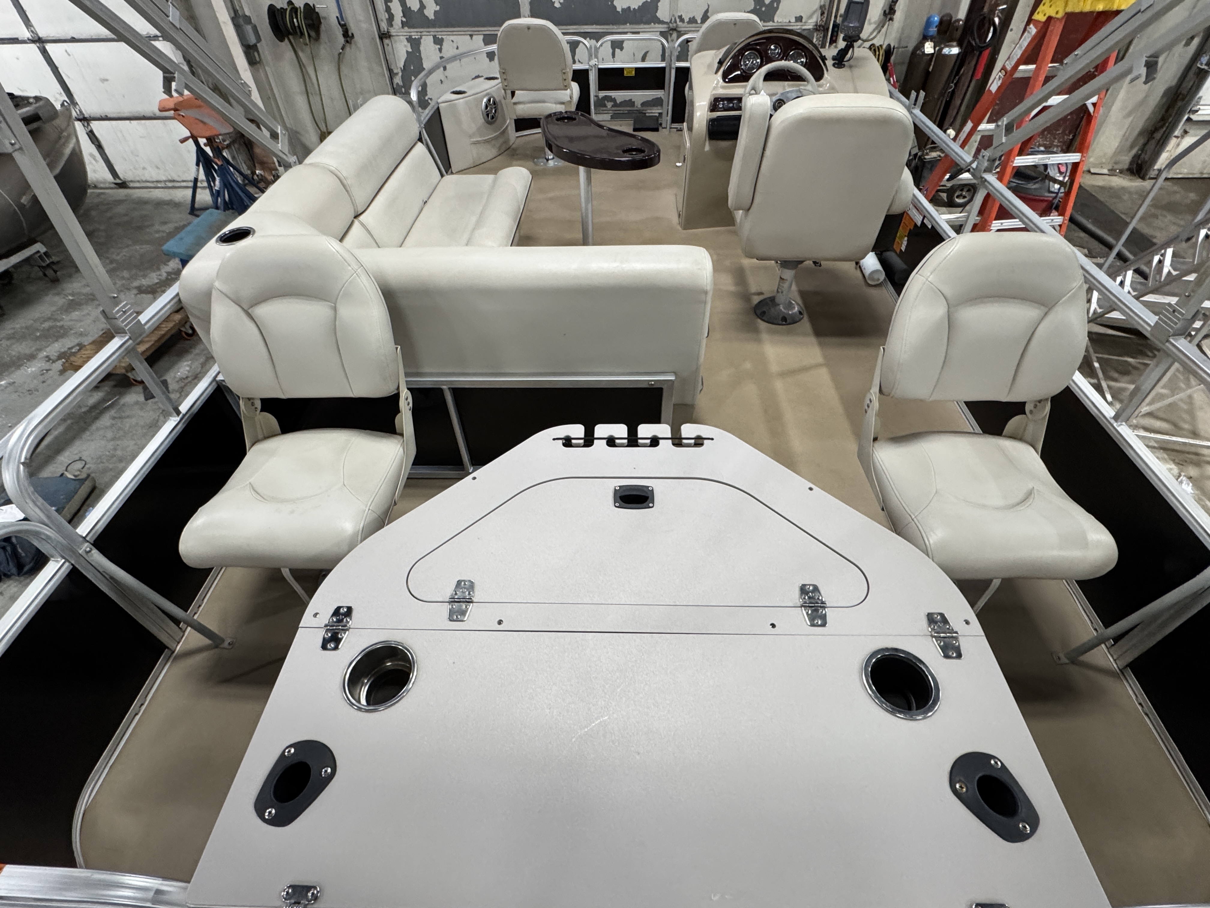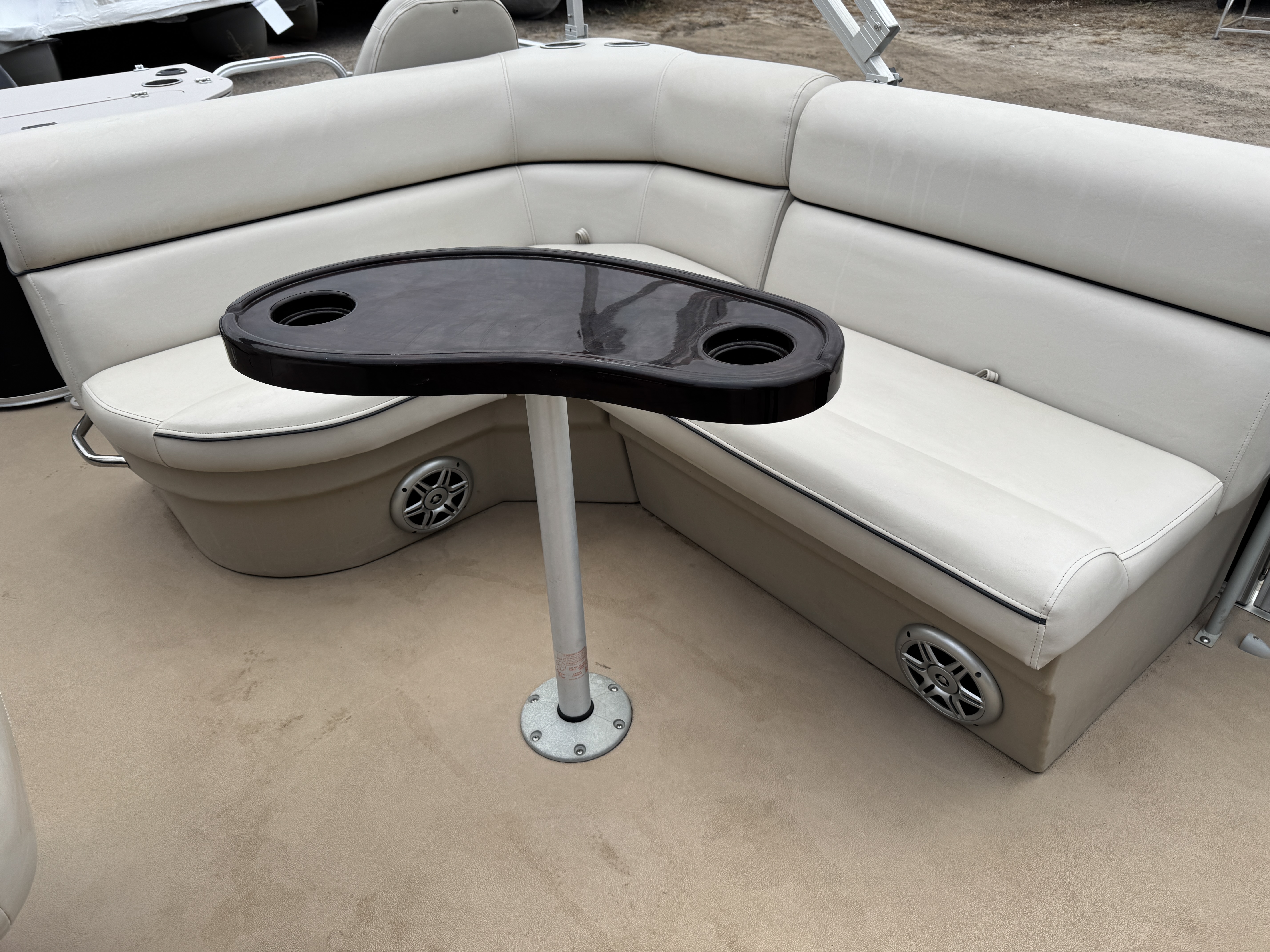 each corner of the pontoon. The front fishing seats have a mini console in the