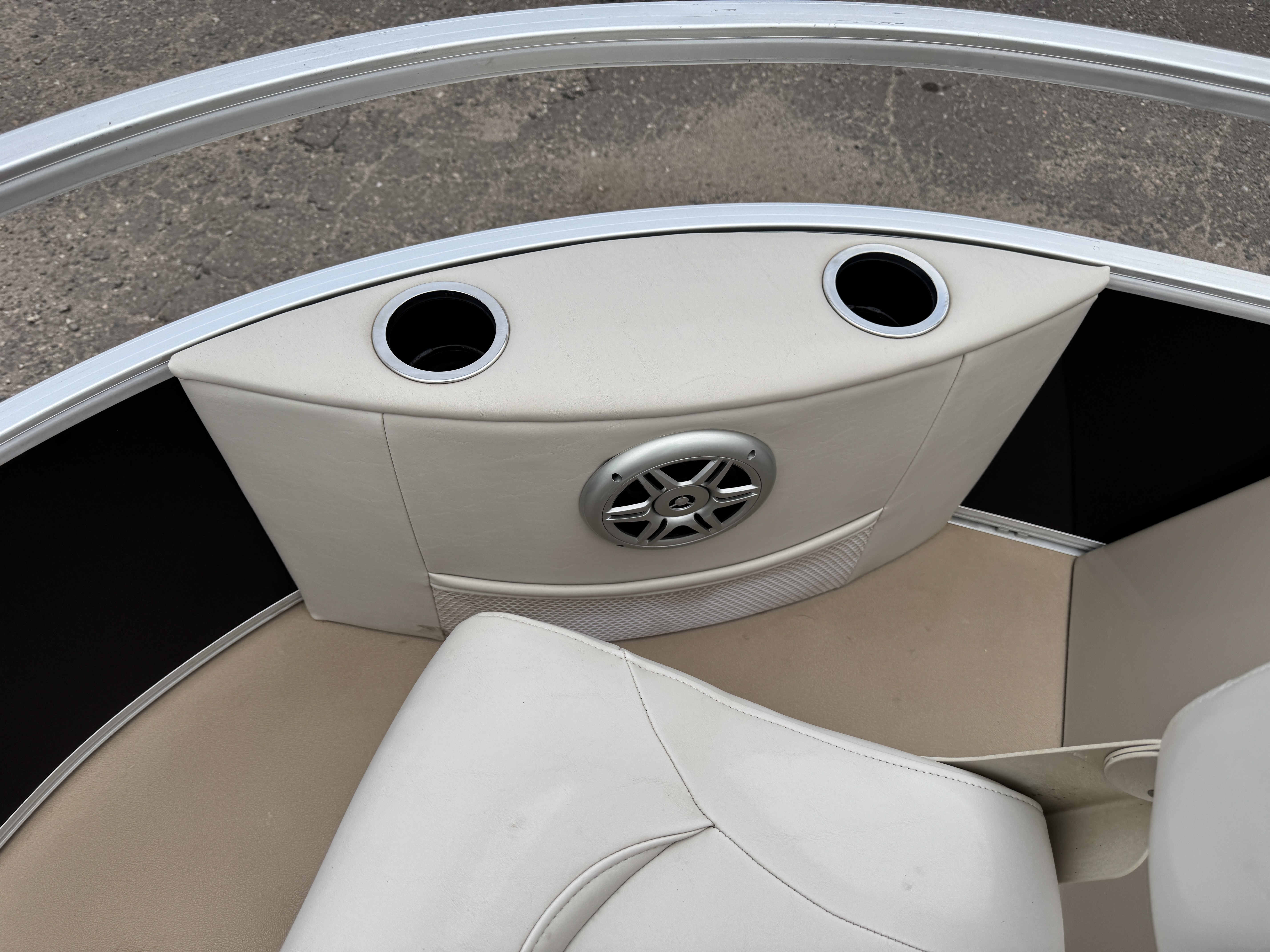 corners with 2 cup holders, a stereo speaker and a net storage pocket. There is
