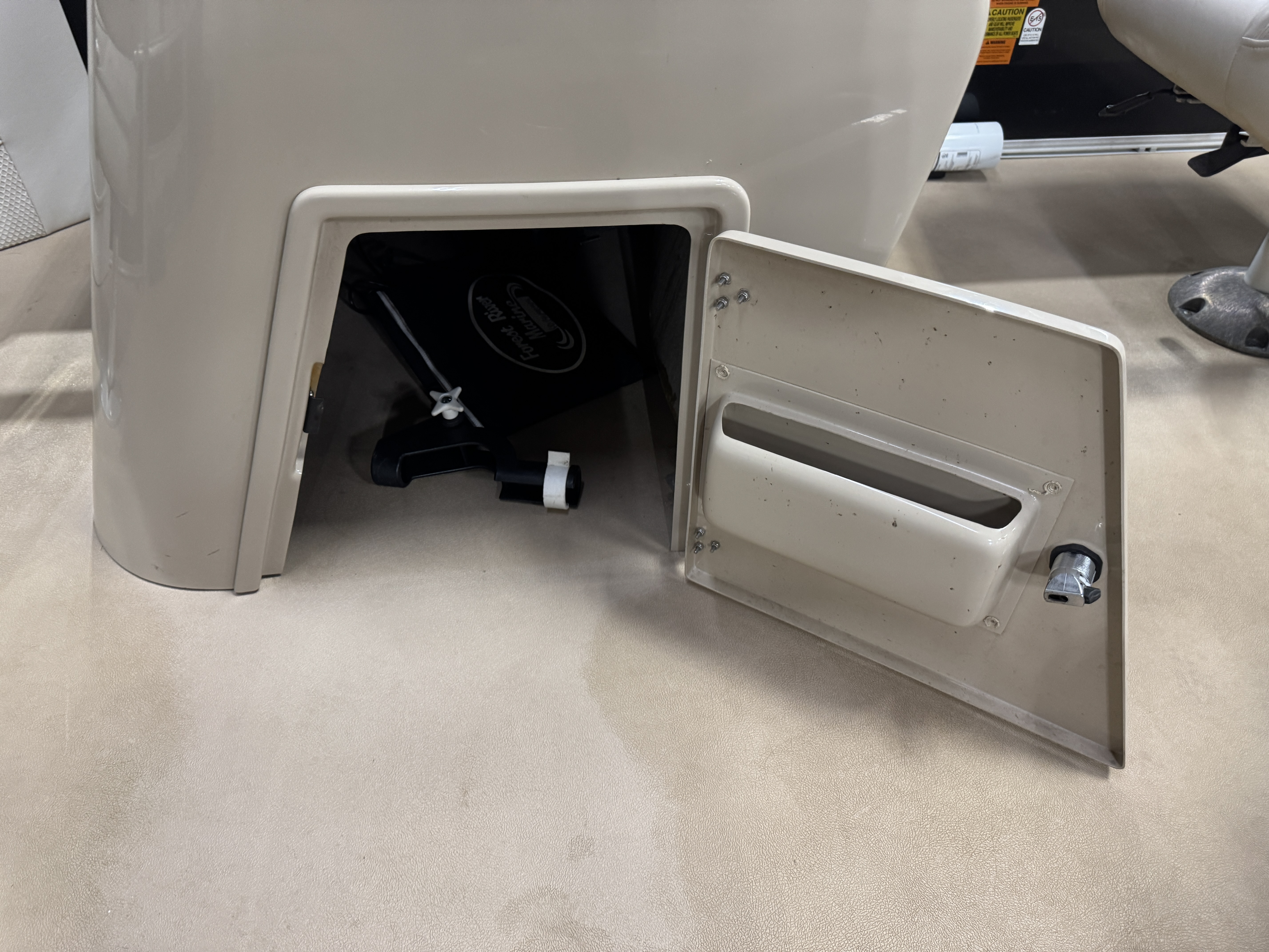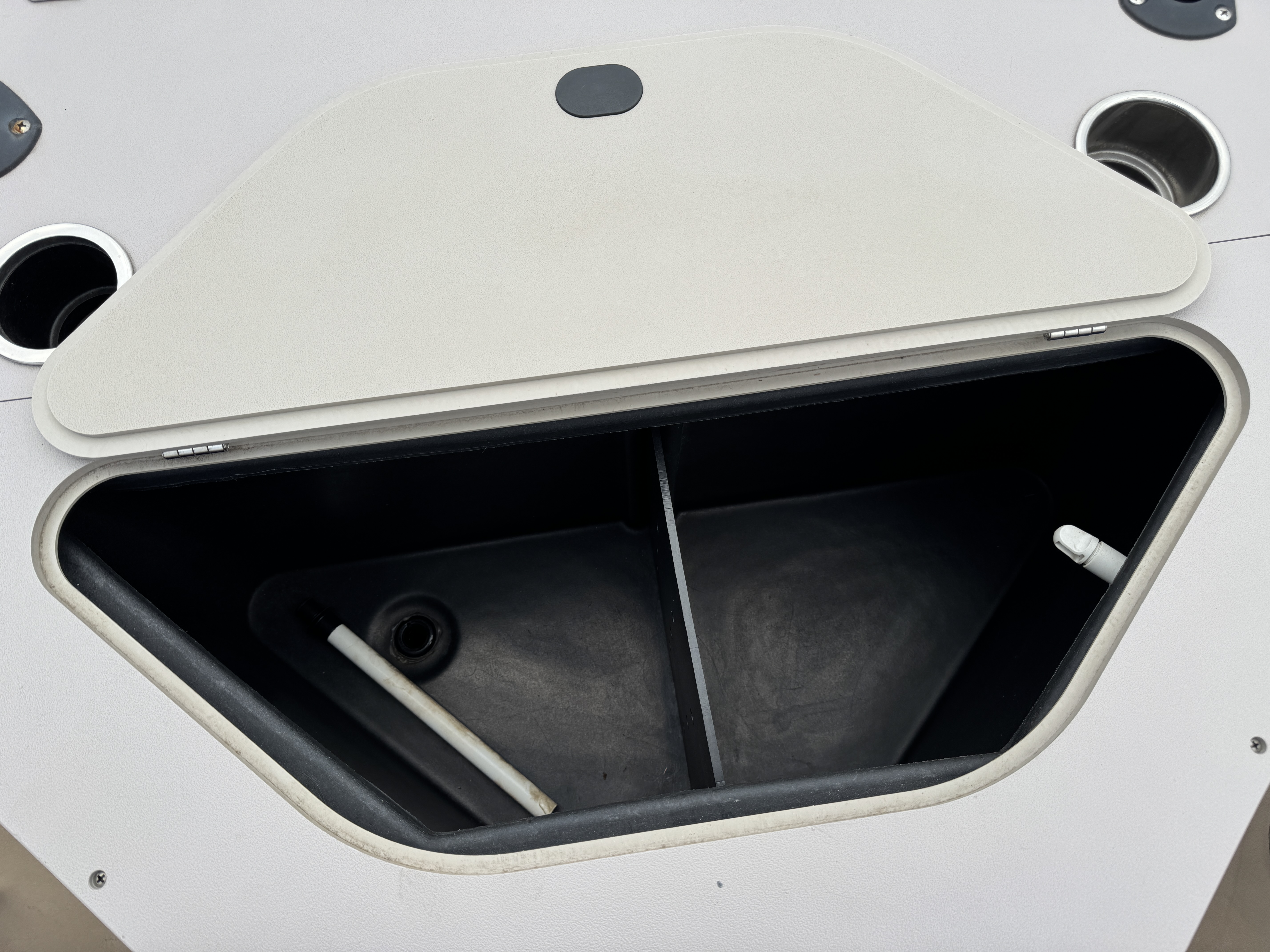 Lowrance M68c depth/fish finder. The rear fishing seats have a livewell between