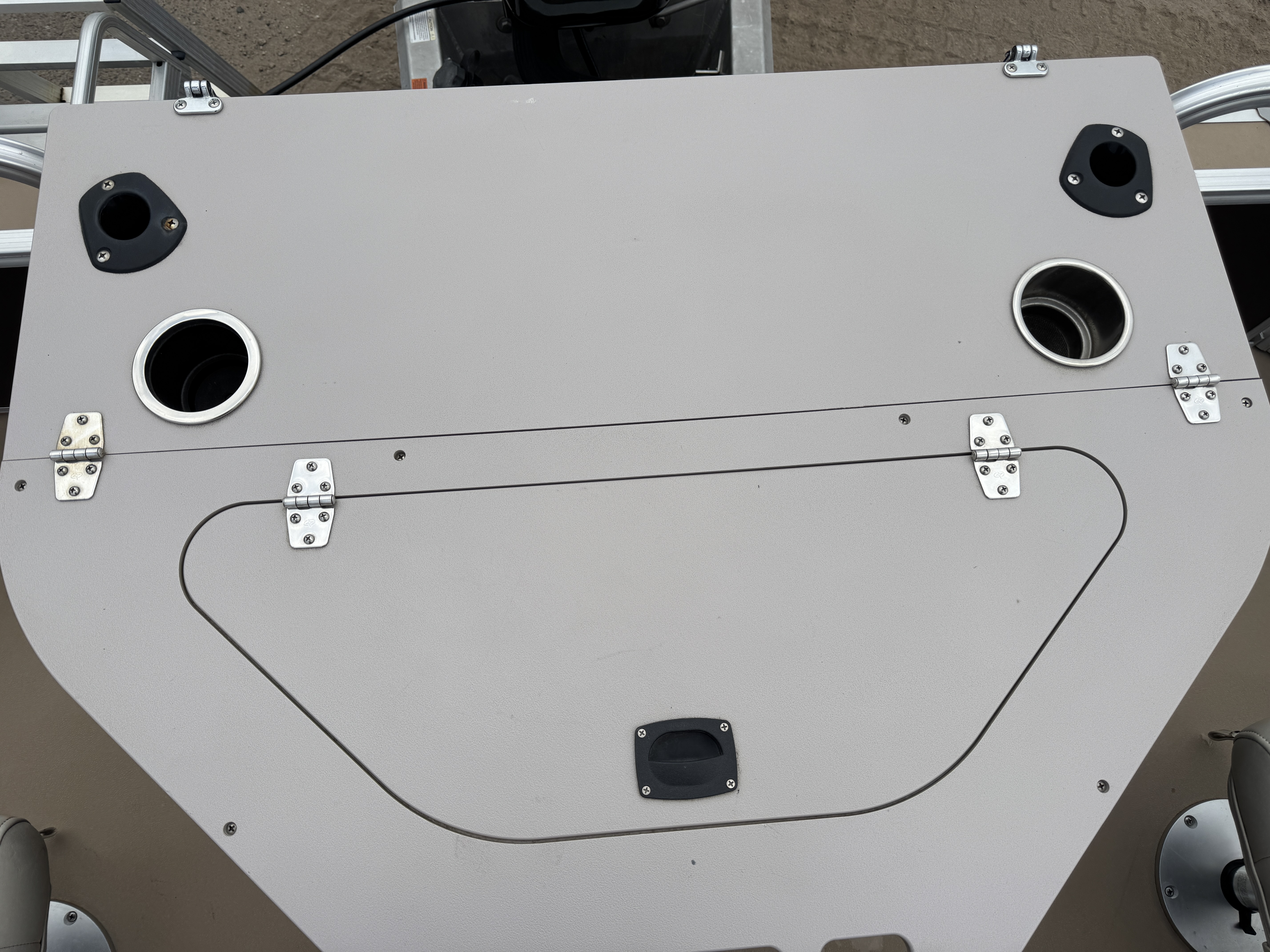This 4 corner fishing layout pontoon features 4 fold down fishing seats; 1 in