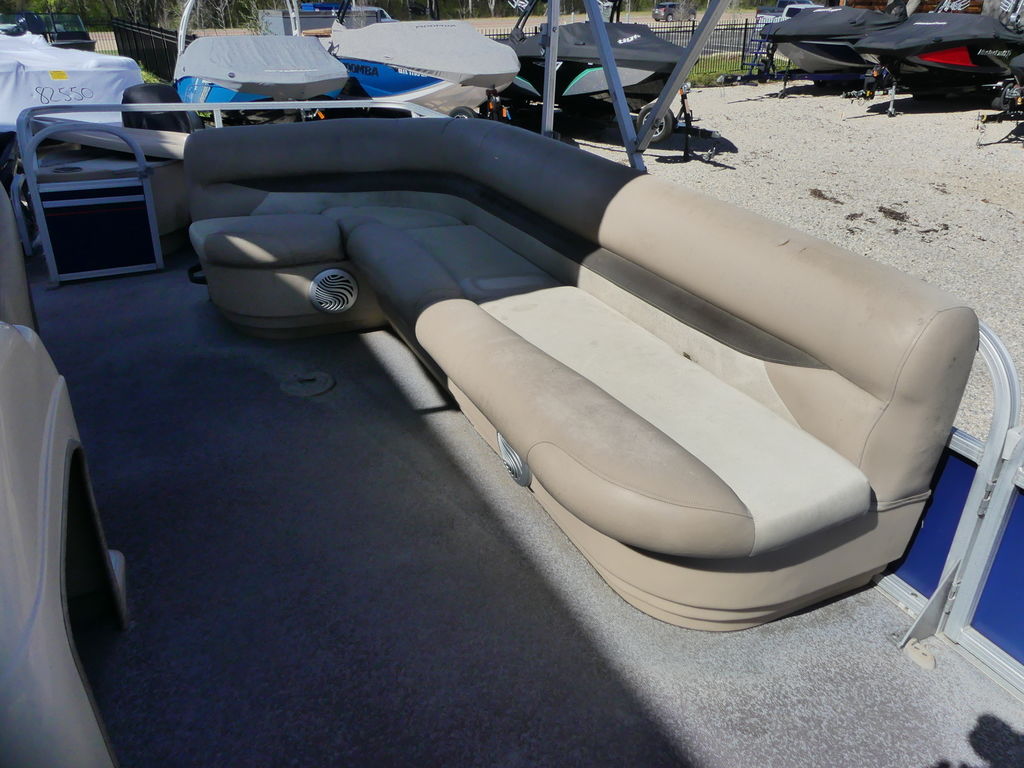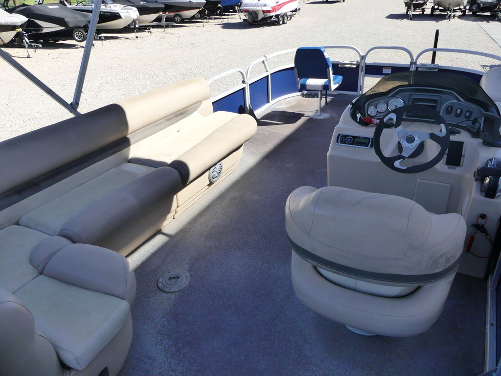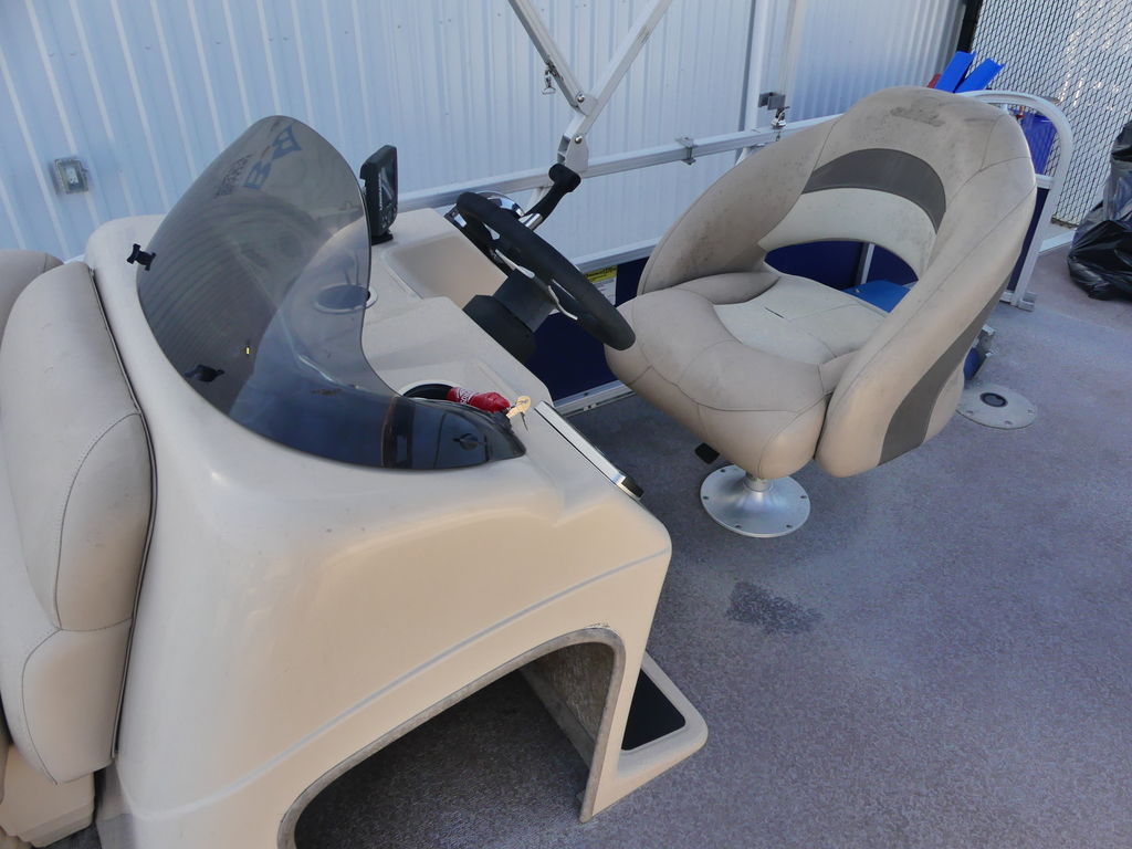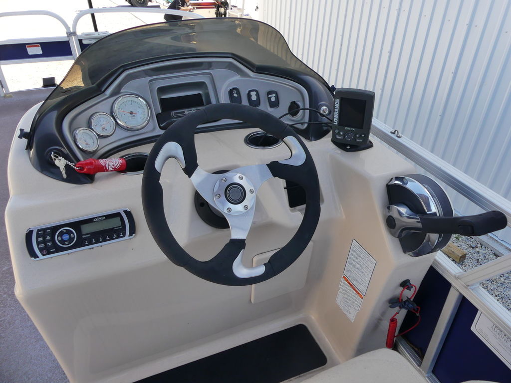 With room for a crew of up to 10, the FISHIN' BARGE 20 DLX is fully equipped to make your time on the water a pure joy for everyone in the family.At the helm, the captain will find a redesigned console with every convenience you can imagine, including a re-positioned binnacle throttle control and a new wraparound sport shroud with removable hood.Anglers will love the 3 fishing chairs (2 fore and 1 aft), the multiple rod holders, and the two aerated livewells. Parents will appreciate the safety of the inward-opening, dual-latching gates. And everyone will notice the smooth ride provided by the multichambered 24" pontoon logs with wave deflectors and internal bracing.Bottom line: the FISHIN' BARGE 20 DLX offers a huge amount of fun-packed features and the quality construction that SUN TRACKER is known for. It's a smart investment in the outdoors that will bring family and friends closer for years to come!
