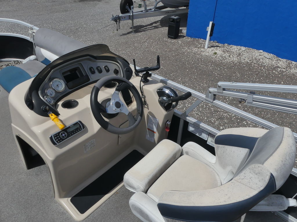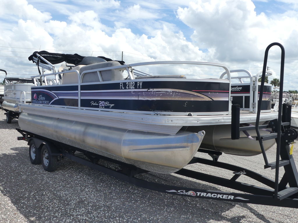 With room for a crew of up to 10, the FISHIN' BARGE 20 DLX is fully equipped to make your time on the water a pure joy for everyone in the family.At the helm, the captain will find a redesigned console with every convenience you can imagine, including a re-positioned binnacle throttle control and a new wraparound sport shroud with removable hood.Anglers will love the 3 fishing chairs (2 fore and 1 aft), the multiple rod holders, and the two aerated livewells. Parents will appreciate the safety of the inward-opening, dual-latching gates. And everyone will notice the smooth ride provided by the multichambered 24" pontoon logs with wave deflectors and internal bracing.Bottom line: the FISHIN' BARGE 20 DLX offers a huge amount of fun-packed features and the quality construction that SUN TRACKER is known for. It's a smart investment in the outdoors that will bring family and friends closer for years to come!