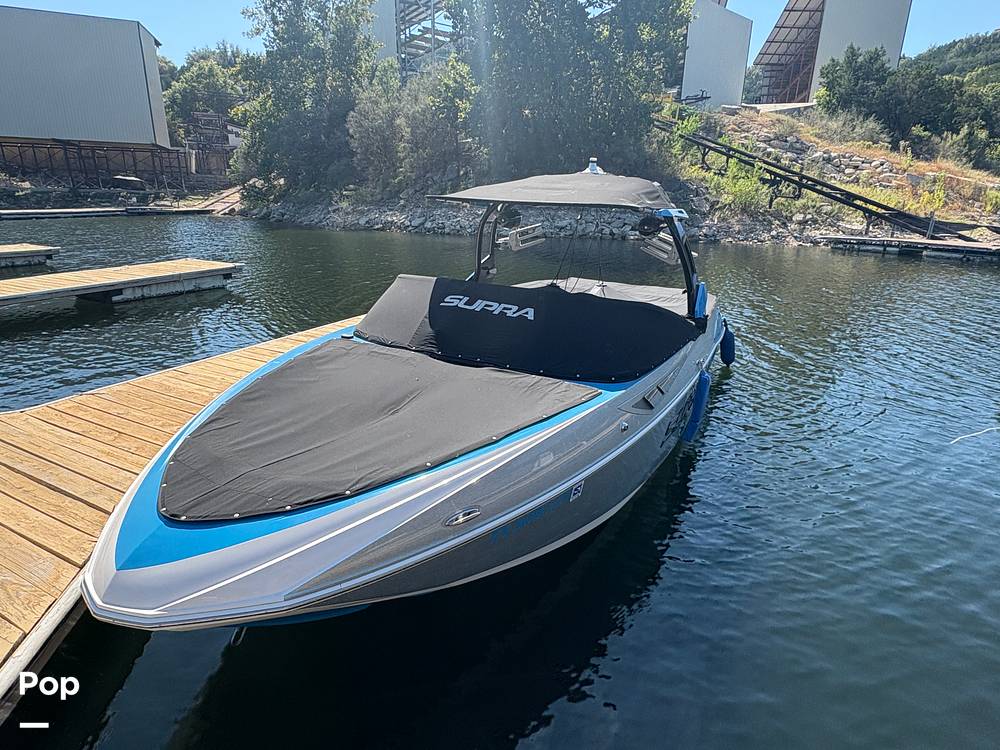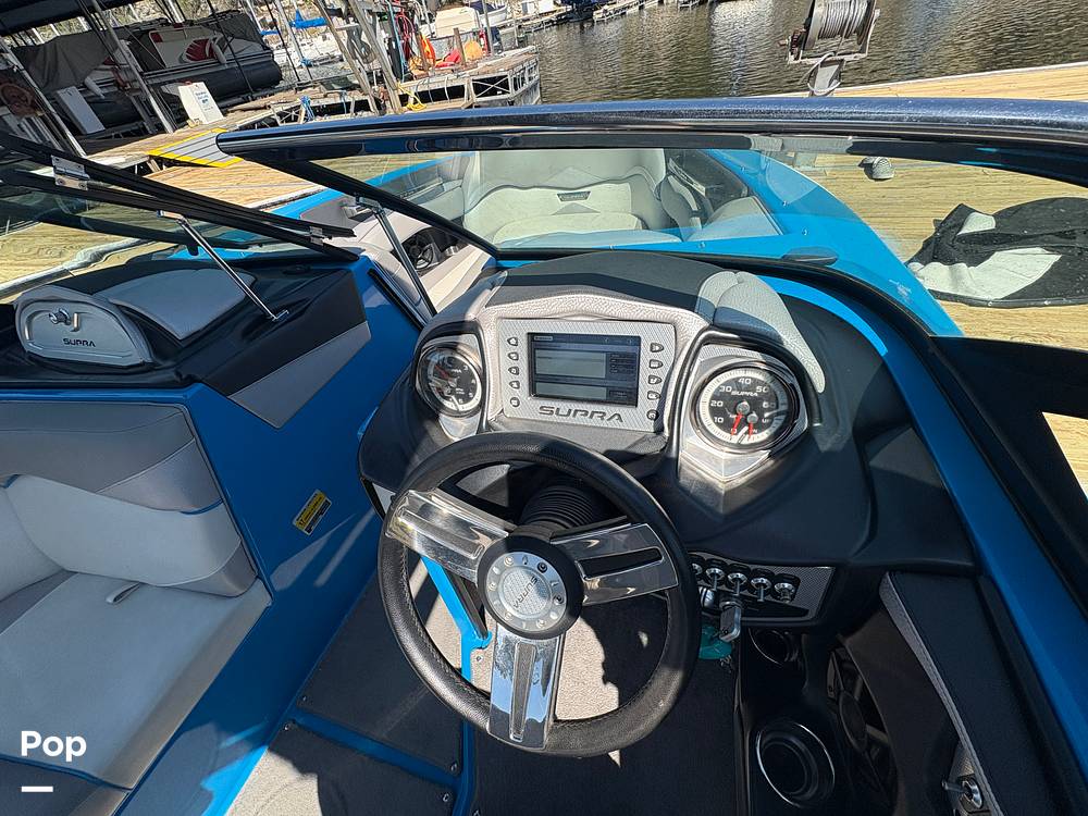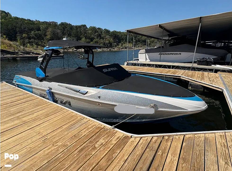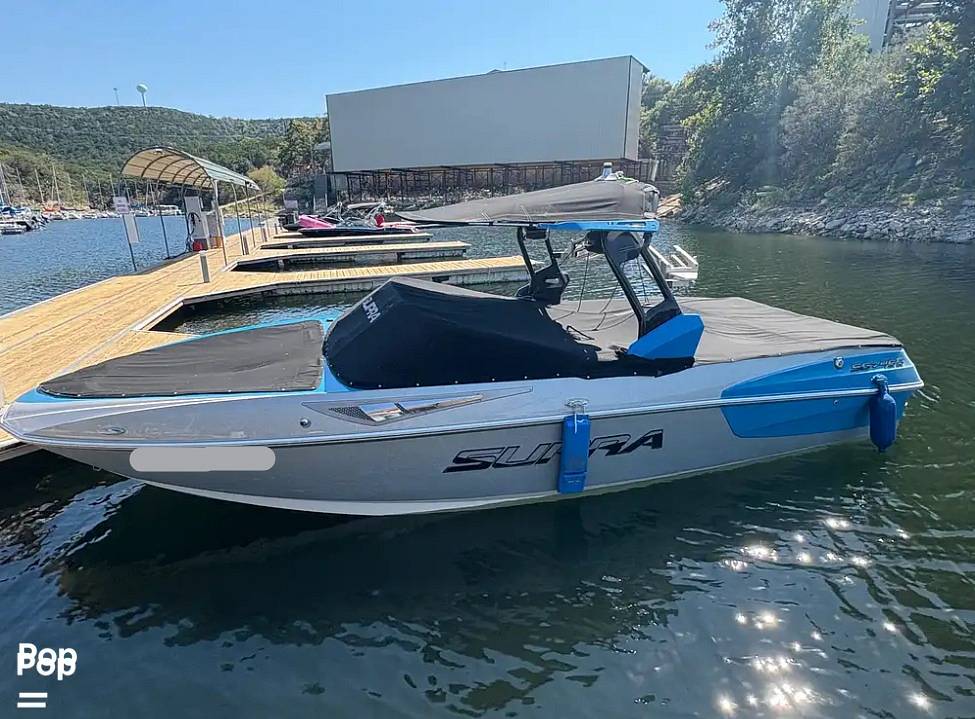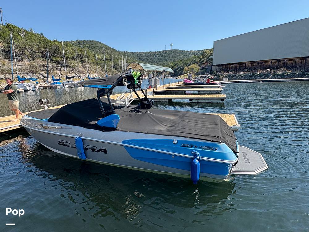 The 2015 Supra SG450 is a large, premium ski/wakeboard/surf boat, built for serious water sports performance while still delivering roomy comfort and luxury. At its heart is a Raptor 440 V8 engine by Indmar (a 6.2-litre inboard), which delivers strong low-end torque and ample power to haul heavy ballast and big loads, get the boat up on plane quickly, and make large wakes or surf waves.