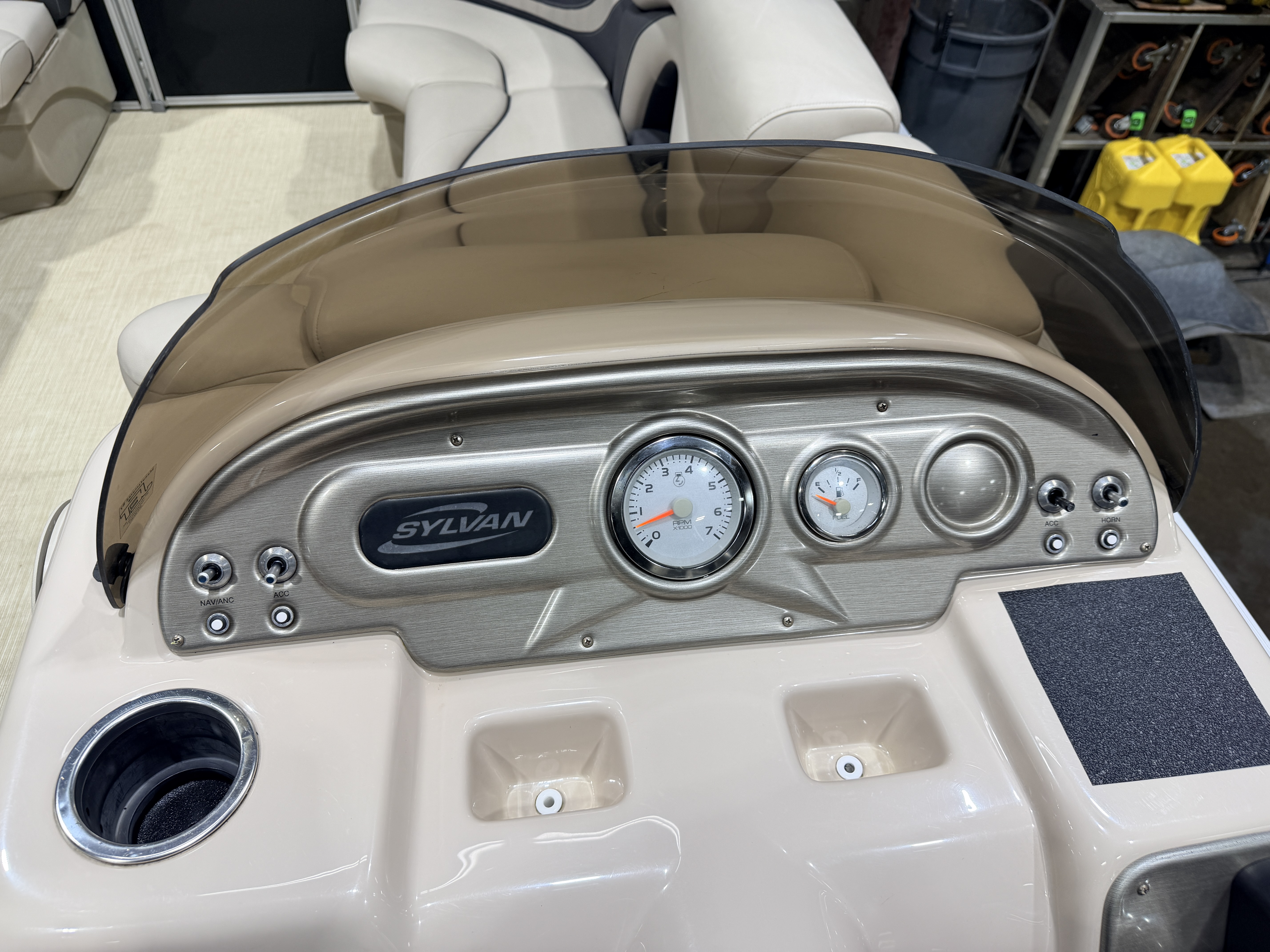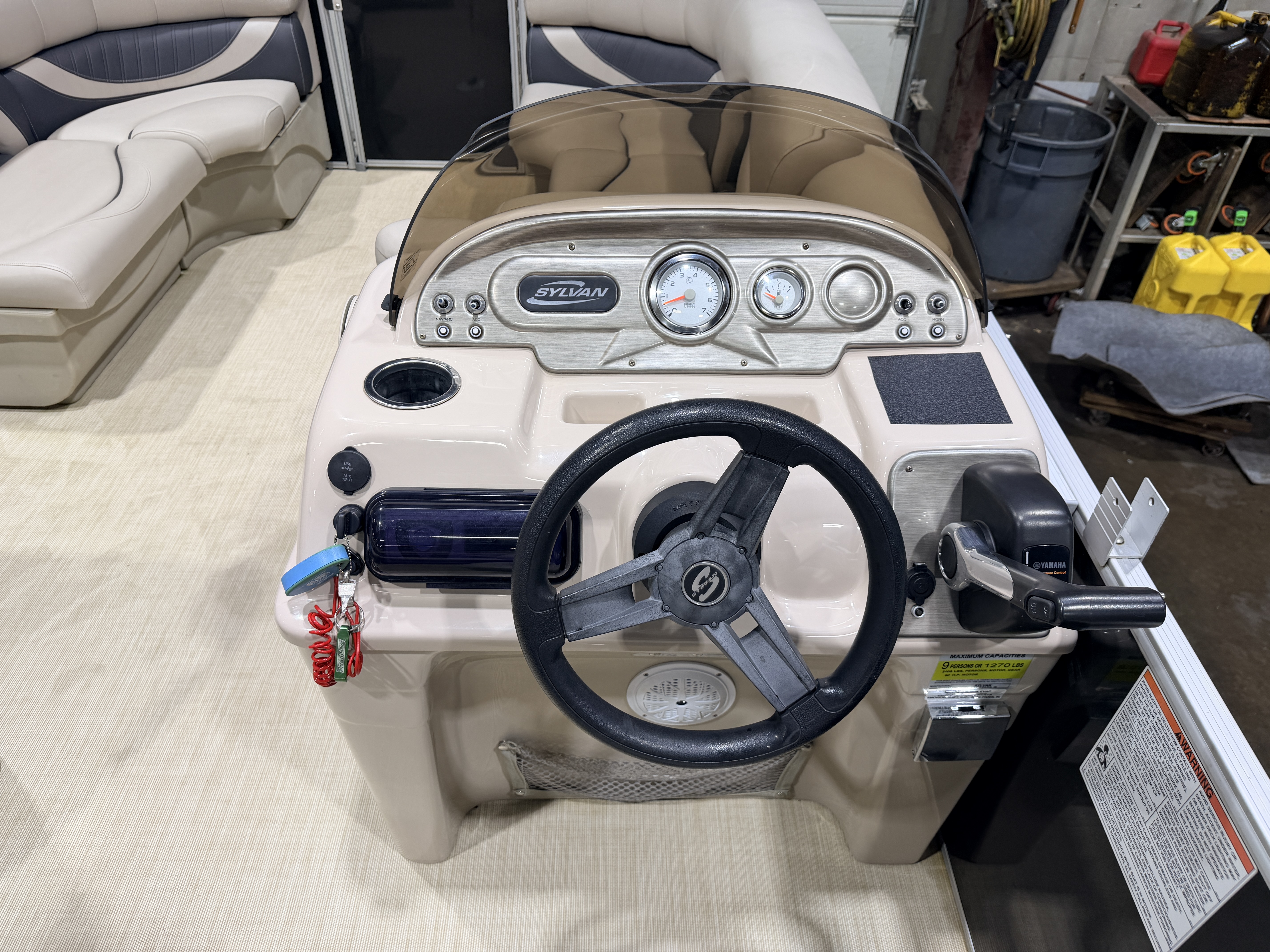 2015 Sylvan Mirage 820 Cruise Special Edition Pontoon with 50HP Yamaha Fourstroke EFI Outboard. This cruise model pontoon features a "Special Edition" package which includes all vinyl flooring along with 2 table bases so you can mount the table in front or in the rear. There are 2 couches up front with an L-shaped couch amidships. The L couch is backed up by a sundeck. The helm features a Tachometer and Fuel gauge. There is a . The captain's chair is a low back sport seat with swivel and slide functions with fold up arm rests. There is a Pyle Bluetooth audio stereo system with additional USB, SD card and auxiliary inputs. The front end of the L-shaped couch has a large storage compartment which could accommodate a cooler. There is a rear swim platform with fold down swim ladder. This Sylvan pontoon features a bimini top, stainless steel cleats, and LED docking lights.
