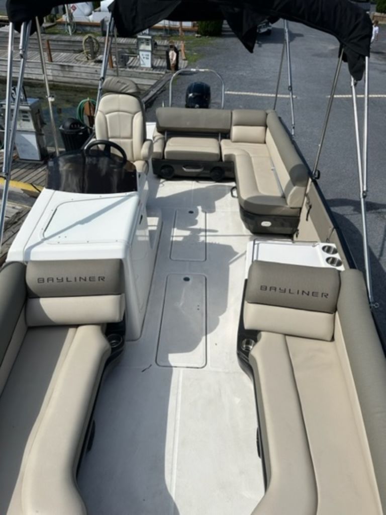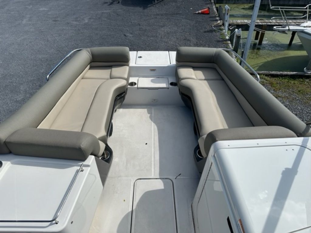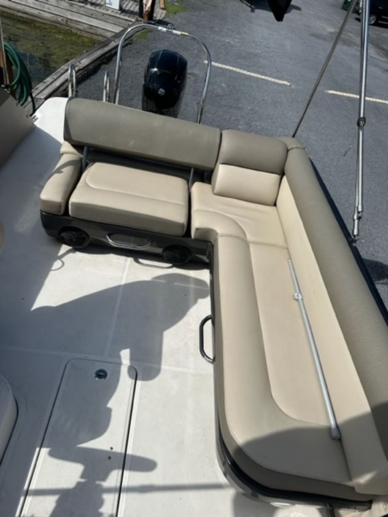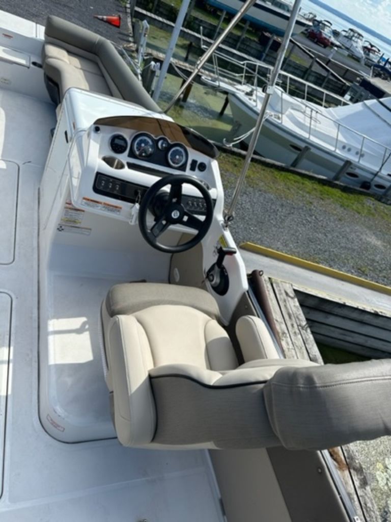 This baby combines the best of both the pontoon world and the fiberglass world. Very low hours, and the boat is in fantastic shape.
