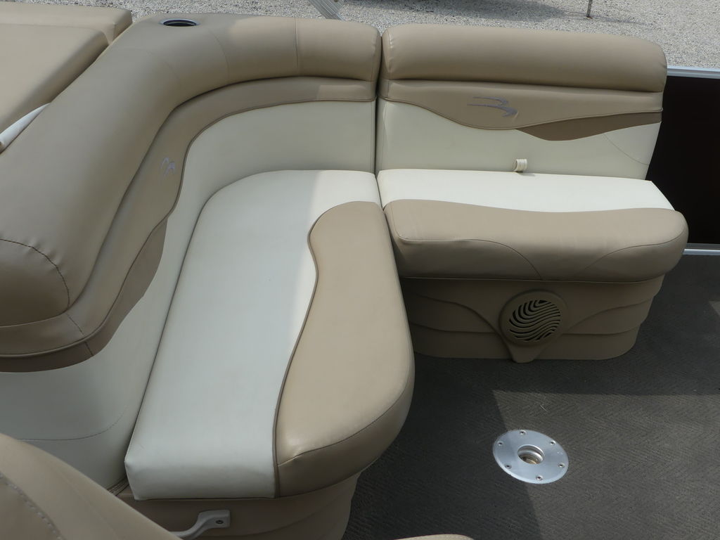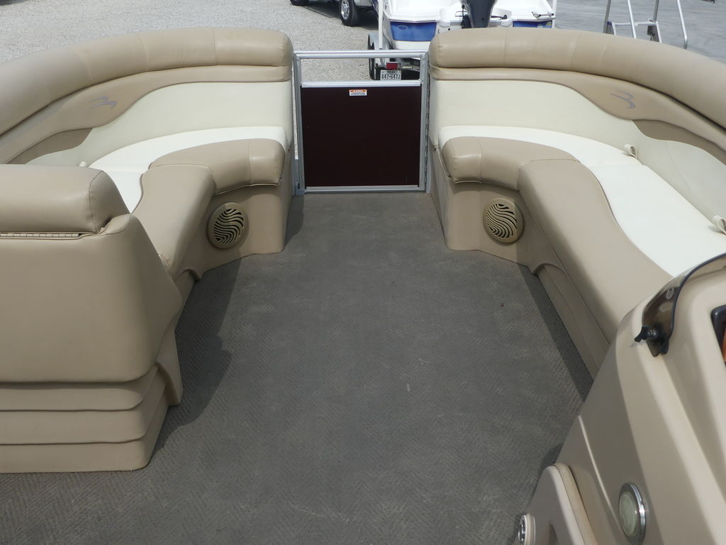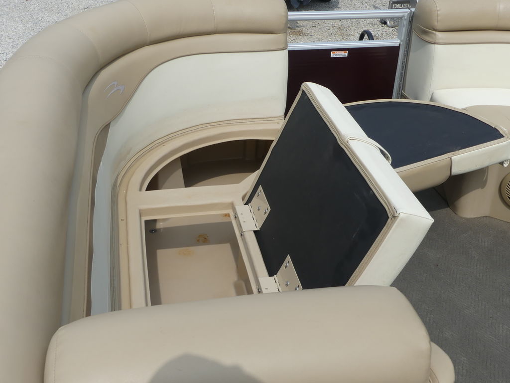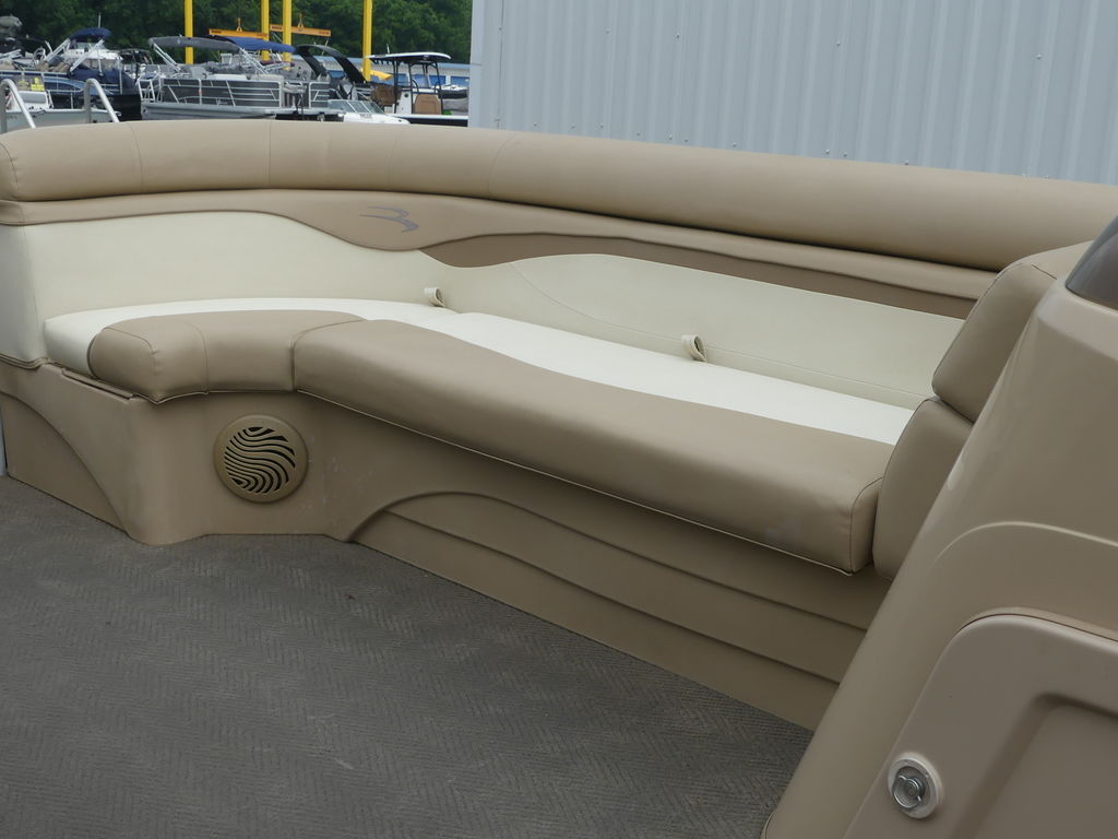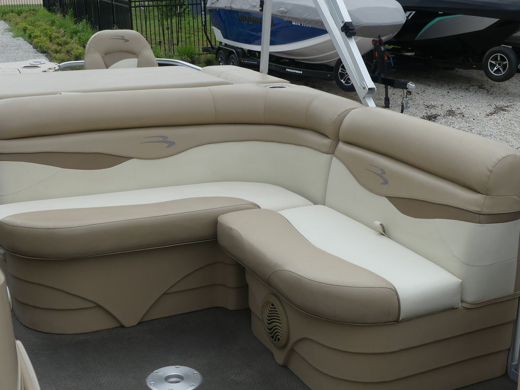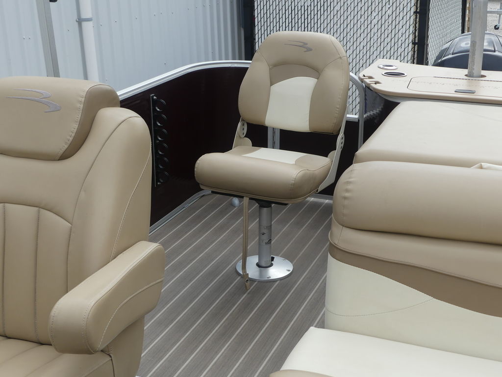 Bennington’s durable construction includes twin pontoons, a strong deck structure, and premium upholstery designed for long-lasting use. Standard features often include a Bimini top for shade, helm captain’s chair, cockpit table, and ample storage throughout the boat.