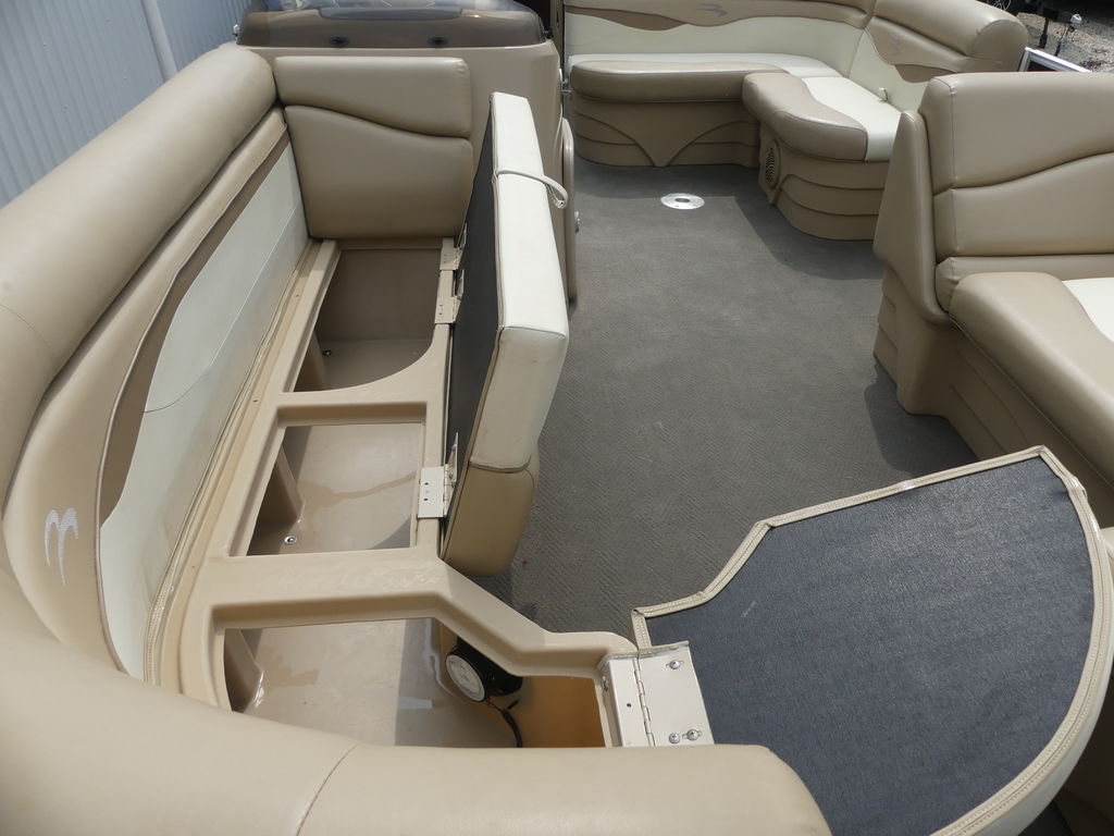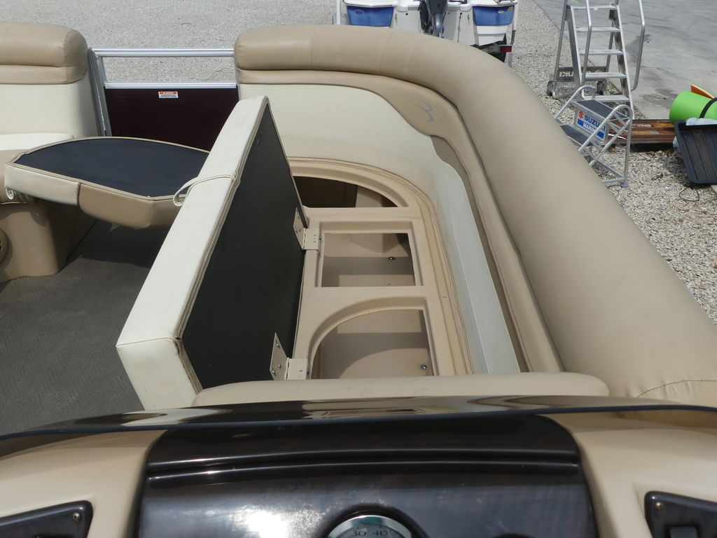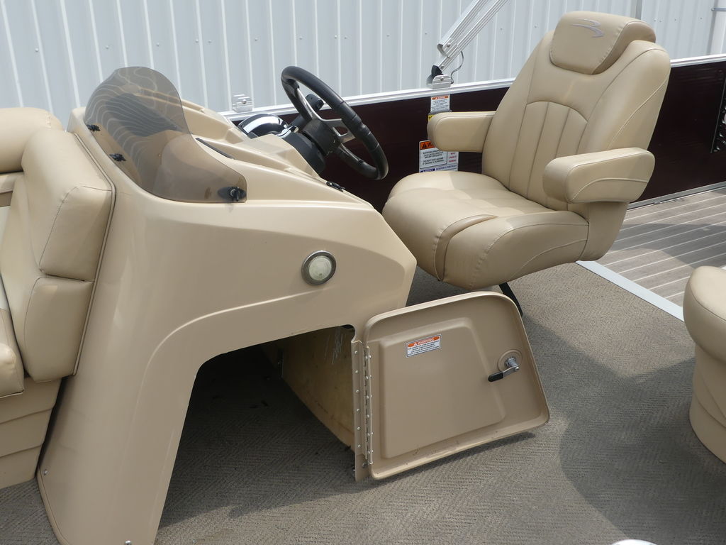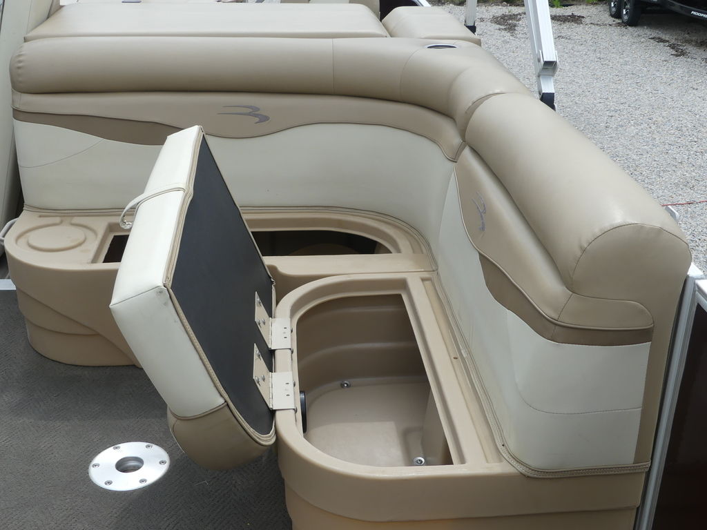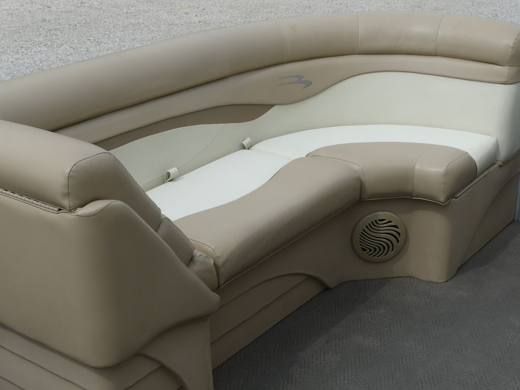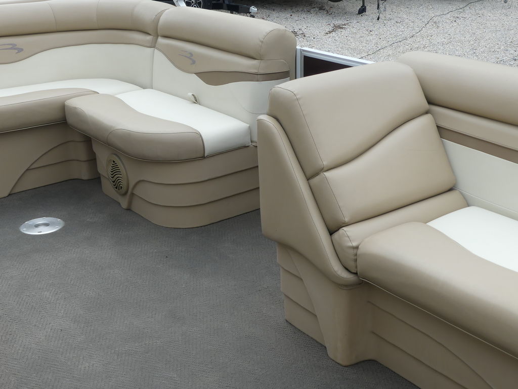 Bennington’s durable construction includes twin pontoons, a strong deck structure, and premium upholstery designed for long-lasting use. Standard features often include a Bimini top for shade, helm captain’s chair, cockpit table, and ample storage throughout the boat.